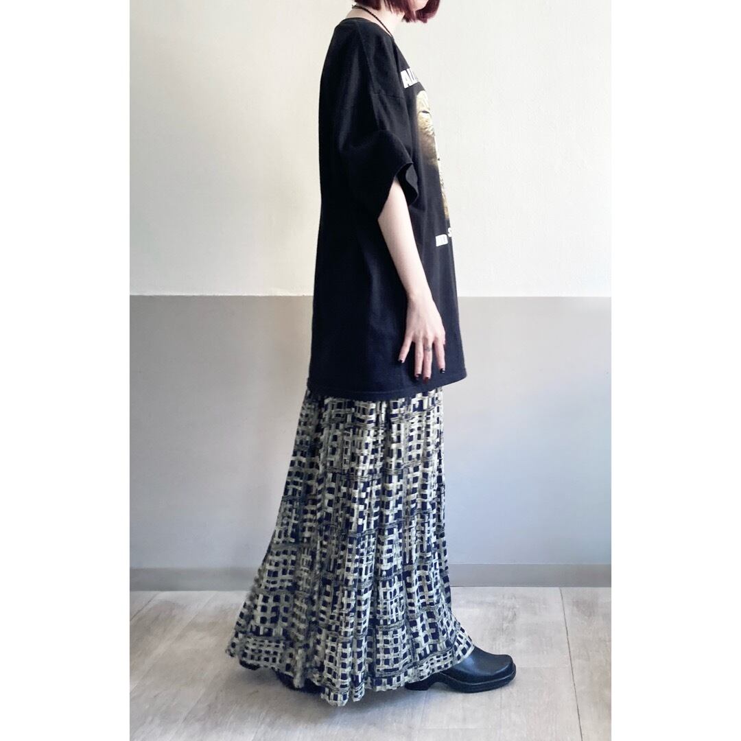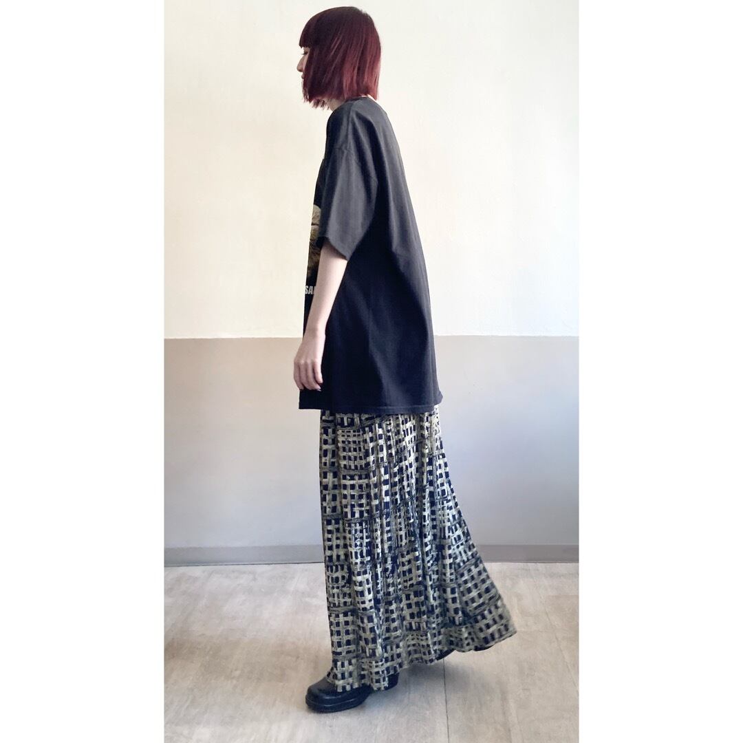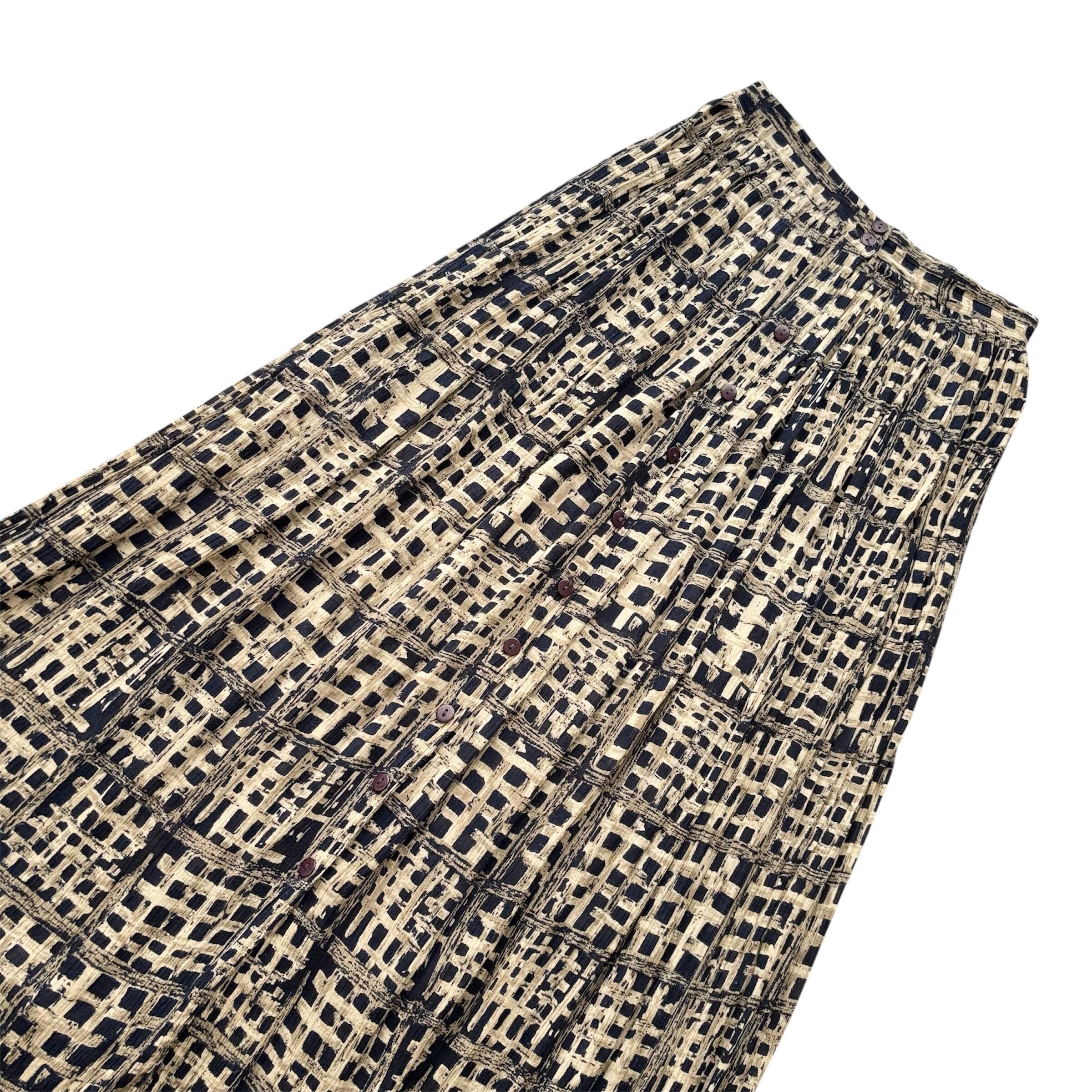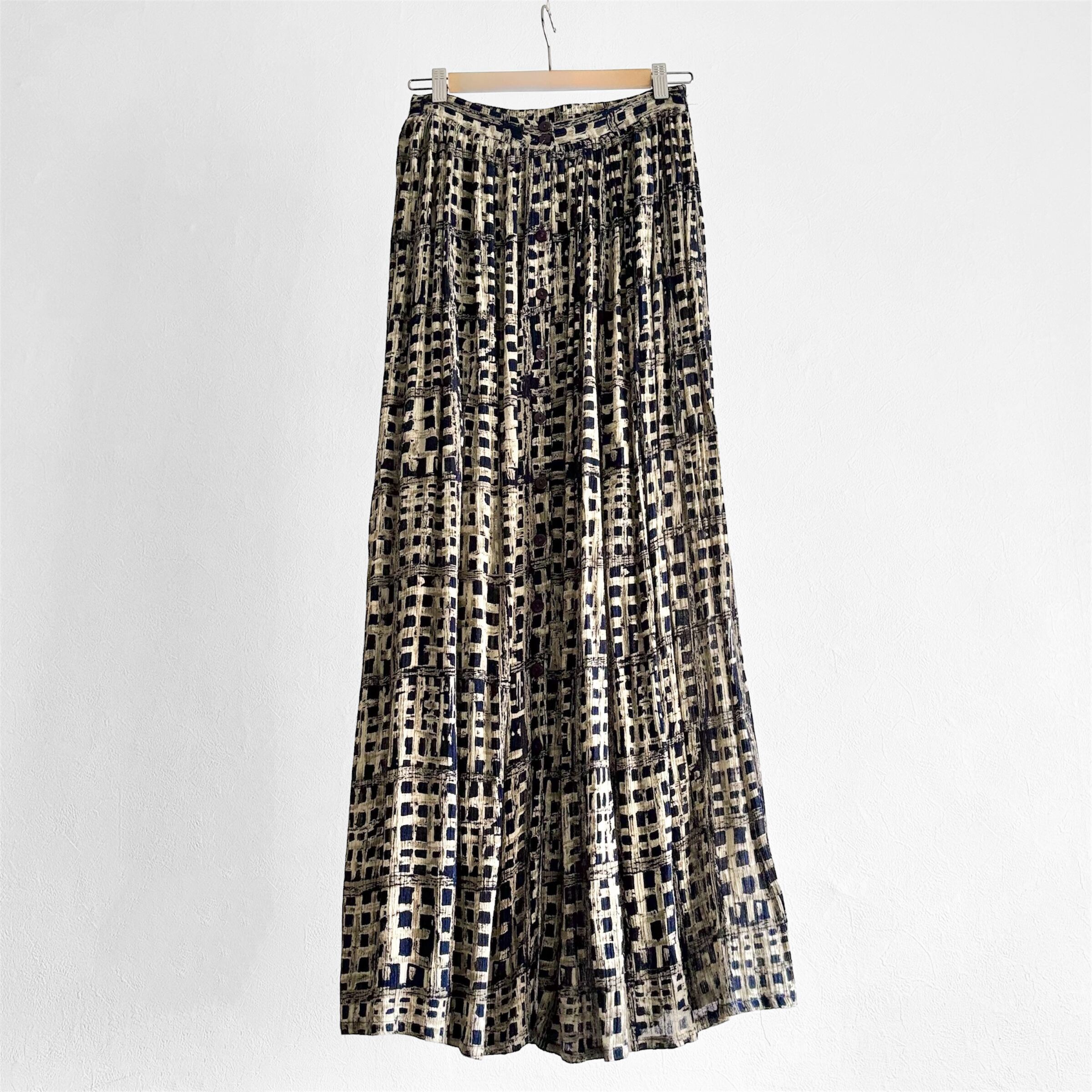 バスケットの格子のようなプリミティブな柄が趣あるロングスカート。
