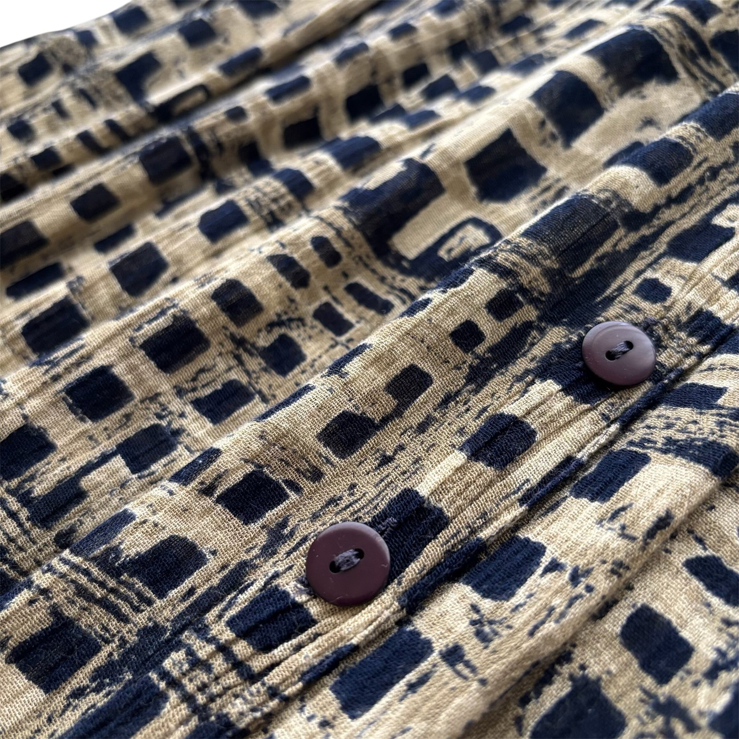 フロントボタン開きで、生地にマッチしたパープルカラーのボタンが並んでいます。