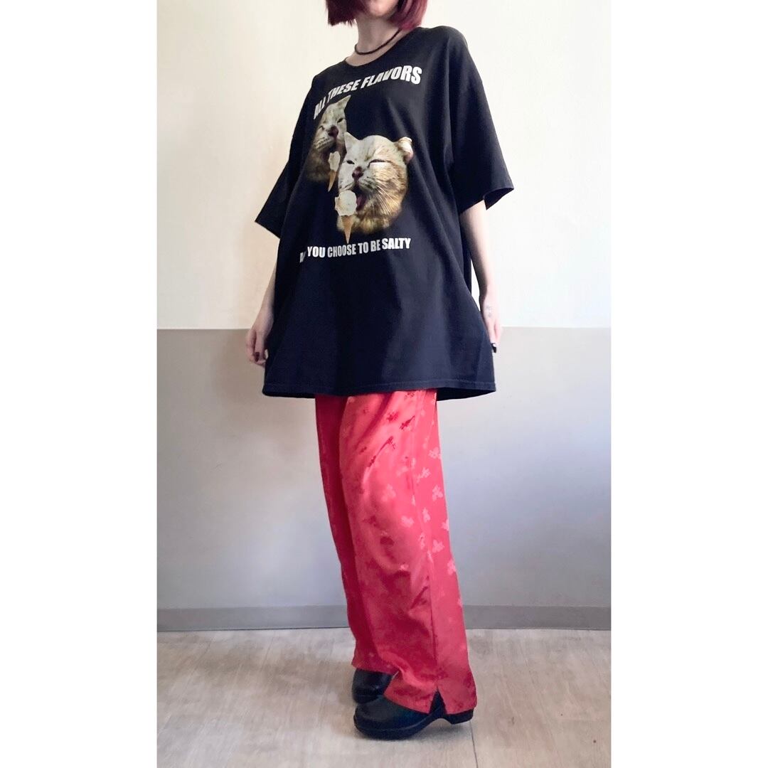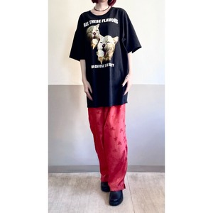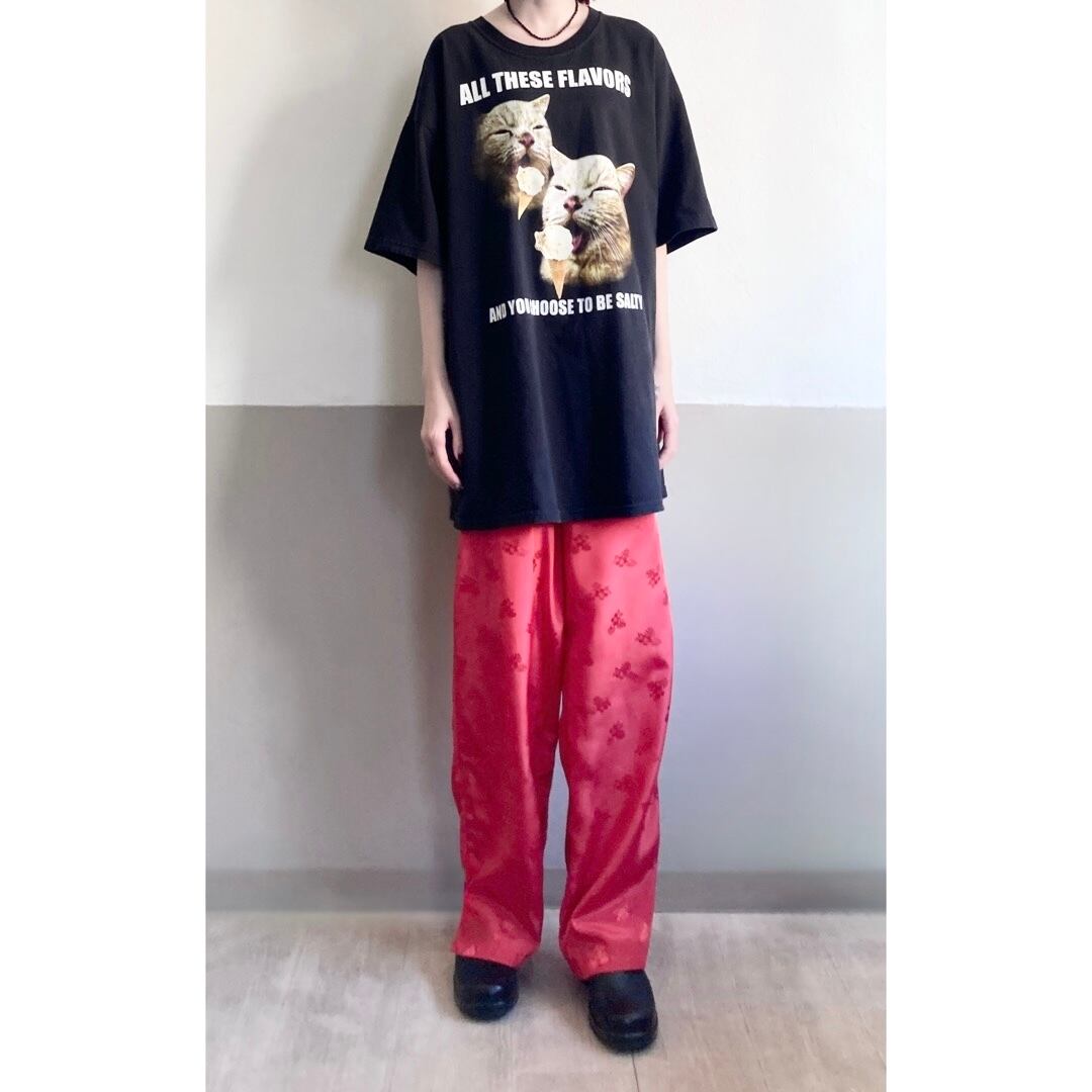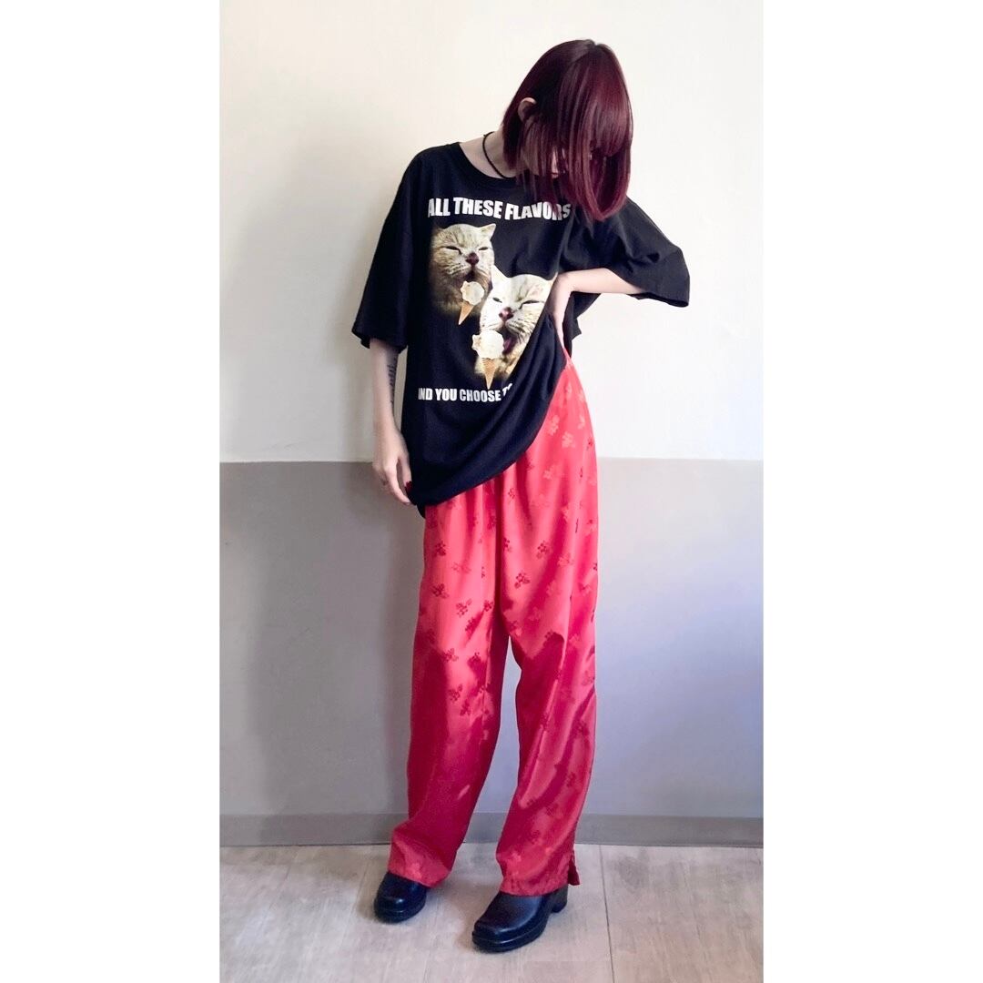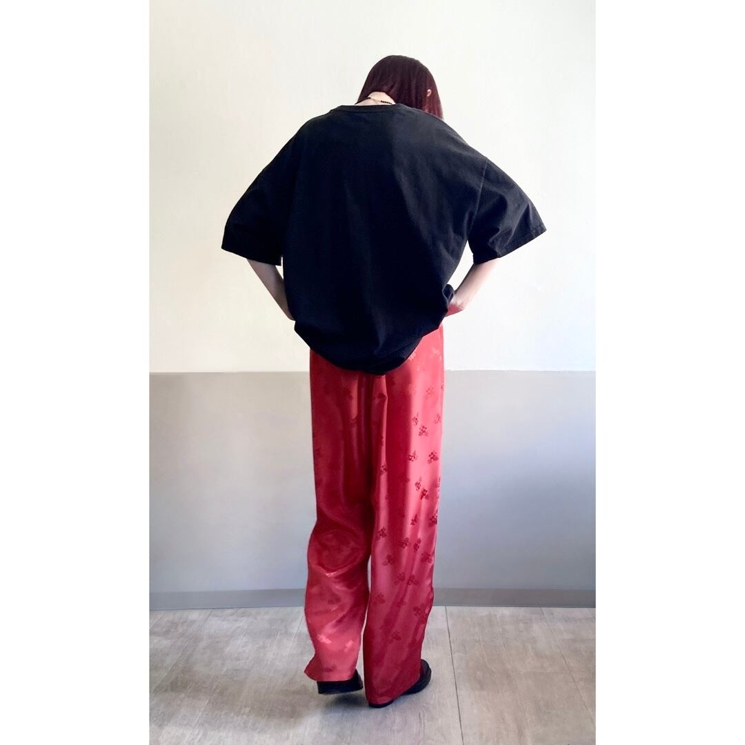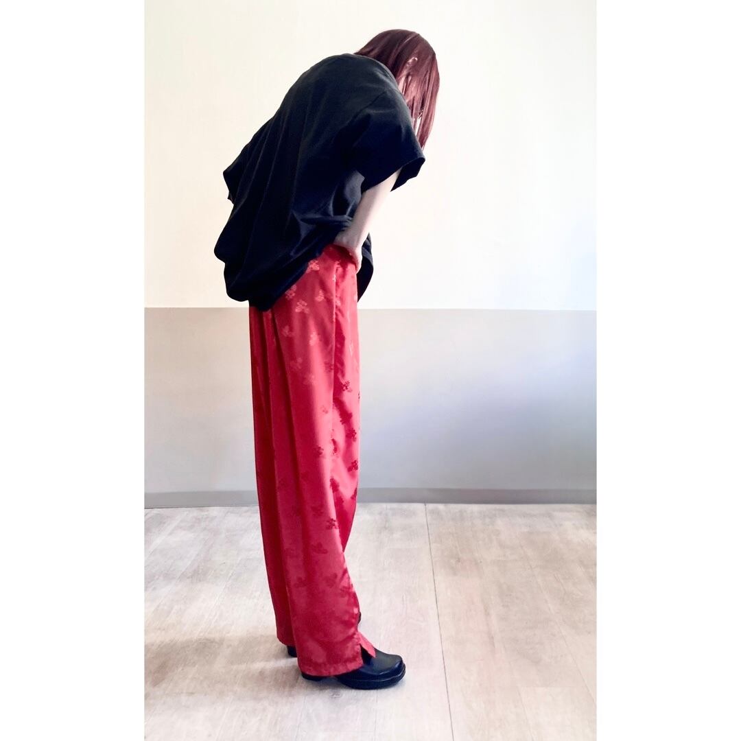 光沢と発色良いレッドカラーが印象的なサテンパンツ。