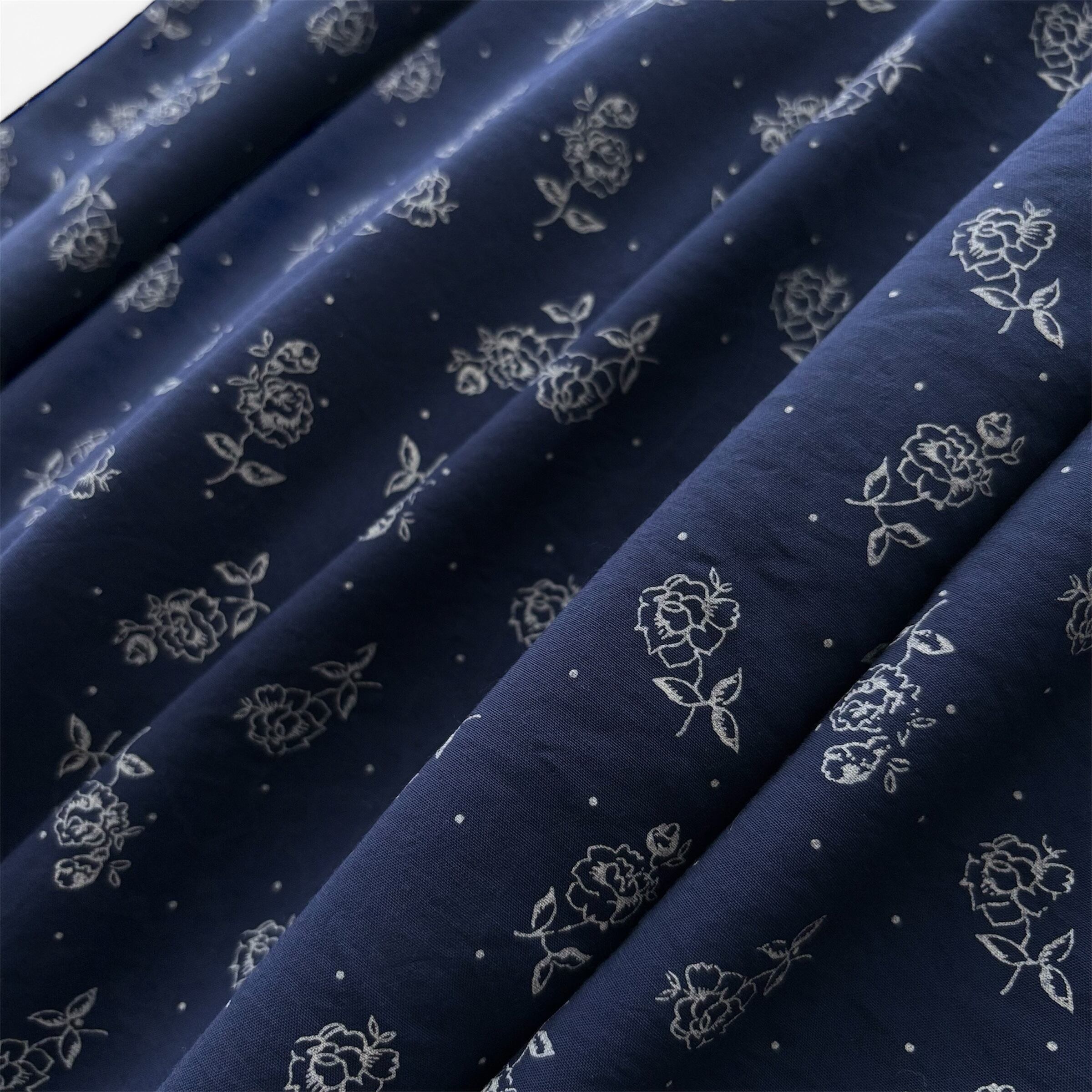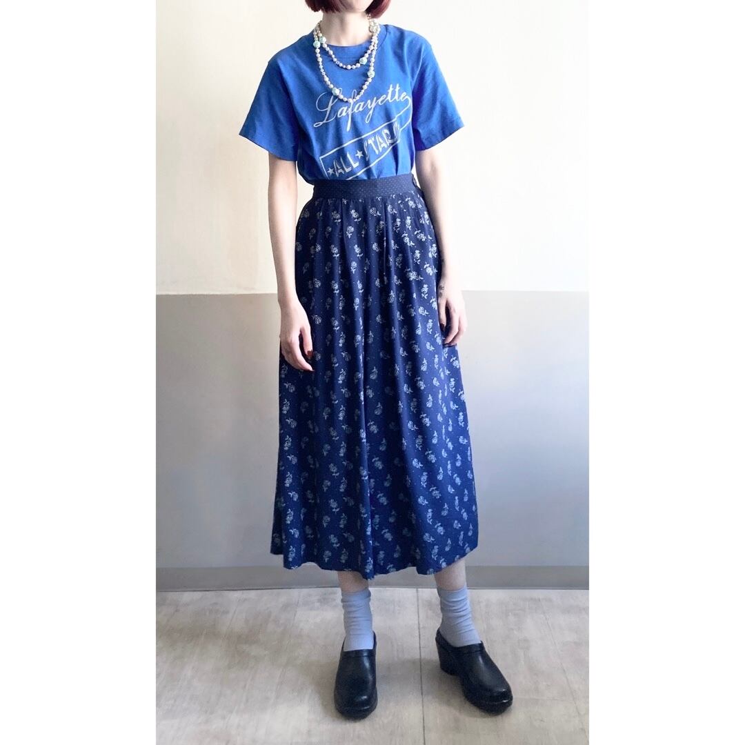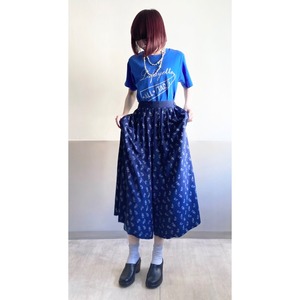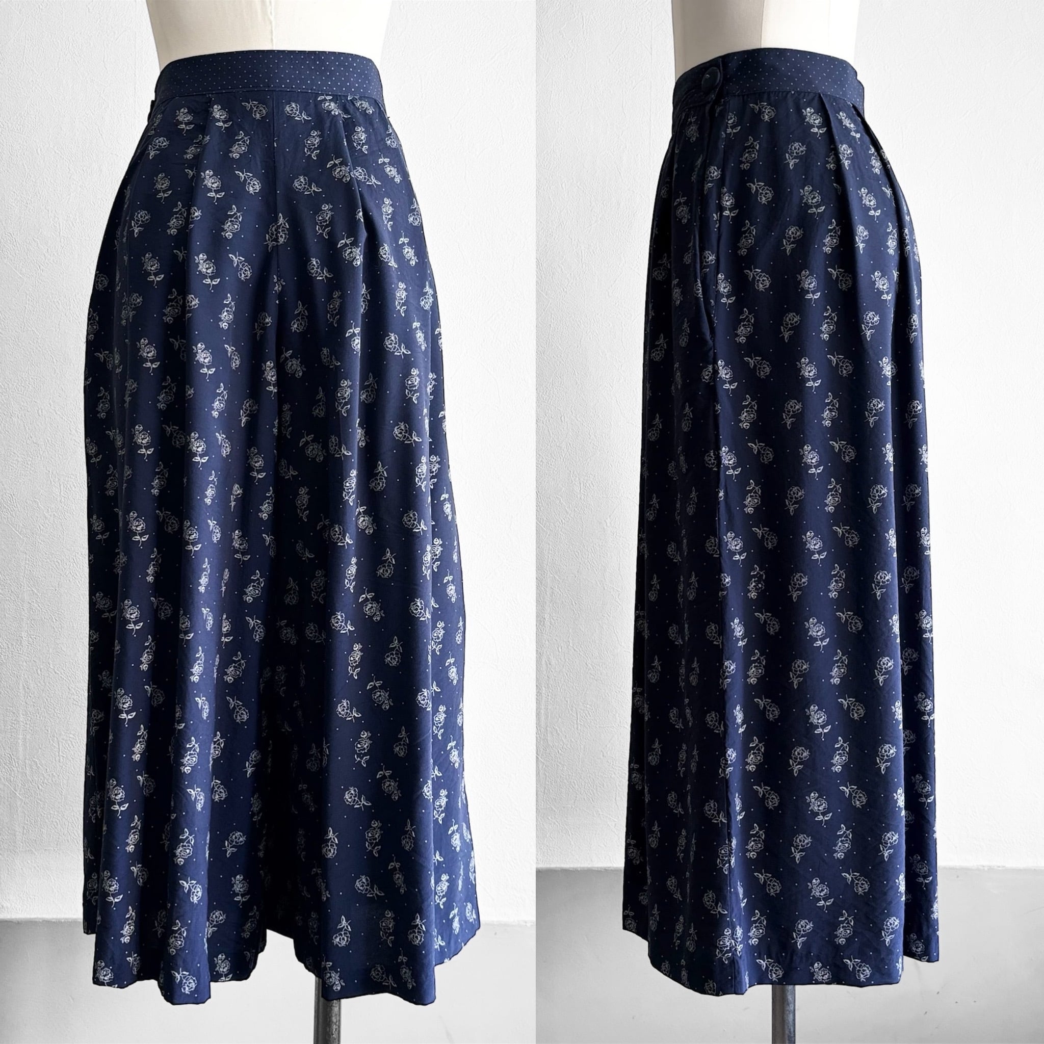 ネイビーカラーをベースに、細かなドットとフラワーモチーフがプリントされたキュロットパンツ。