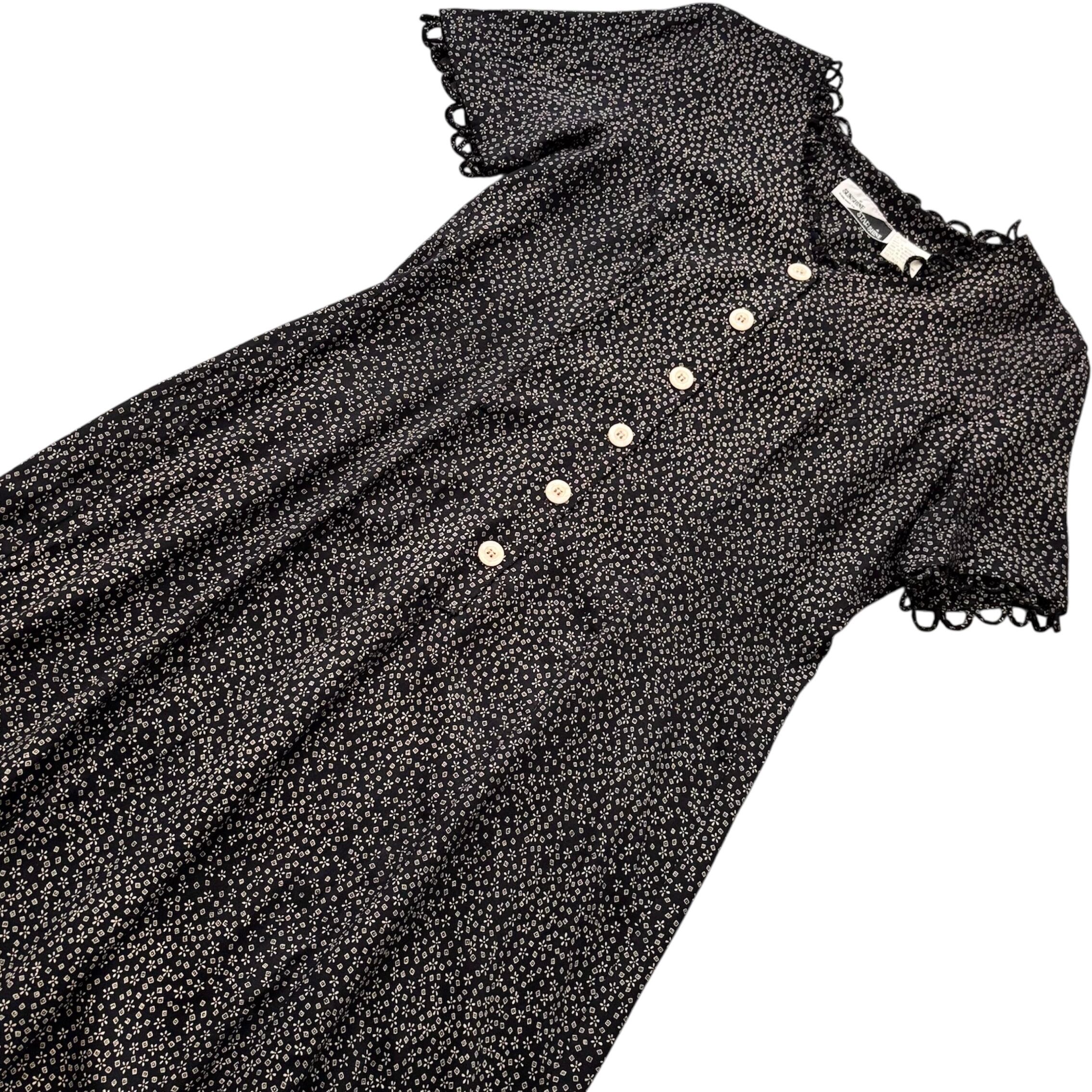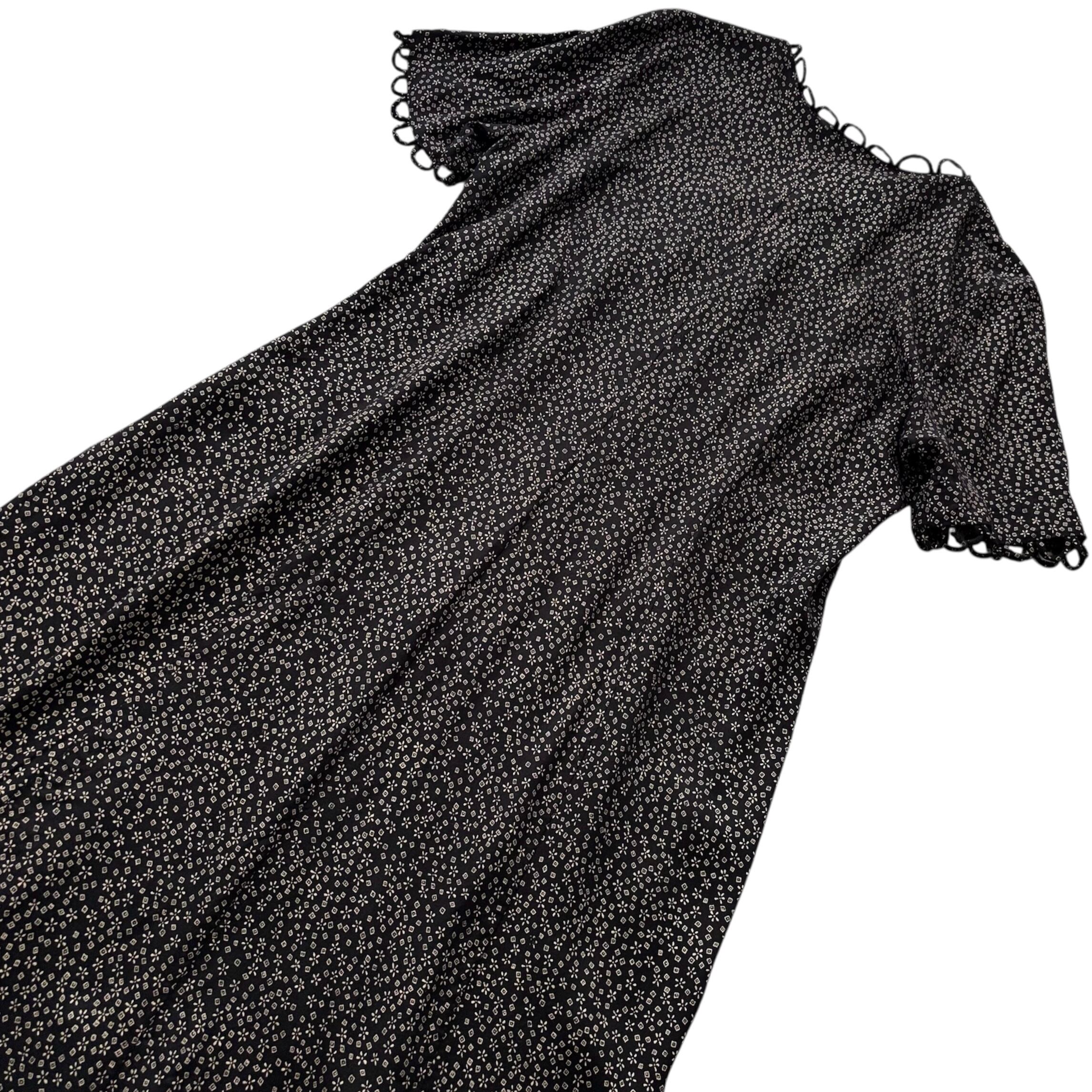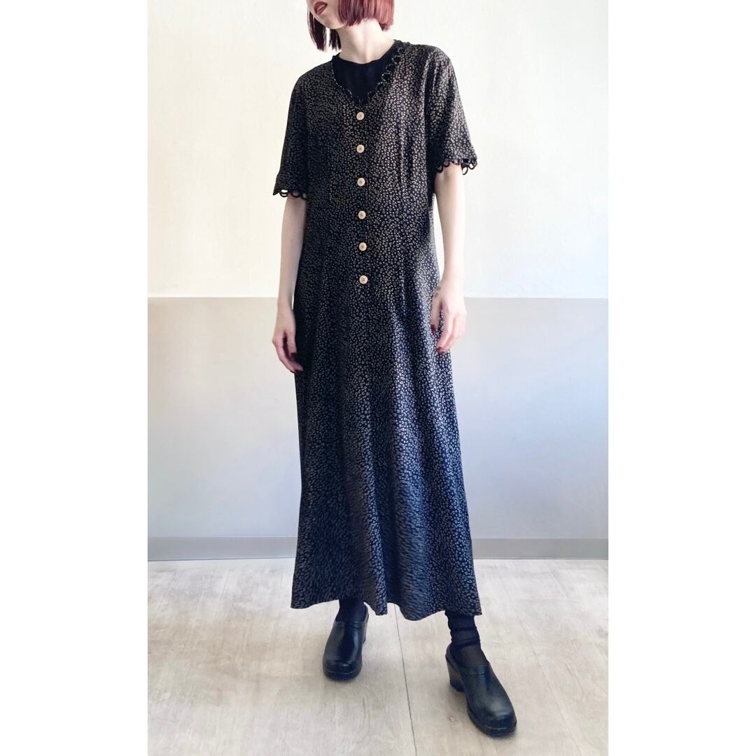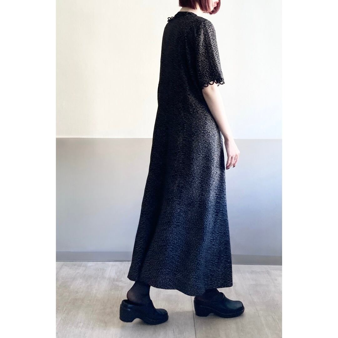 ネックラインと袖口にあしらわれた、共布のループ飾りが特徴的なワンピース。