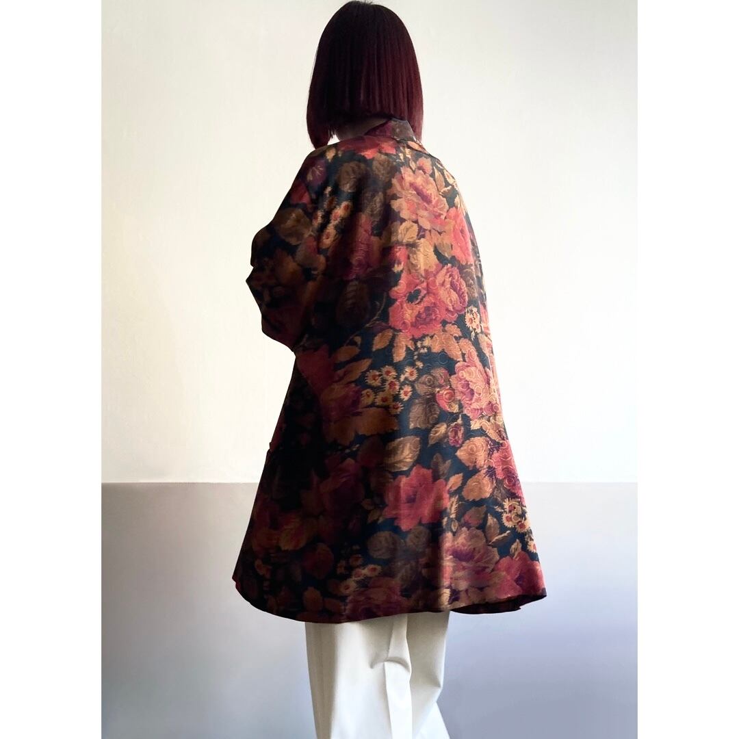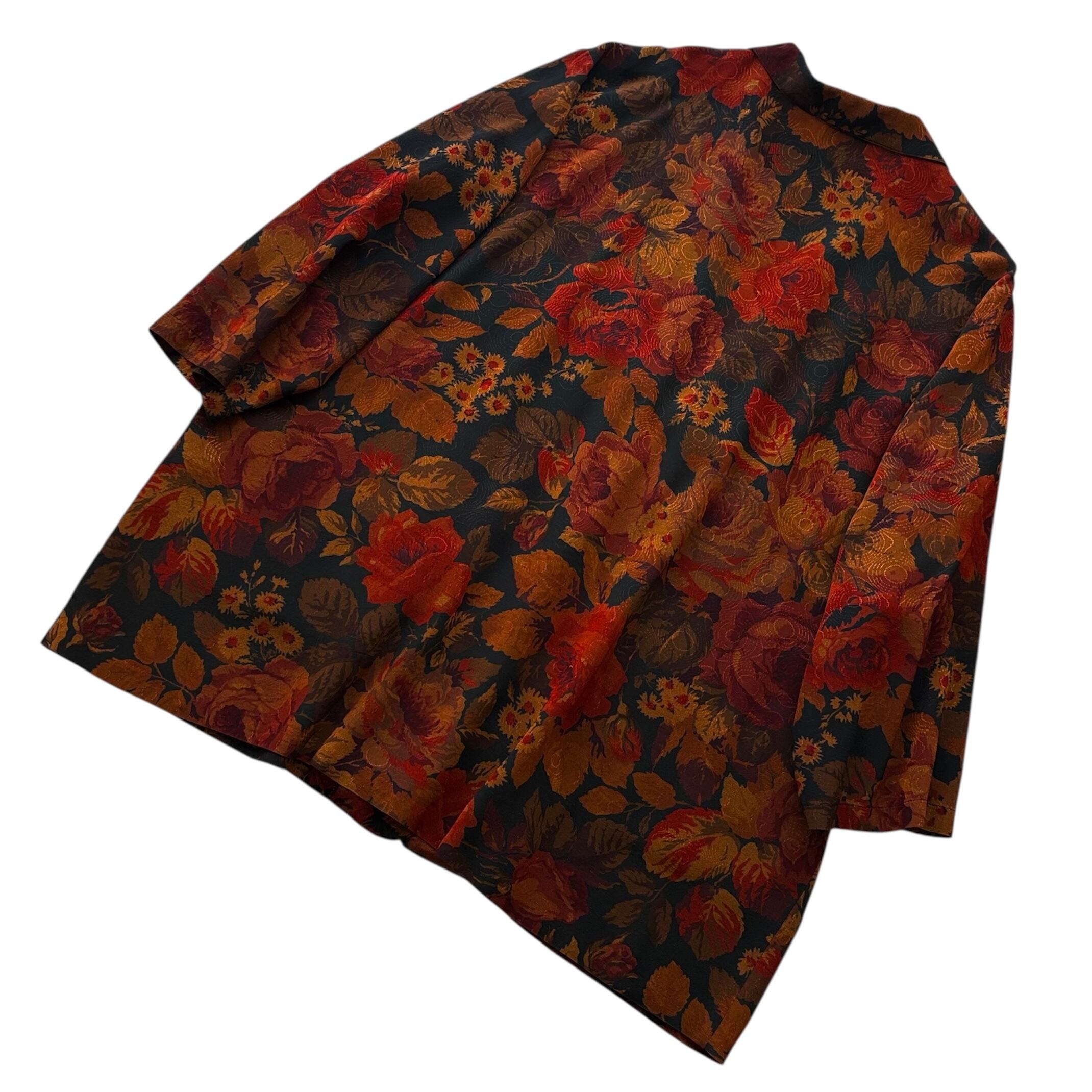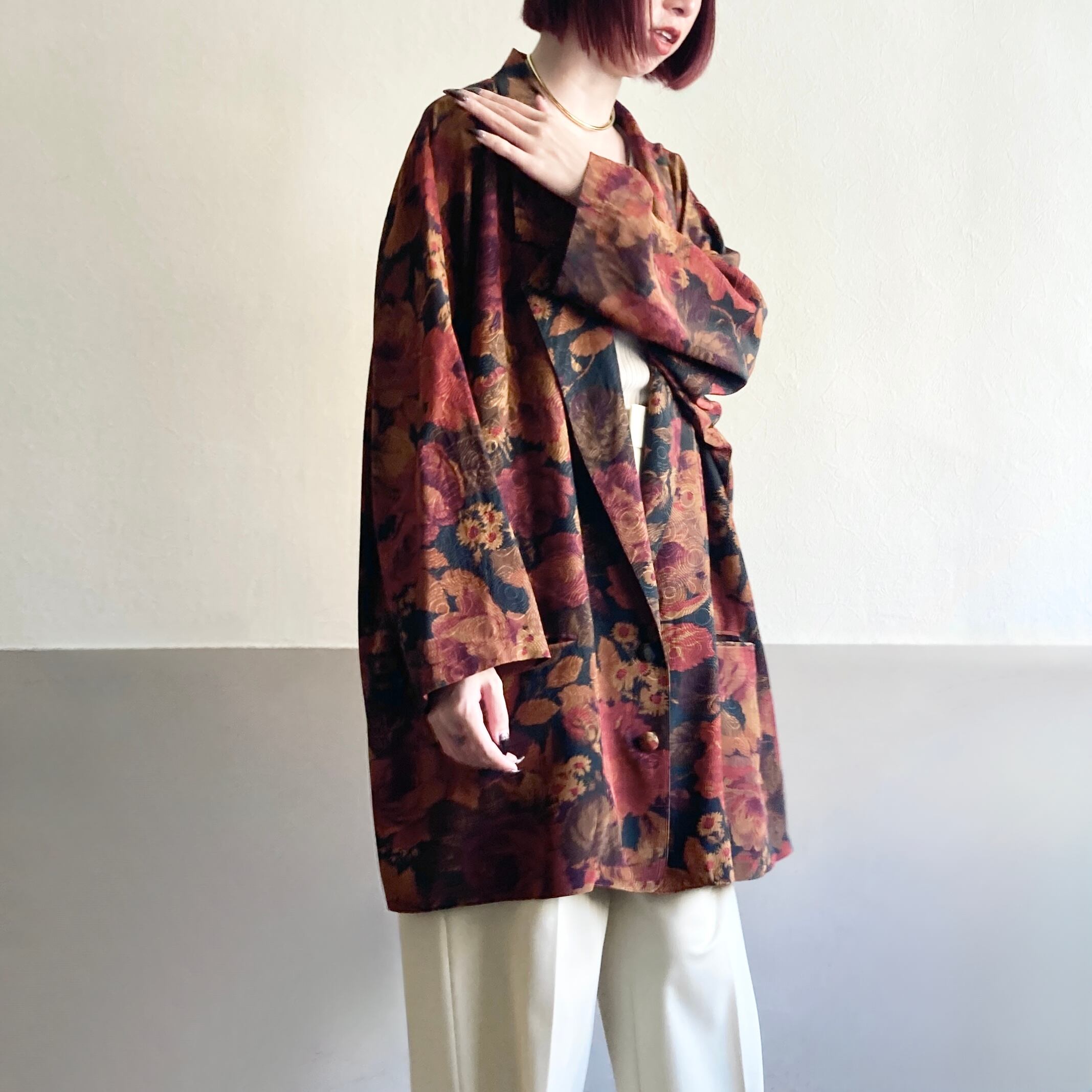 光沢のある円や四角柄のジャカード織物に、クラシカルなボタニカル柄がプリントされた凝った素材感。