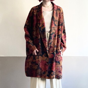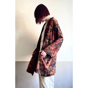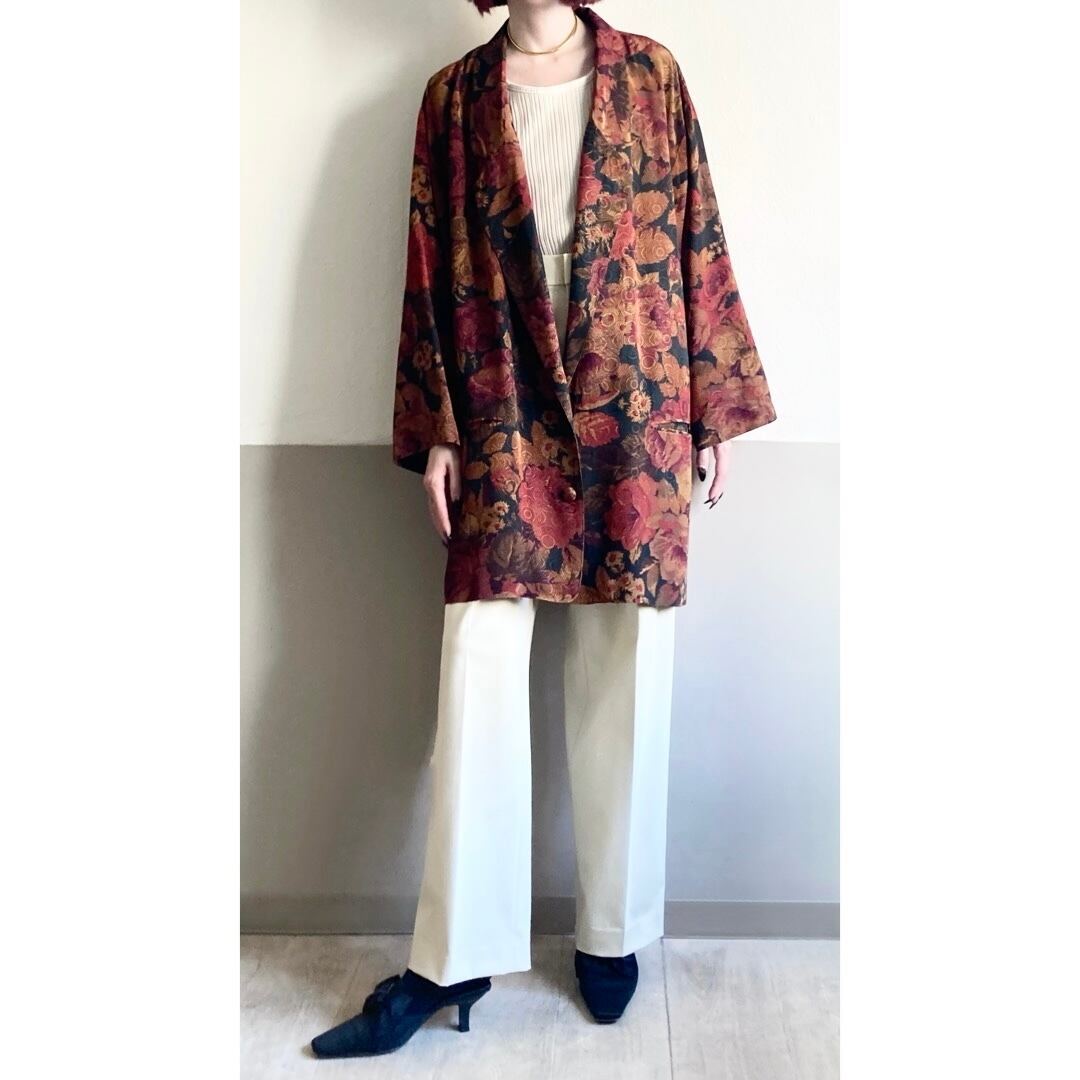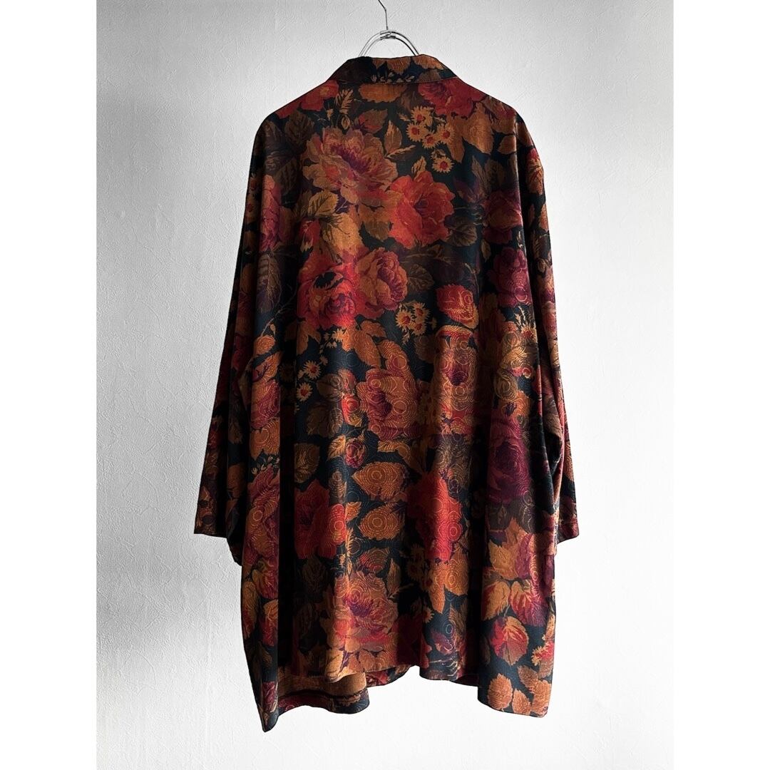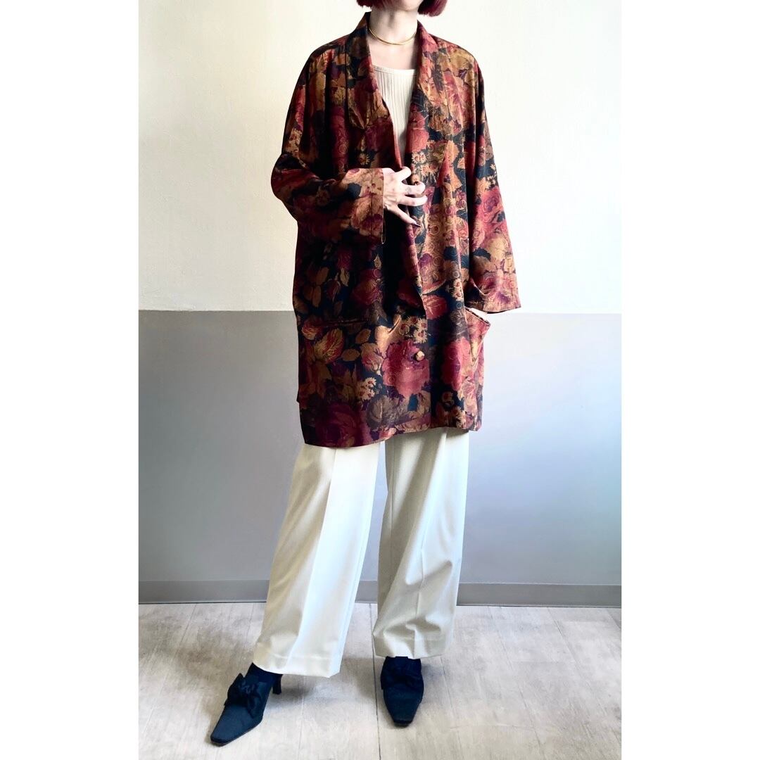 光沢のある円や四角柄のジャカード織物に、クラシカルなボタニカル柄がプリントされた凝った素材感。