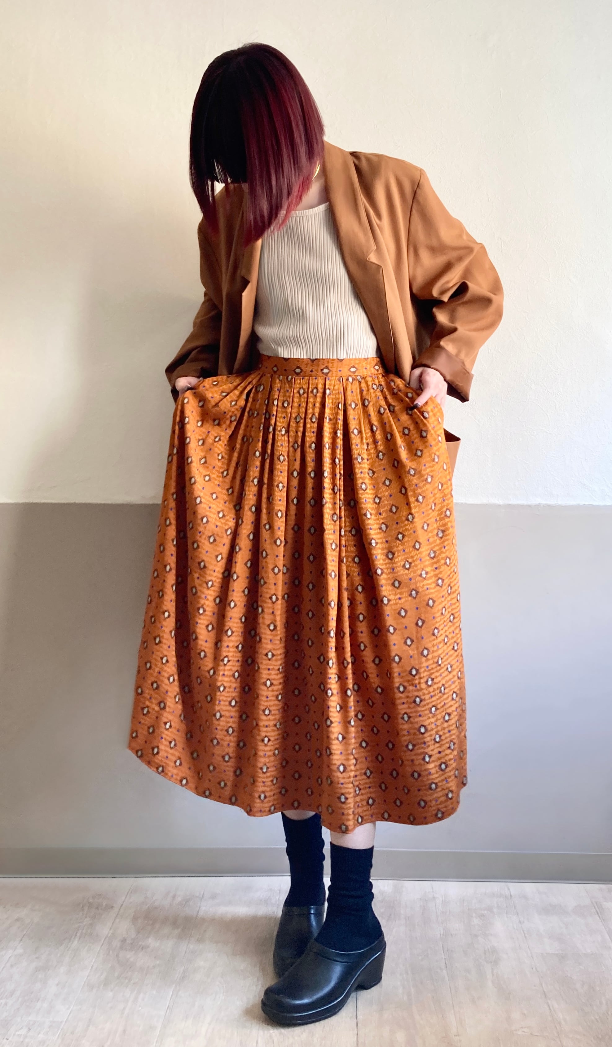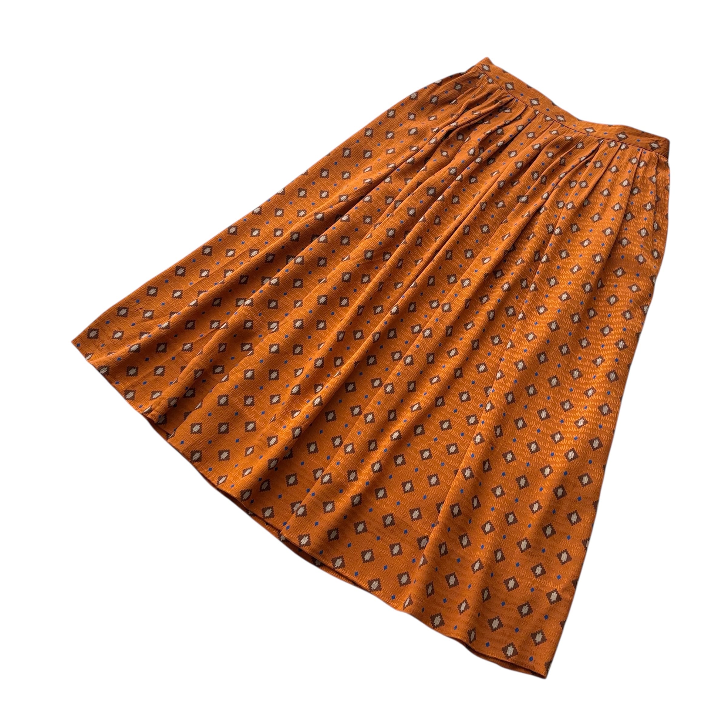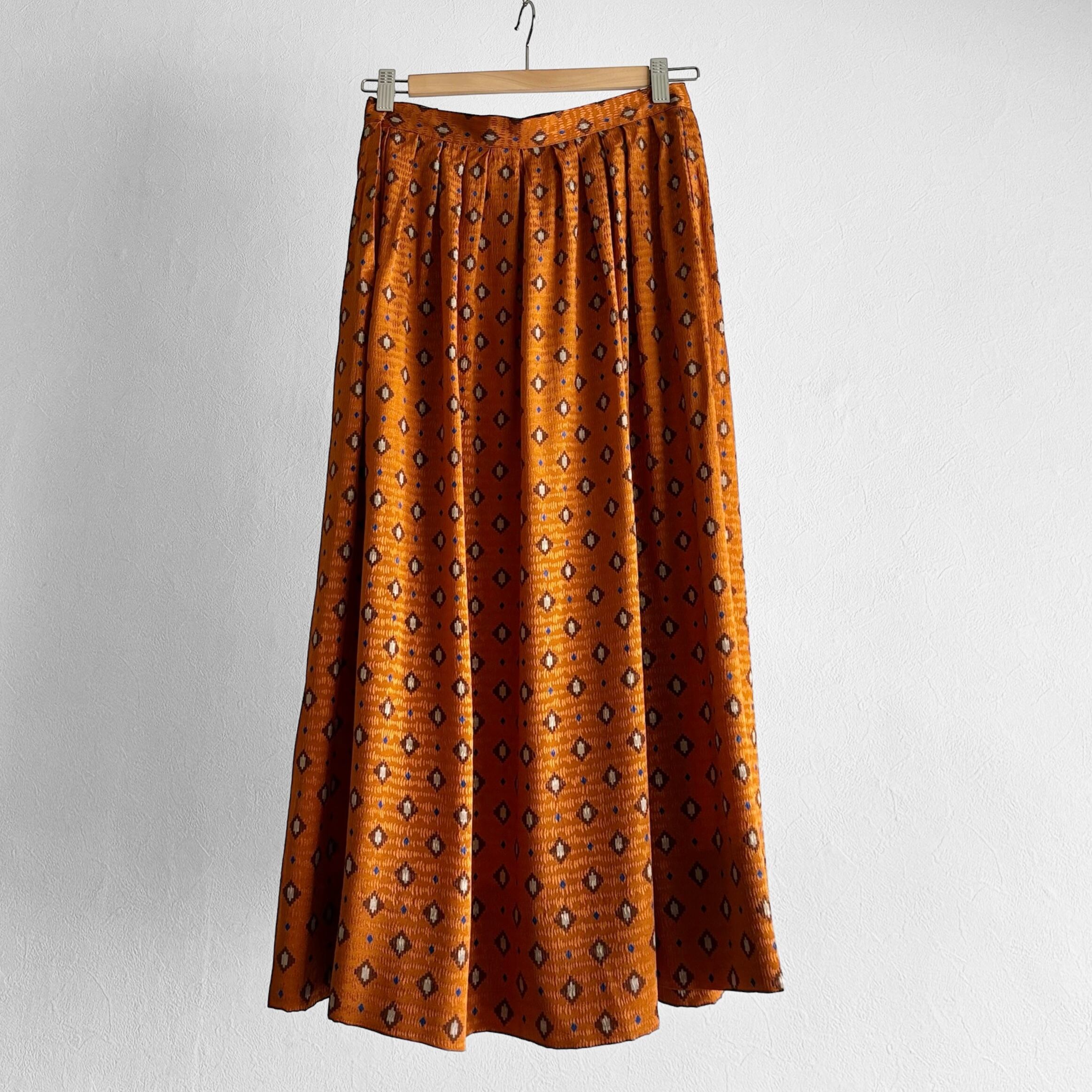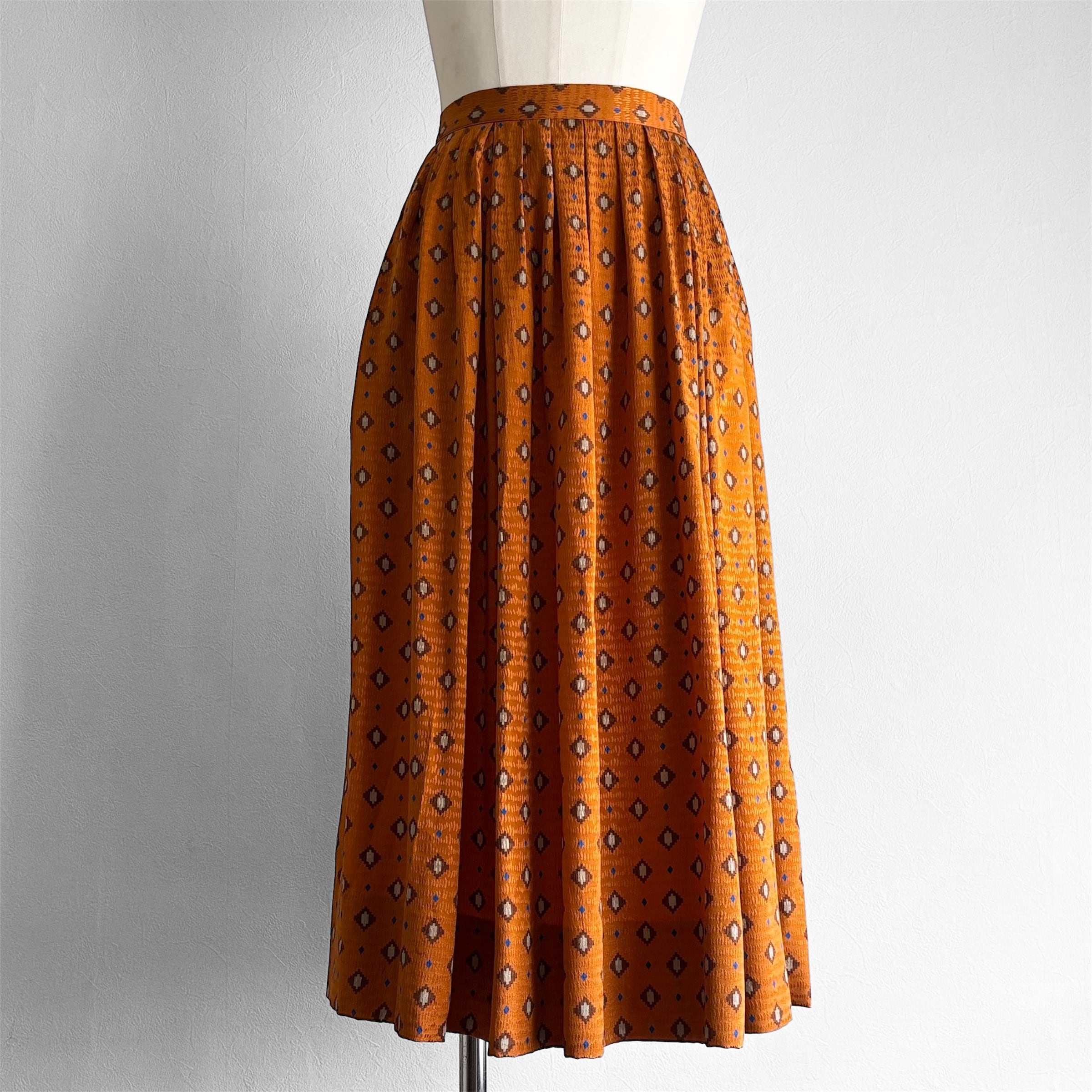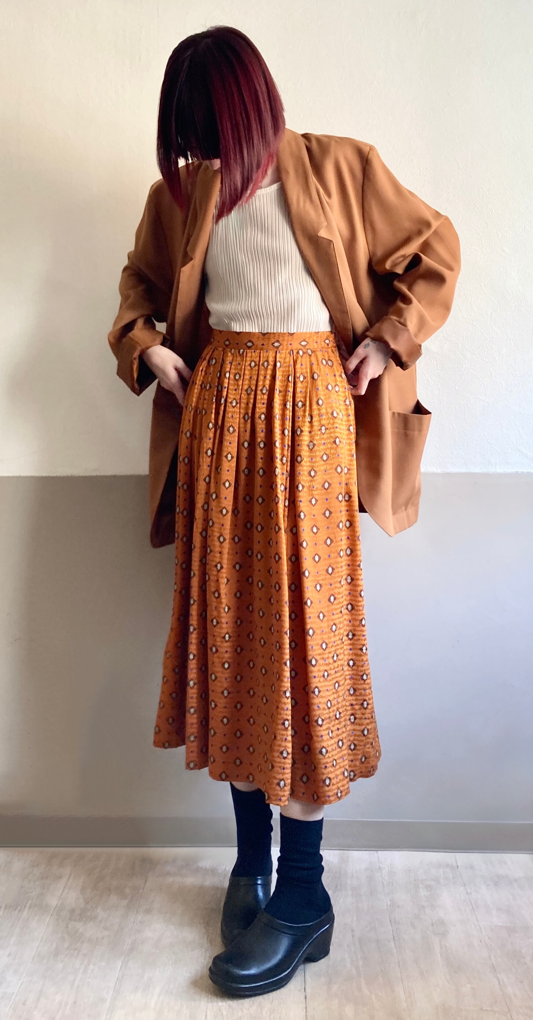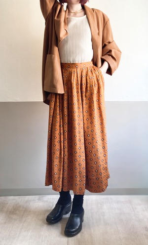 落ち着いた光沢がある素朴な織柄に、プリミティブな幾何学プリントが重ねられた凝った素材感。