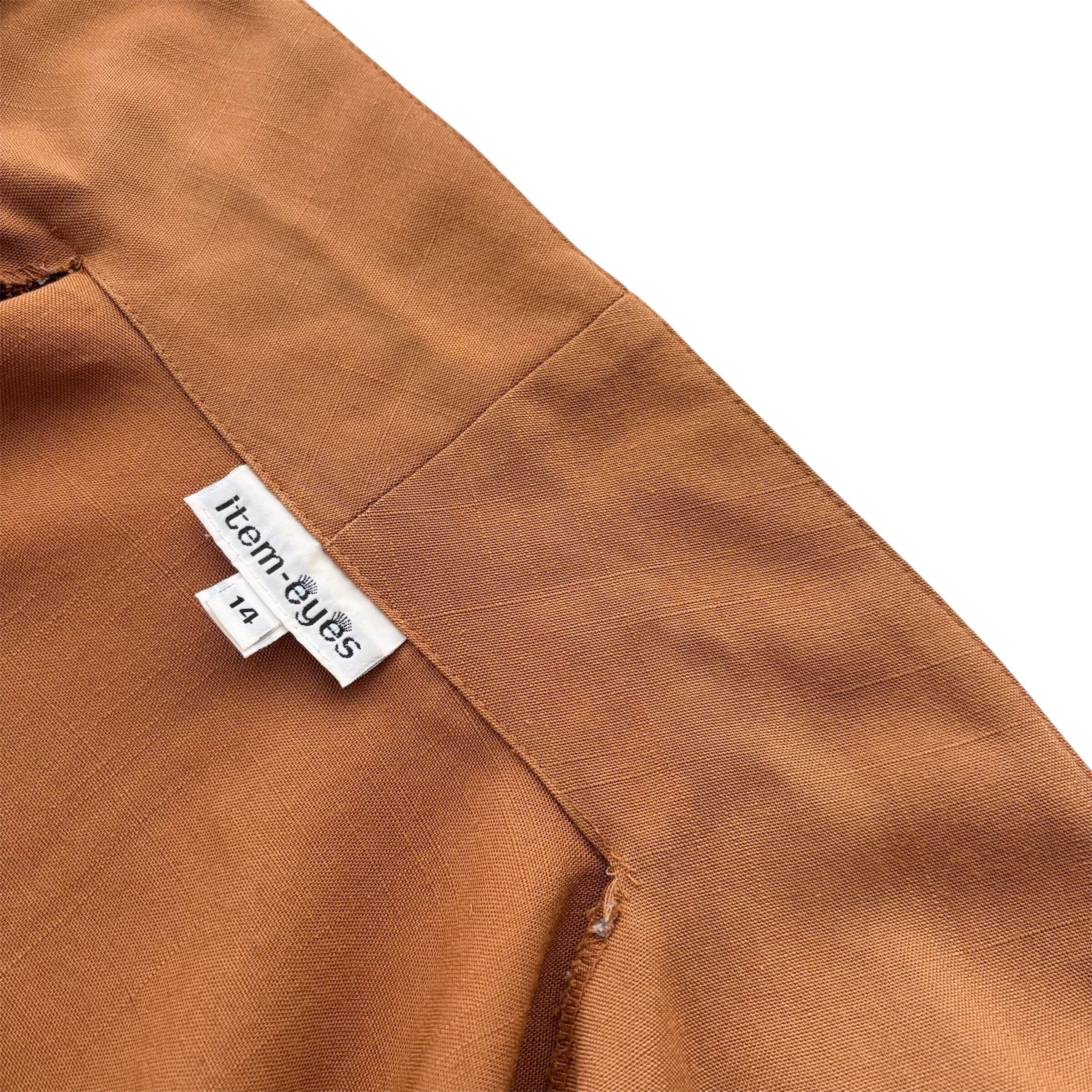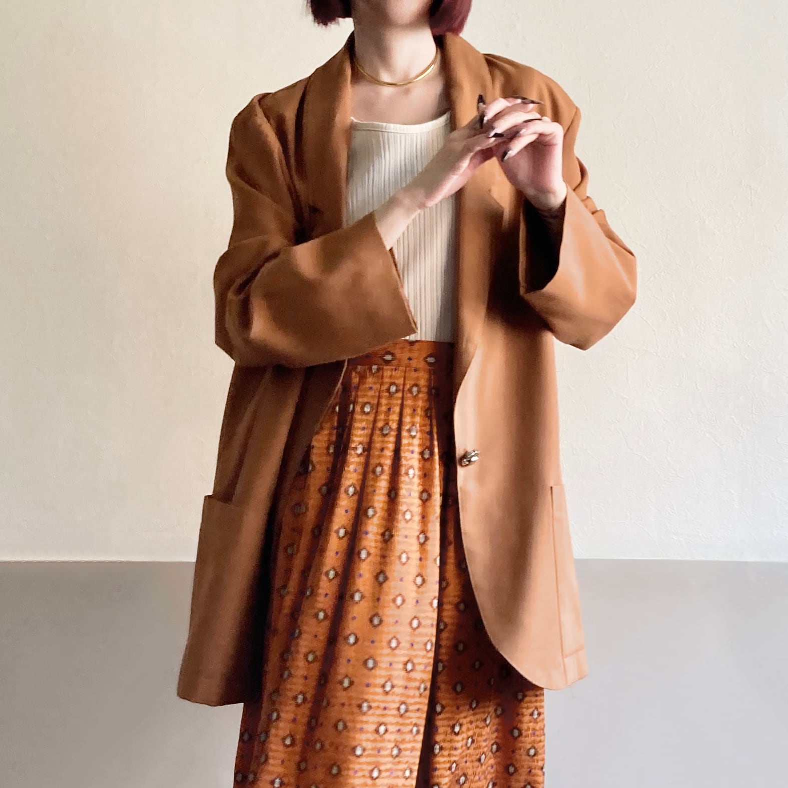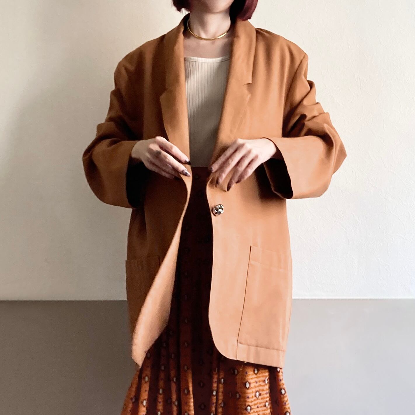 美しいオレンジブラウンが印象的なテイラードジャケット。