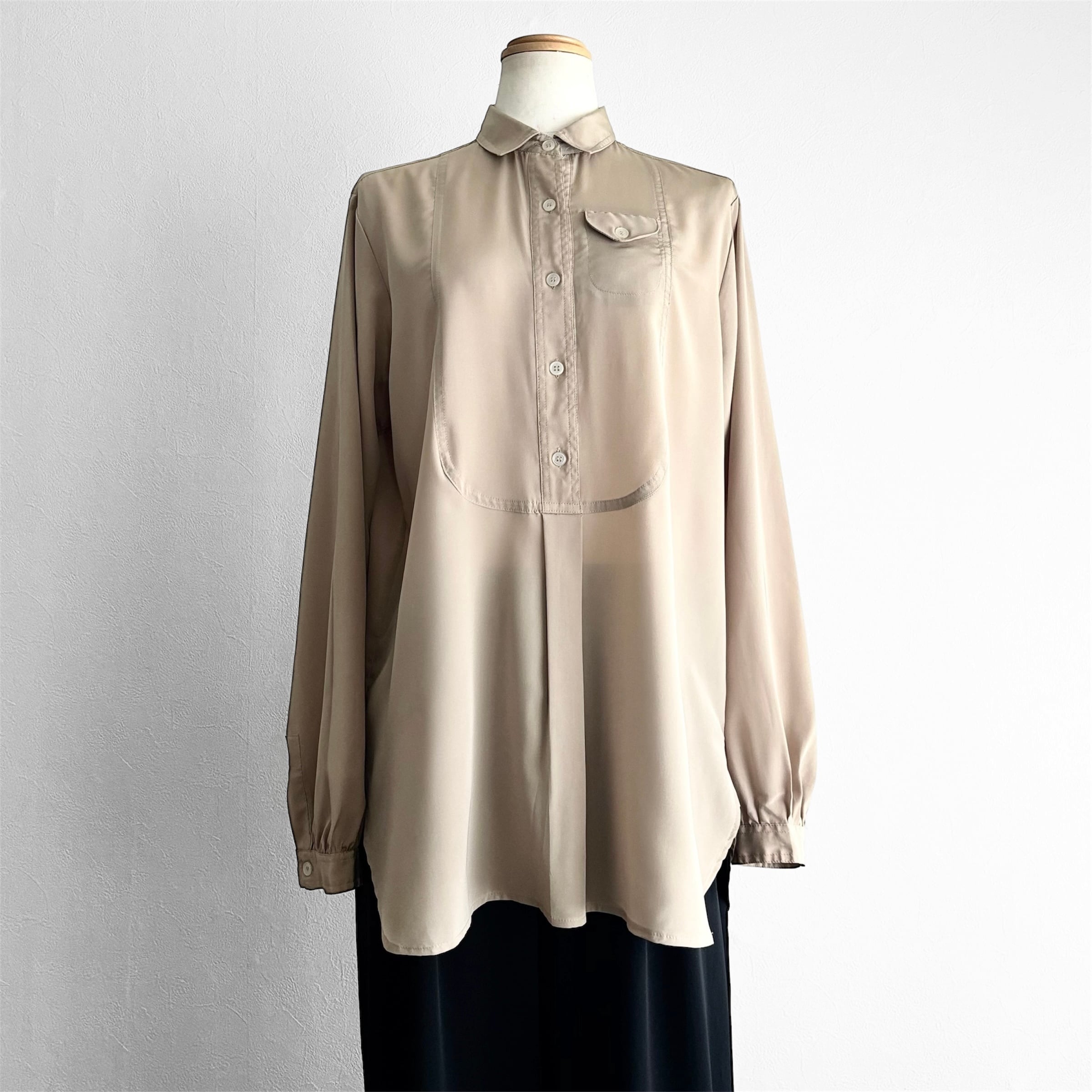 アンティークシャツのようなフロントのビブや左胸の小さなフラップポケットが愛らしい1枚。