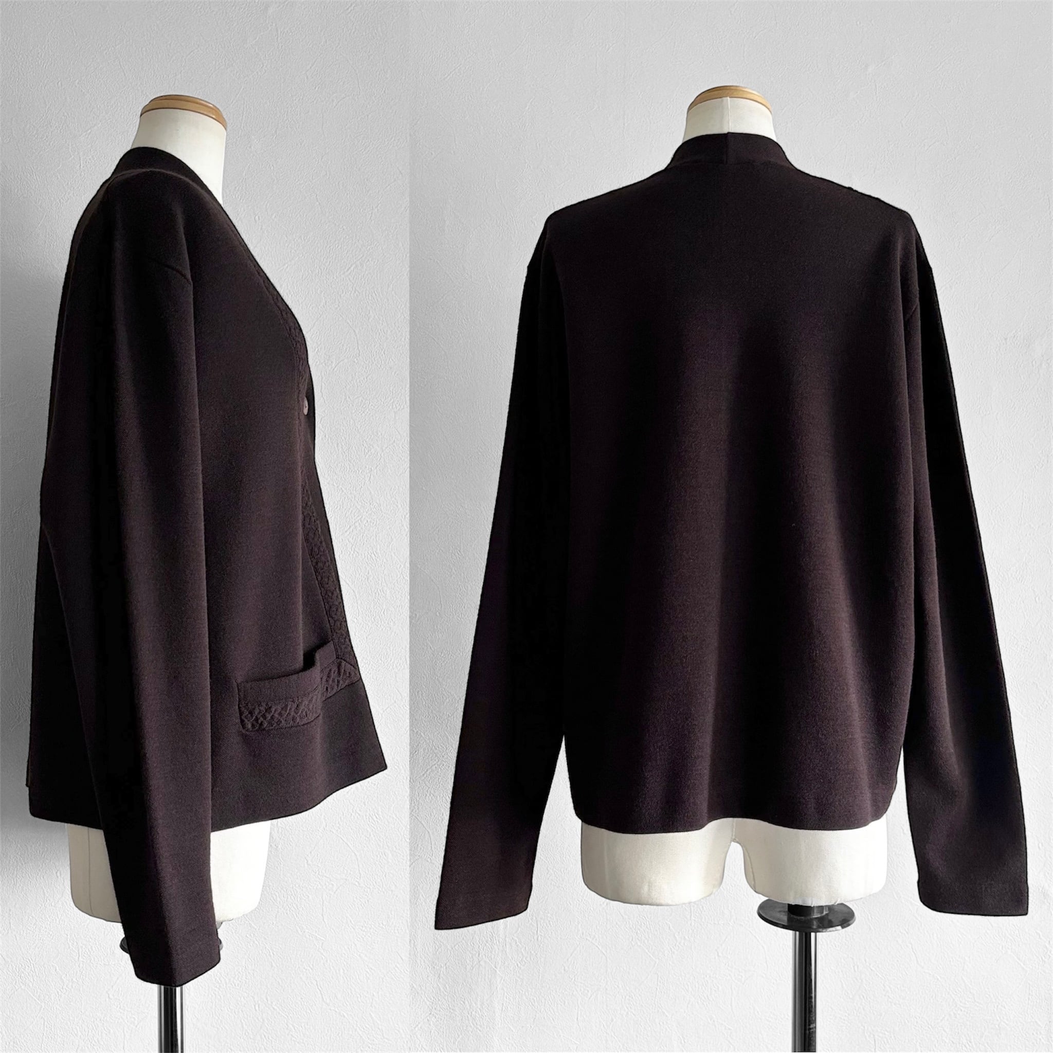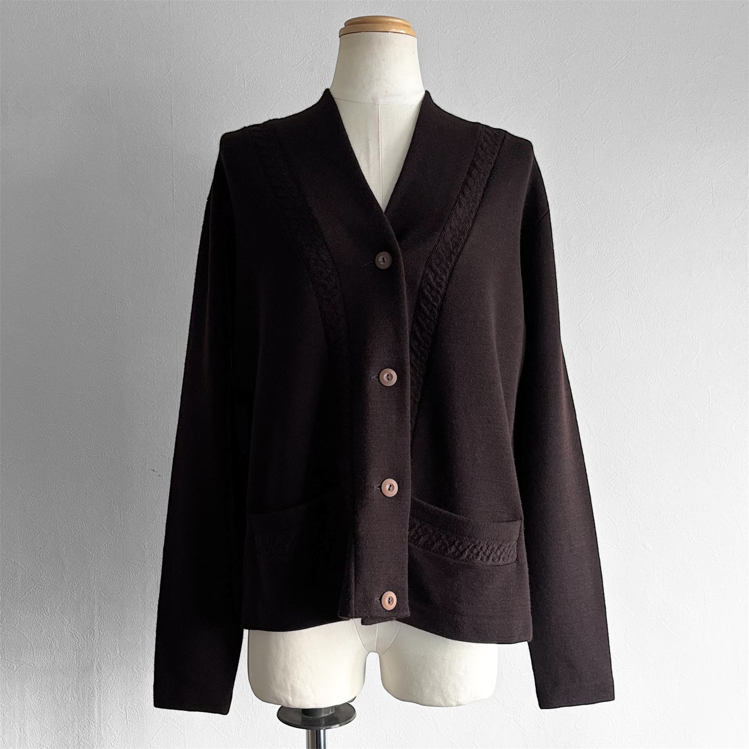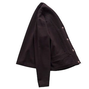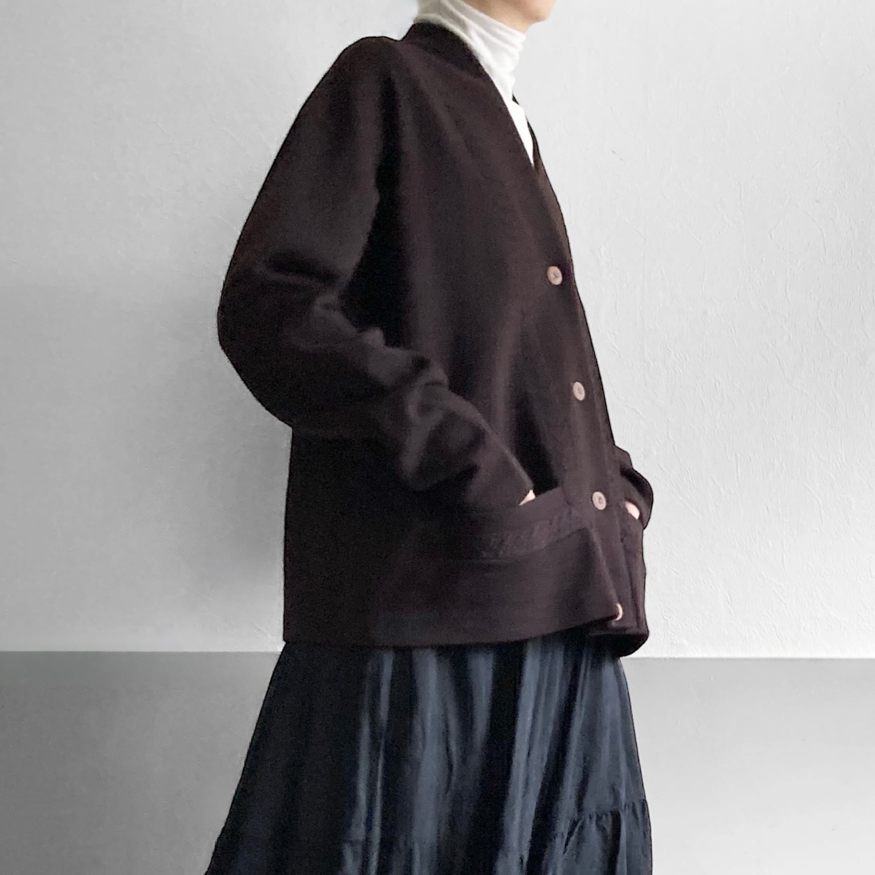 深いチョコレートブラウンとしっかり目の詰まったニット素材が存在感あるカーディガン。
