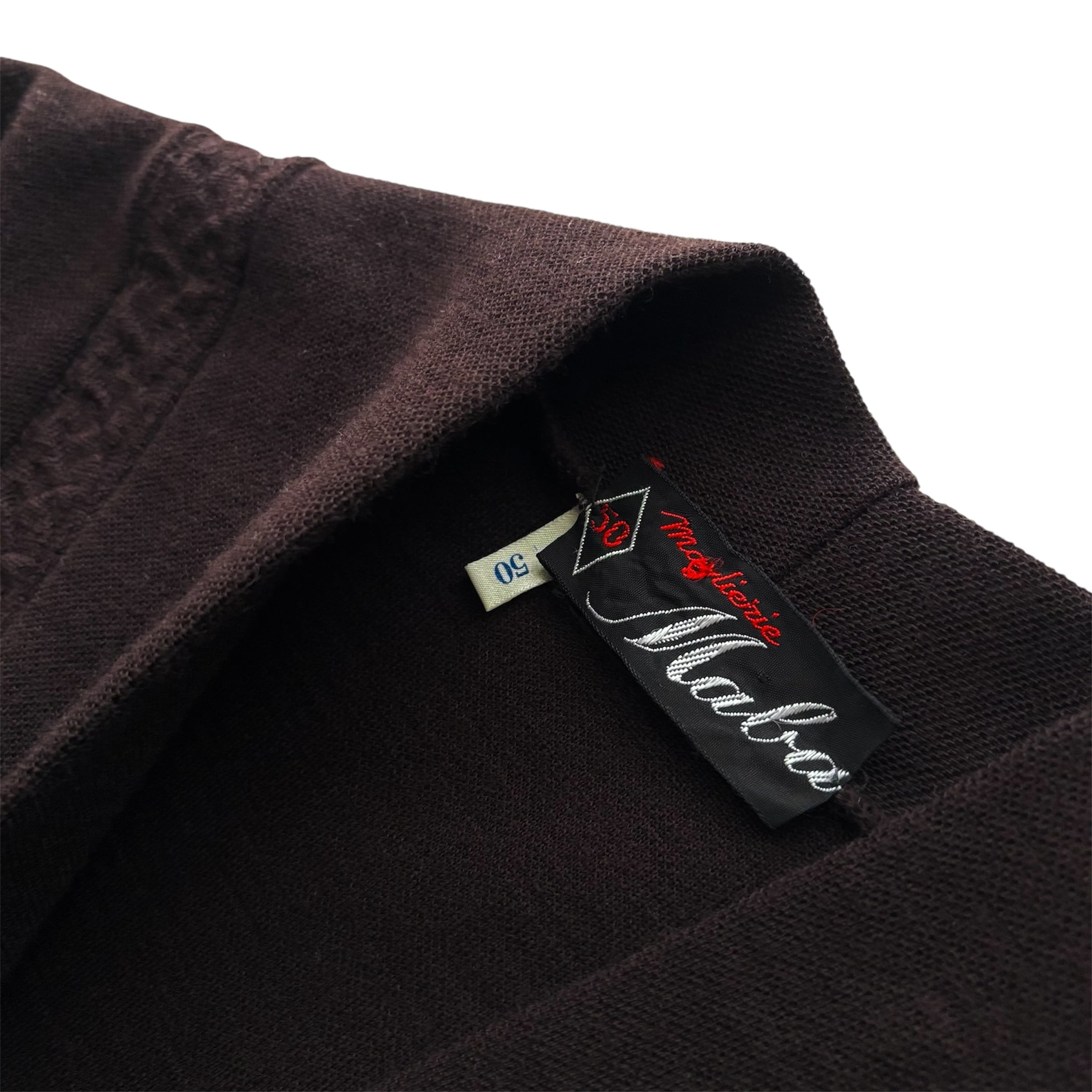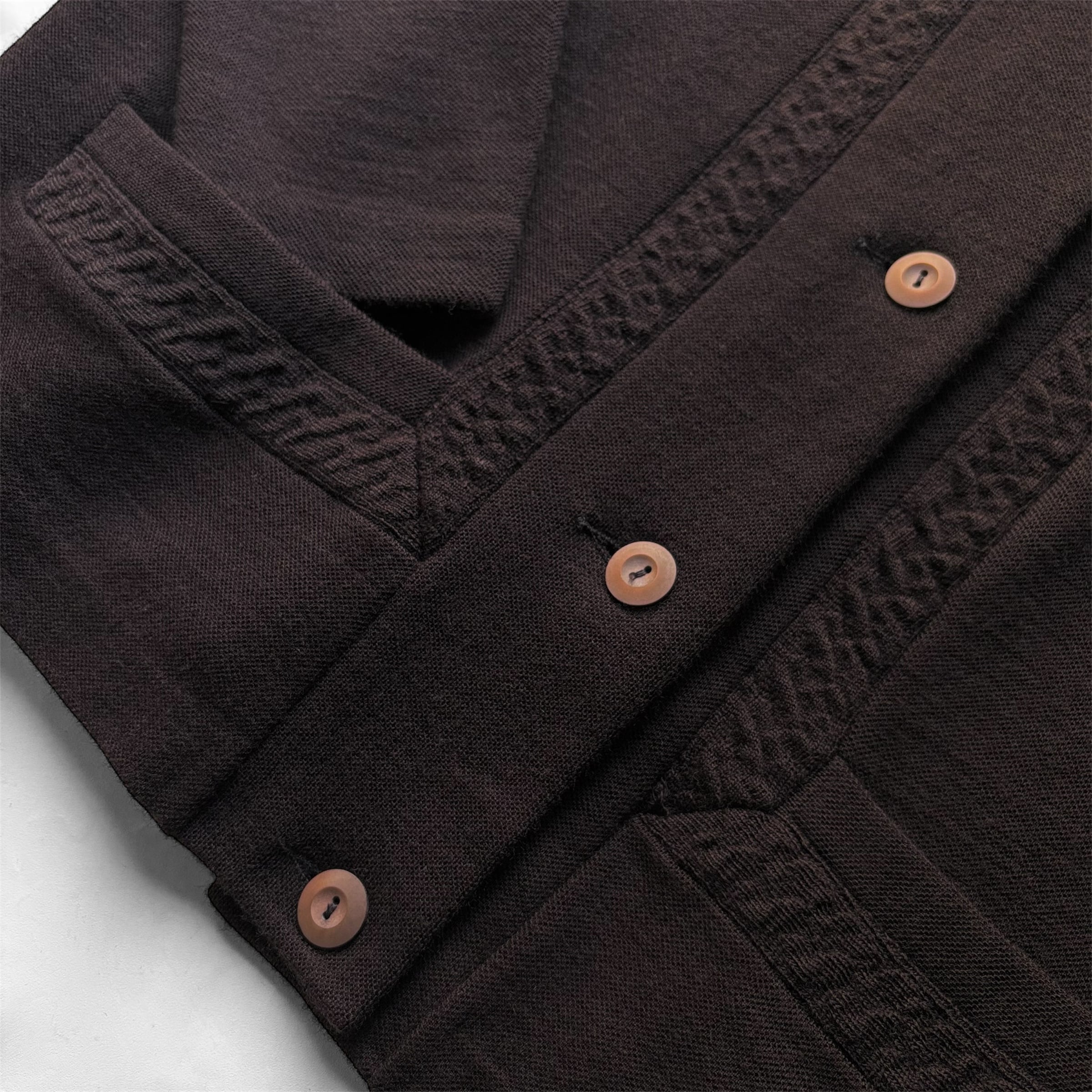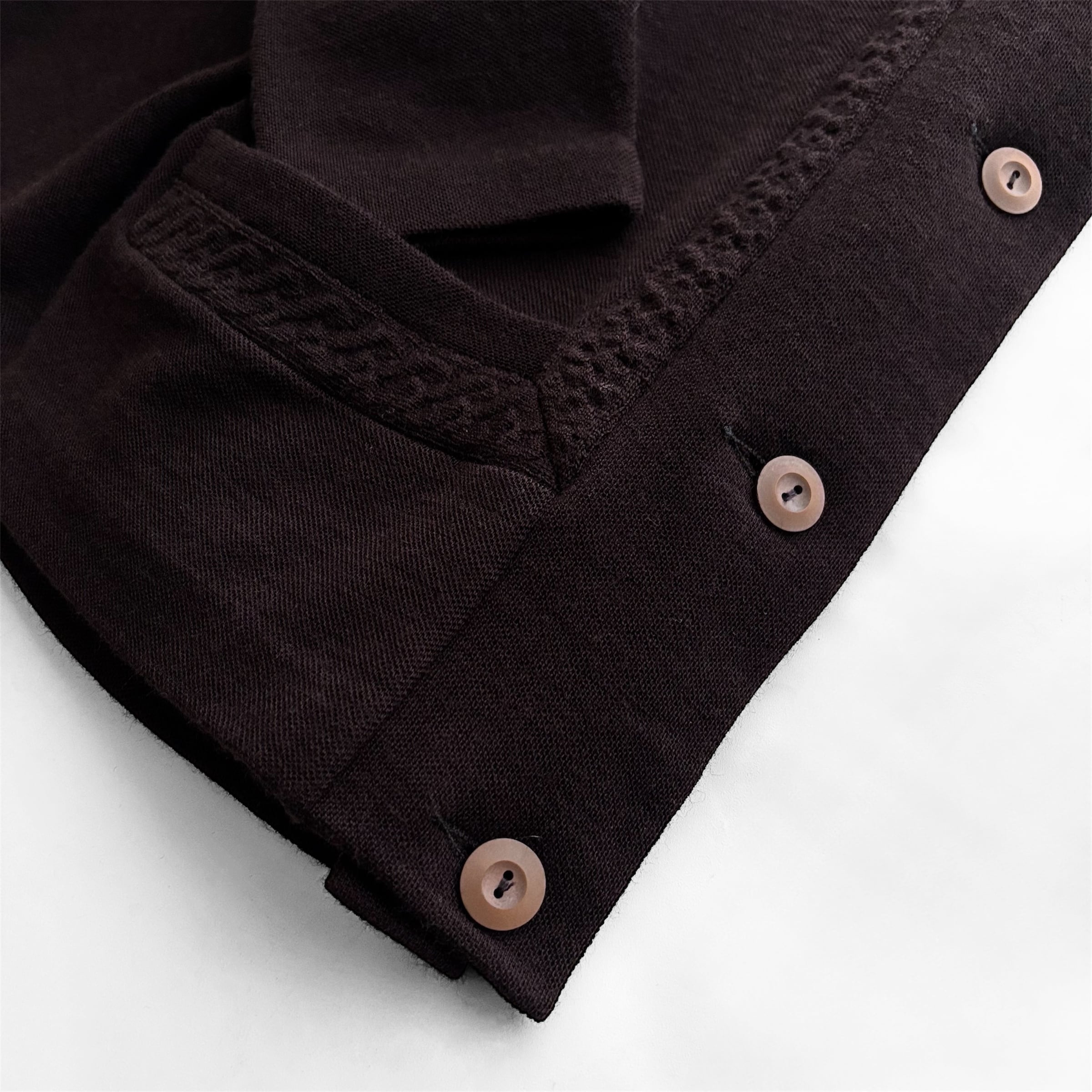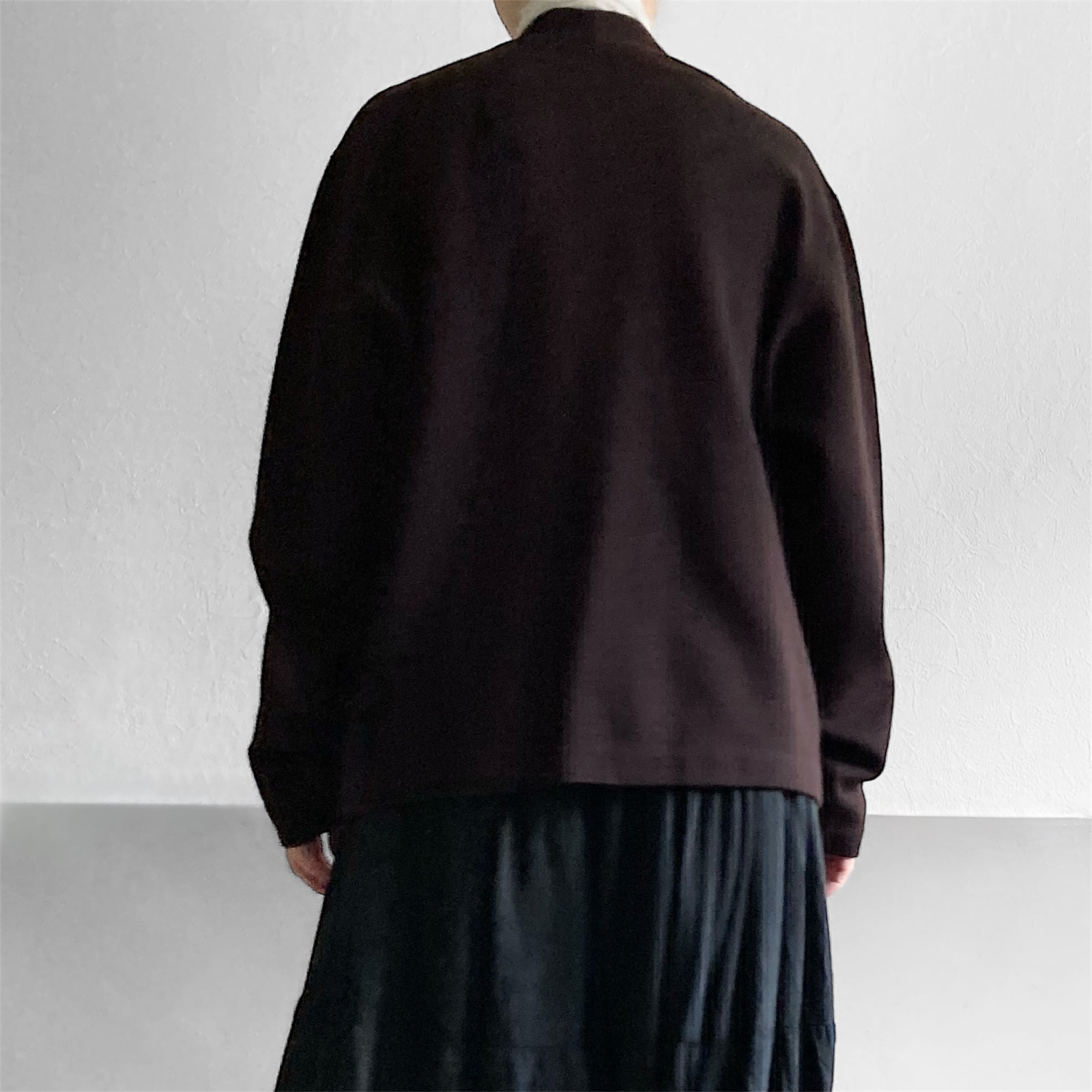深いチョコレートブラウンとしっかり目の詰まったニット素材が存在感あるカーディガン。