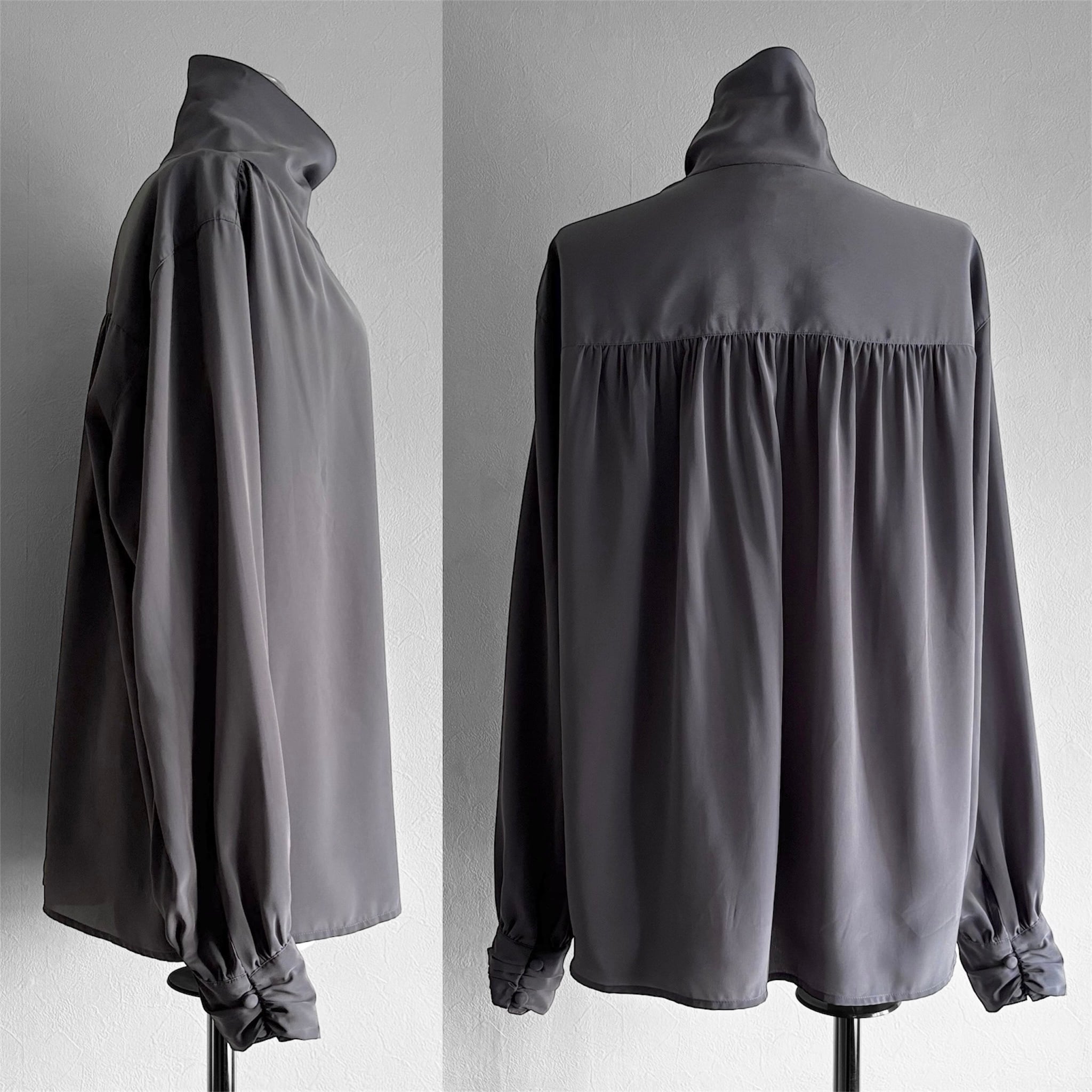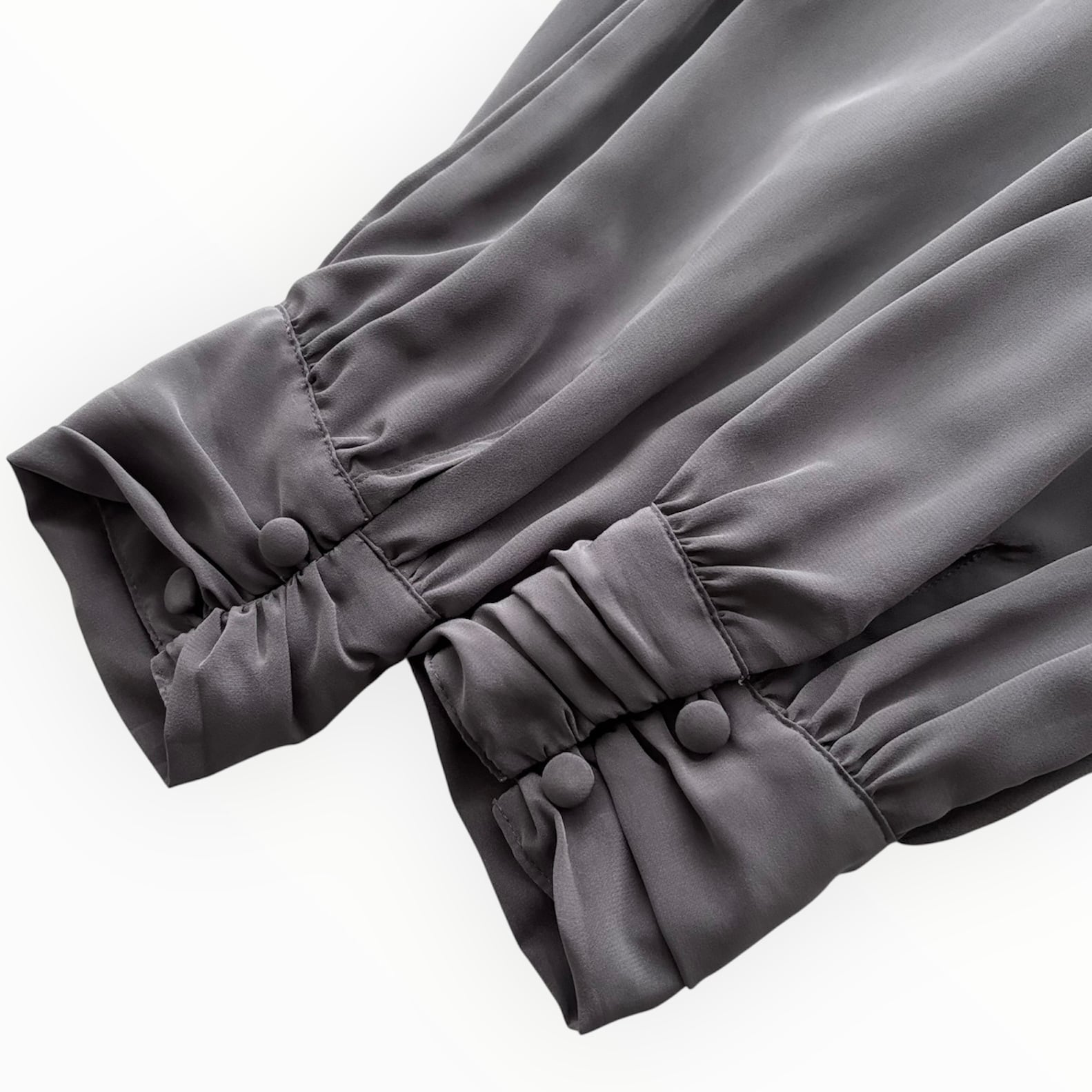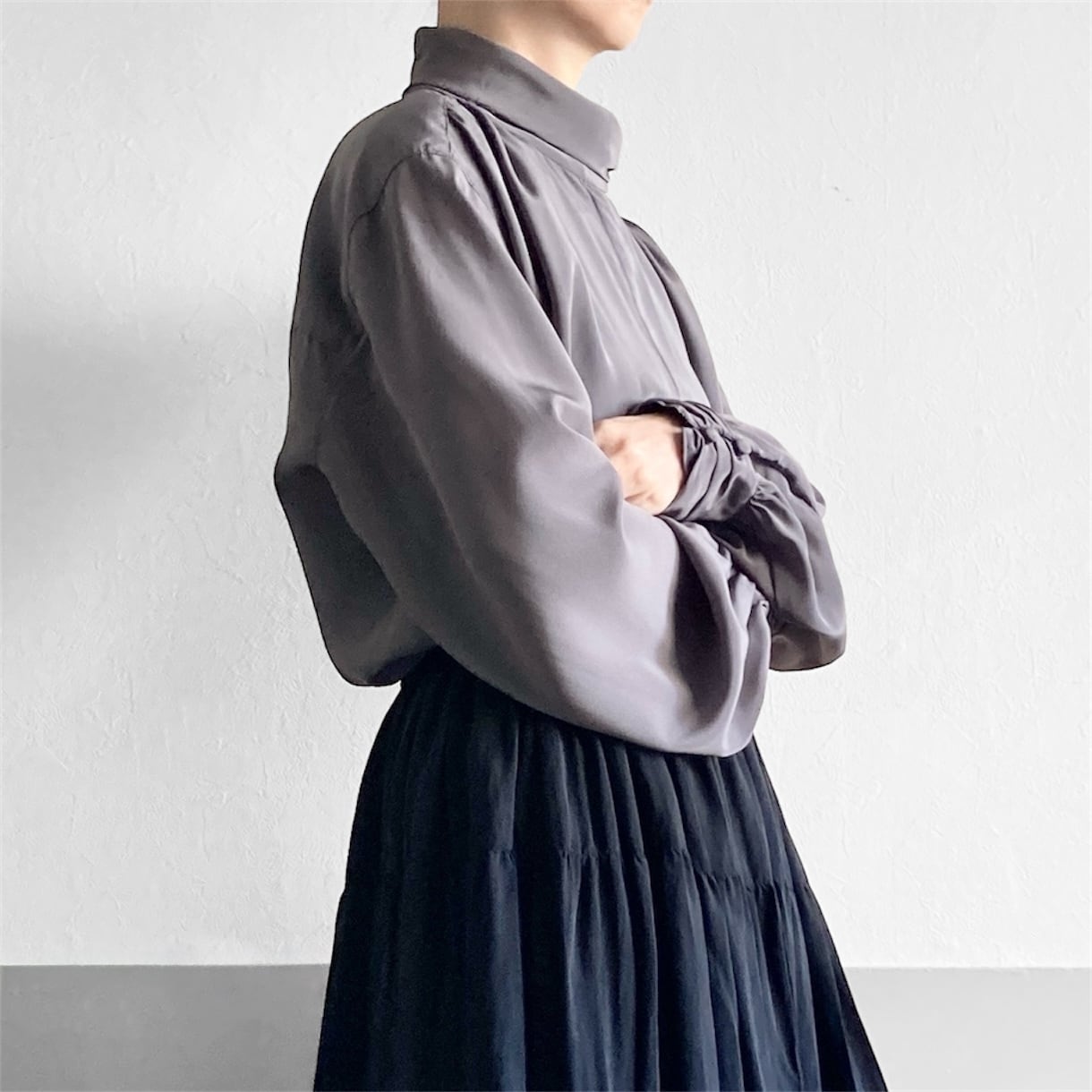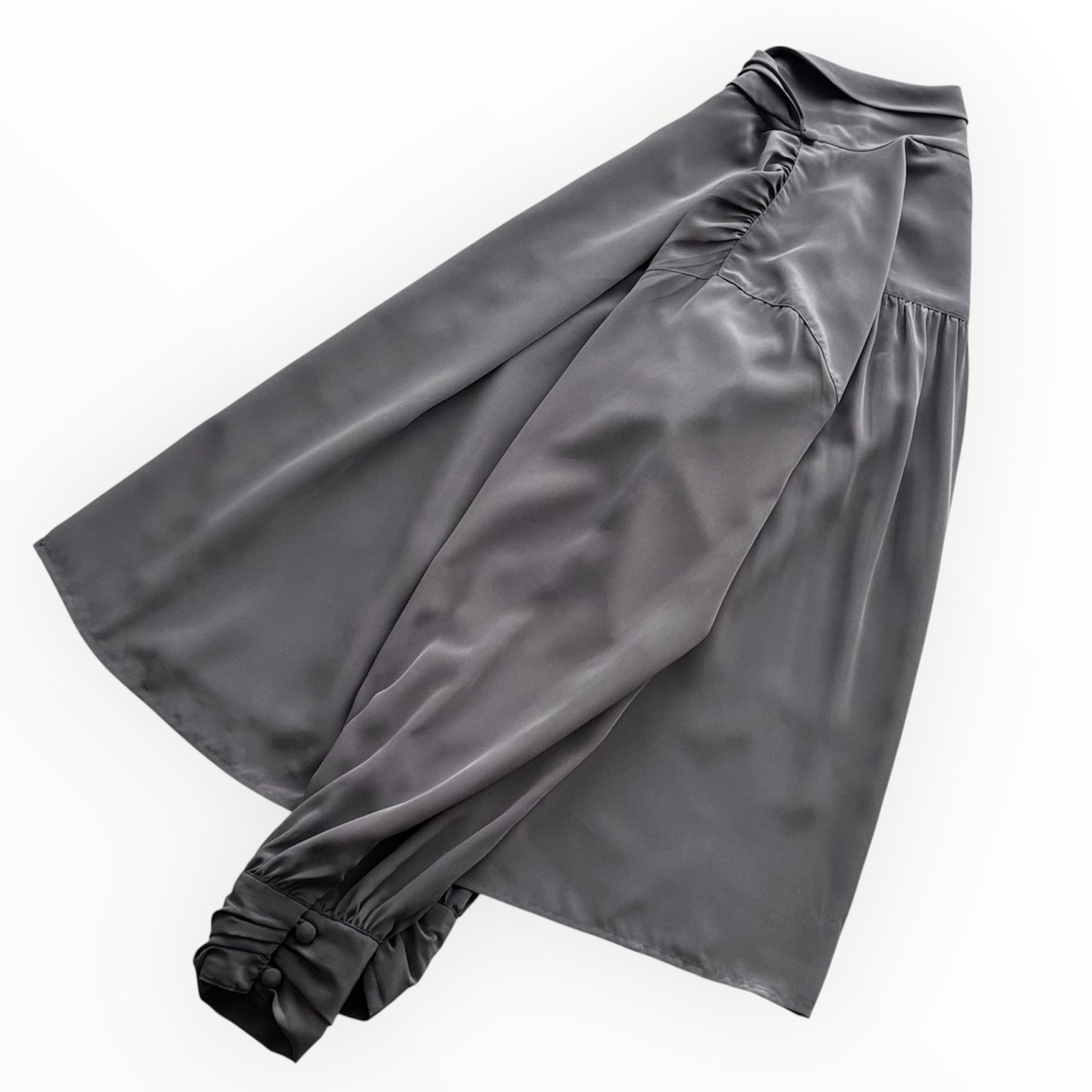 袖口のふんわりとした飾りタック、ループ止めのくるみボタンなど凝ったディテール。