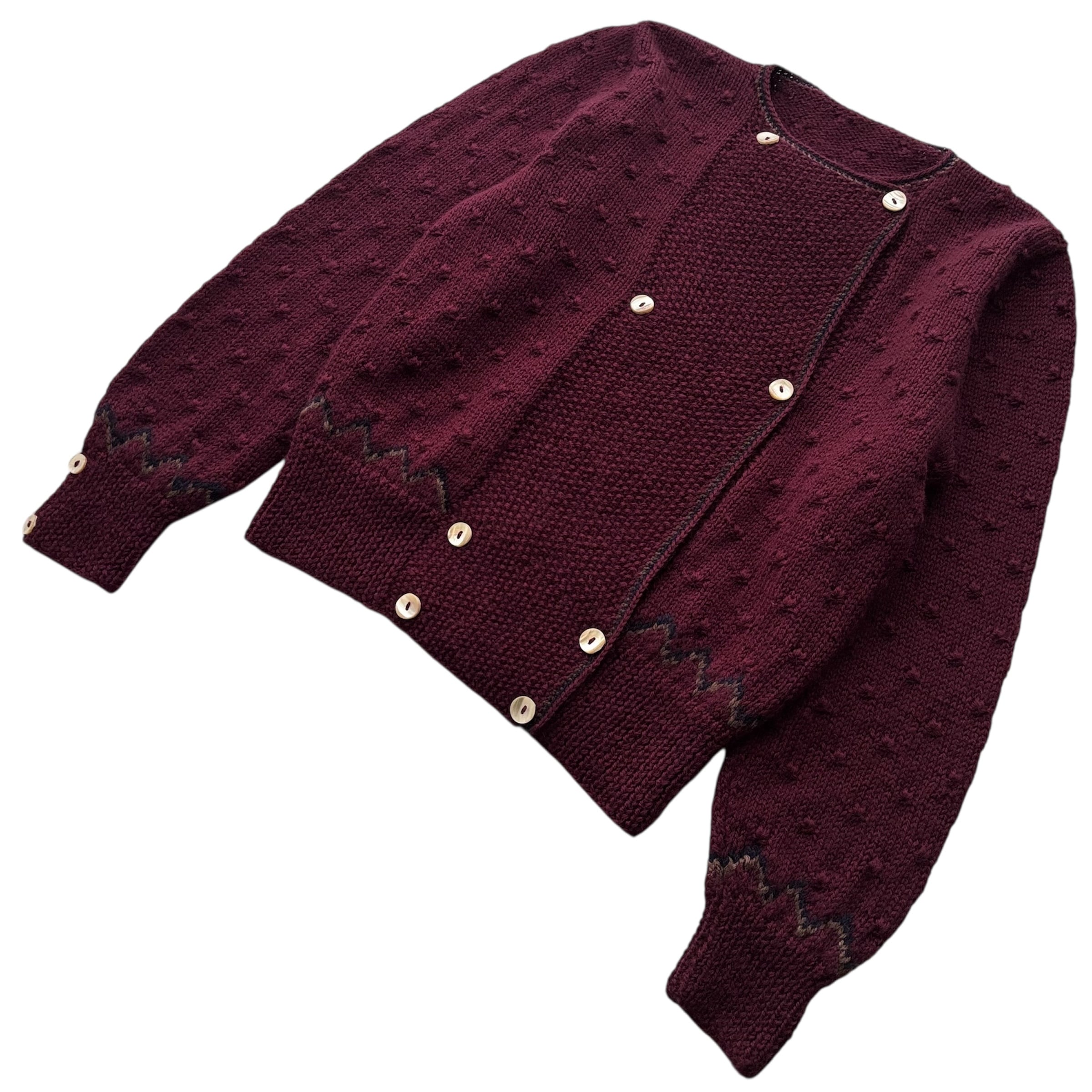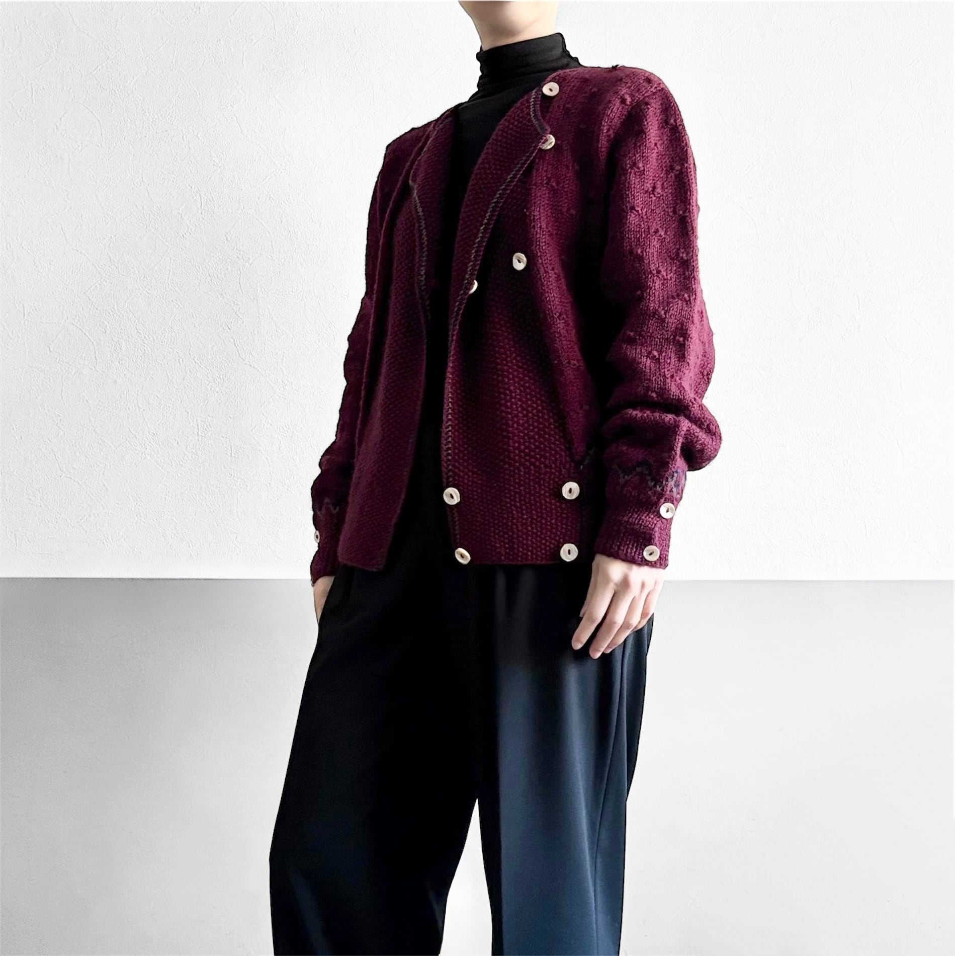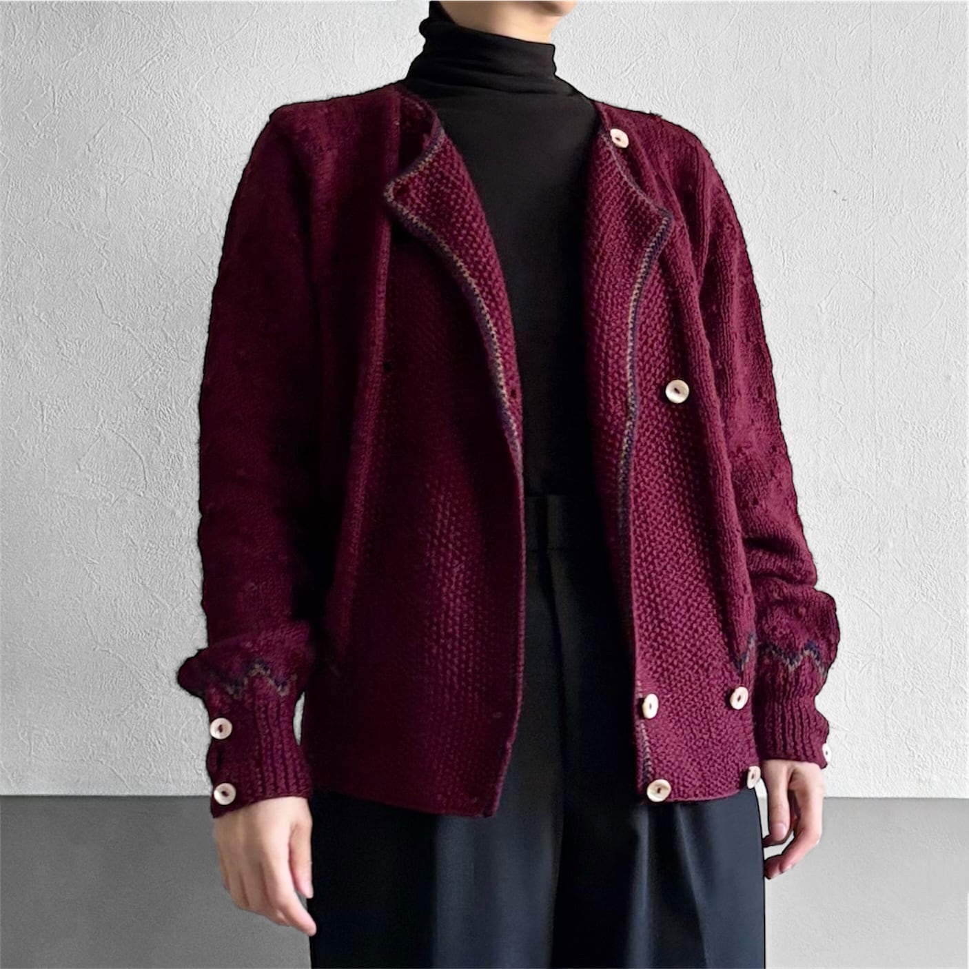 3種類で構成されたボルドーカラーの編み地に、ネイビーとブラウンのさりげないアクセントカラー。