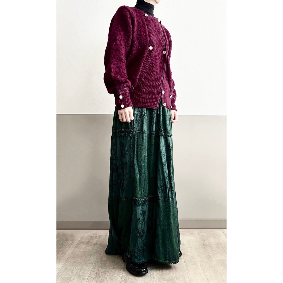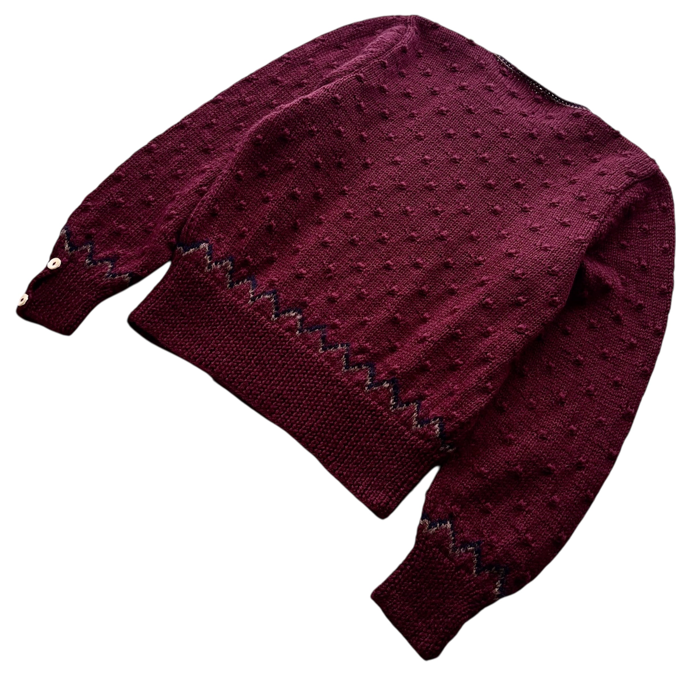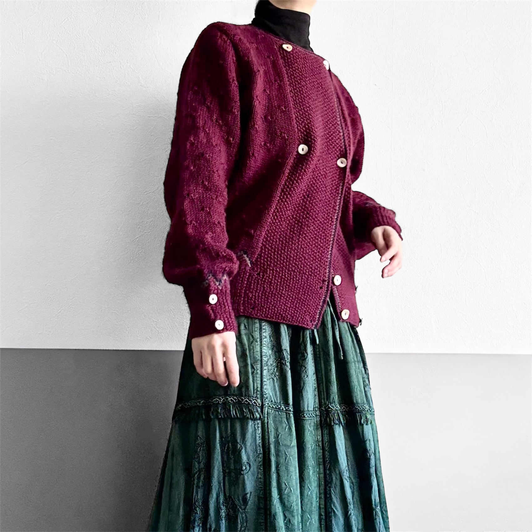 3種類で構成されたボルドーカラーの編み地に、ネイビーとブラウンのさりげないアクセントカラー。