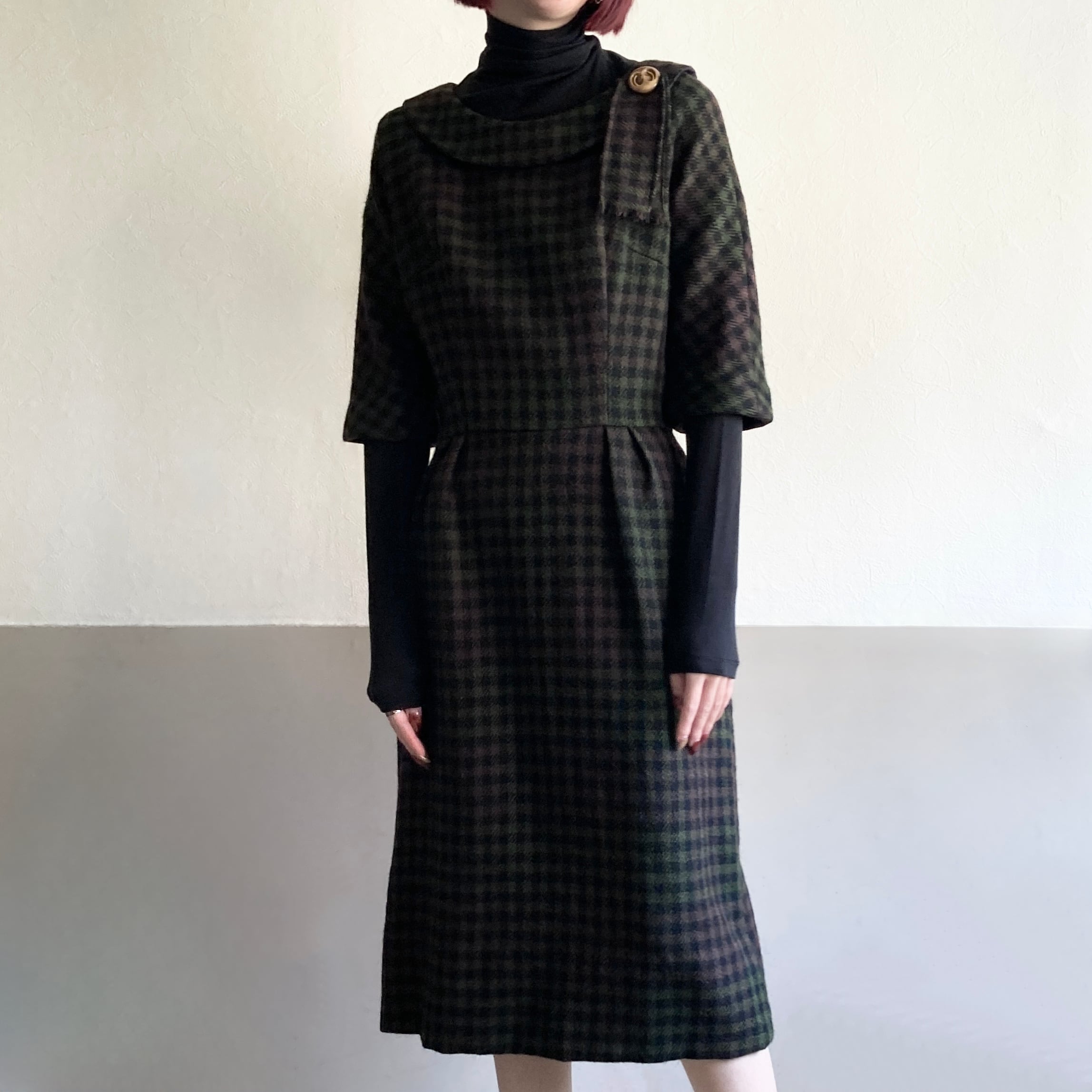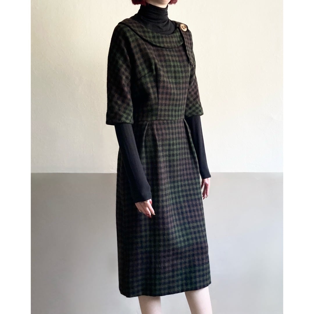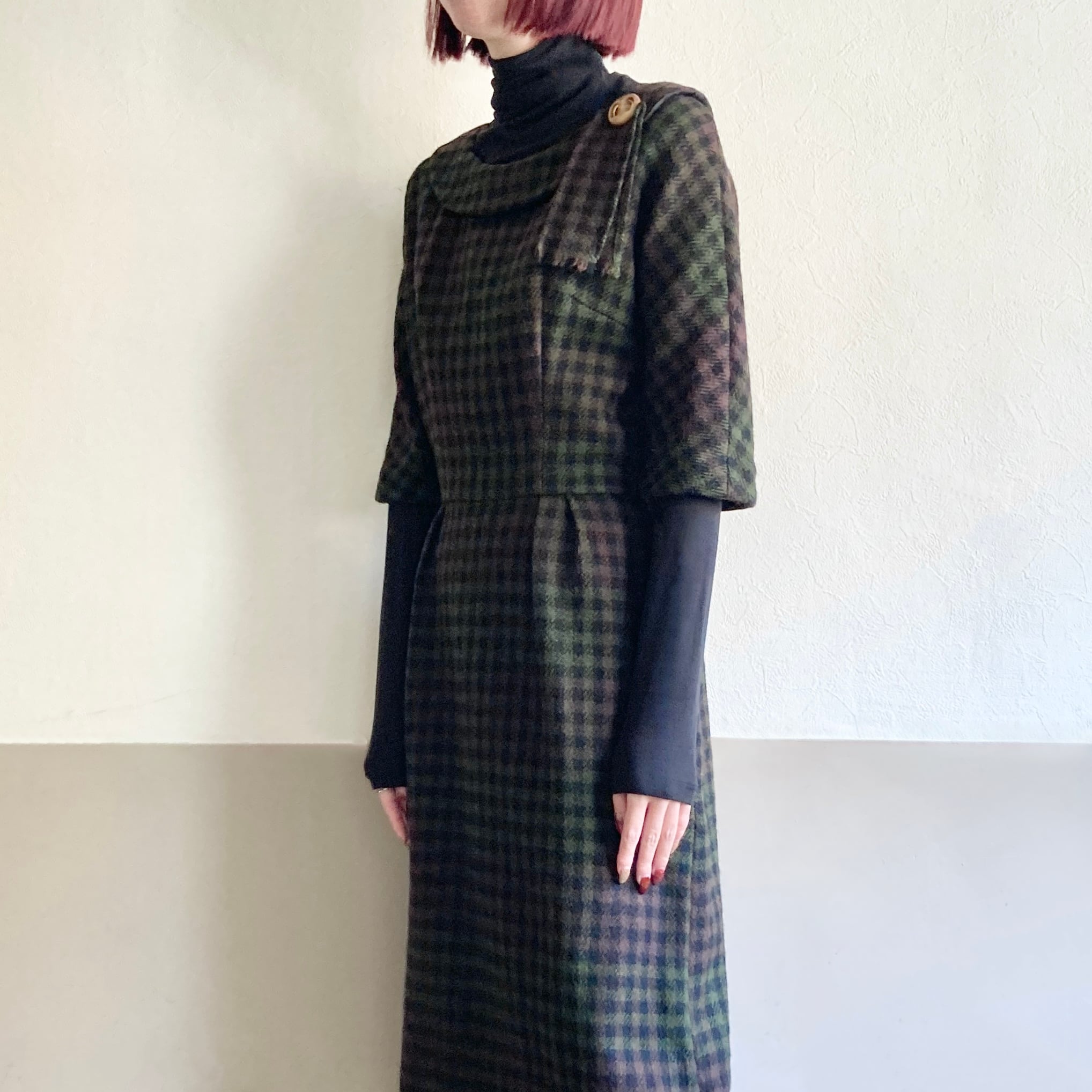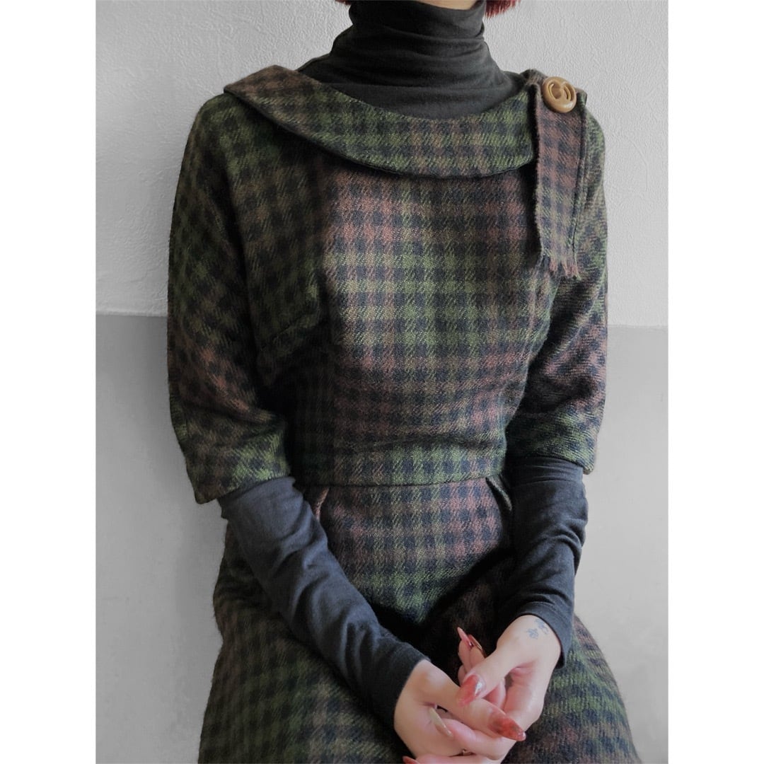 深みのあるブラウンとグリーンを基調としたチェックワンピース。
