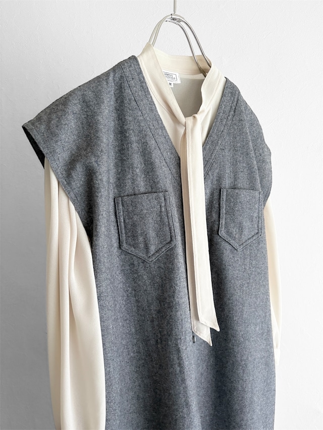 大きなボタン飾り、襟ぐり広めのロールカラー、短めの袖丈などヴィンテージならではのディテールが盛り込まれた1着。