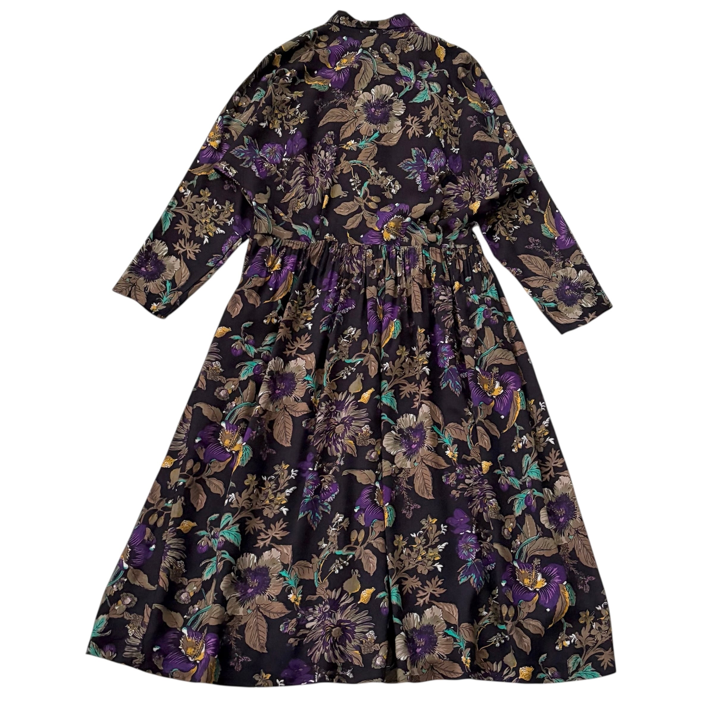 落ち着いたカラーリングのボタニカル柄ワンピース。