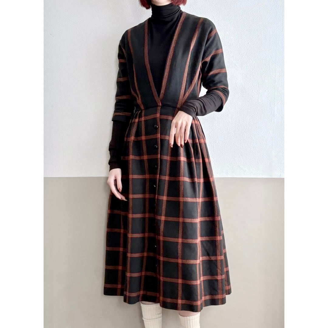 シェイプされたウエスト、細やかなタック、張りのある素材による構築的なフォルムのヴィンテージワンピース。