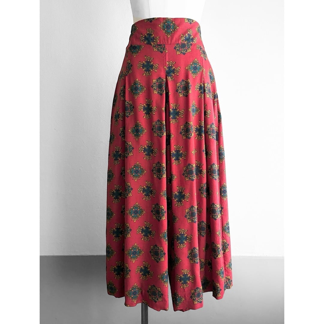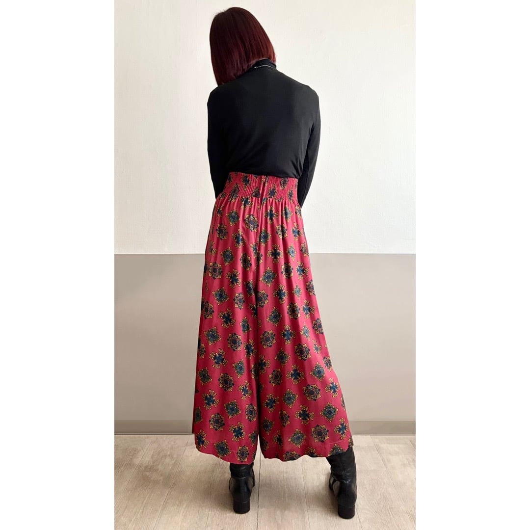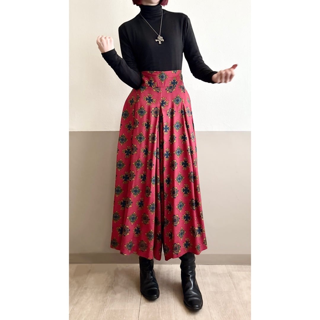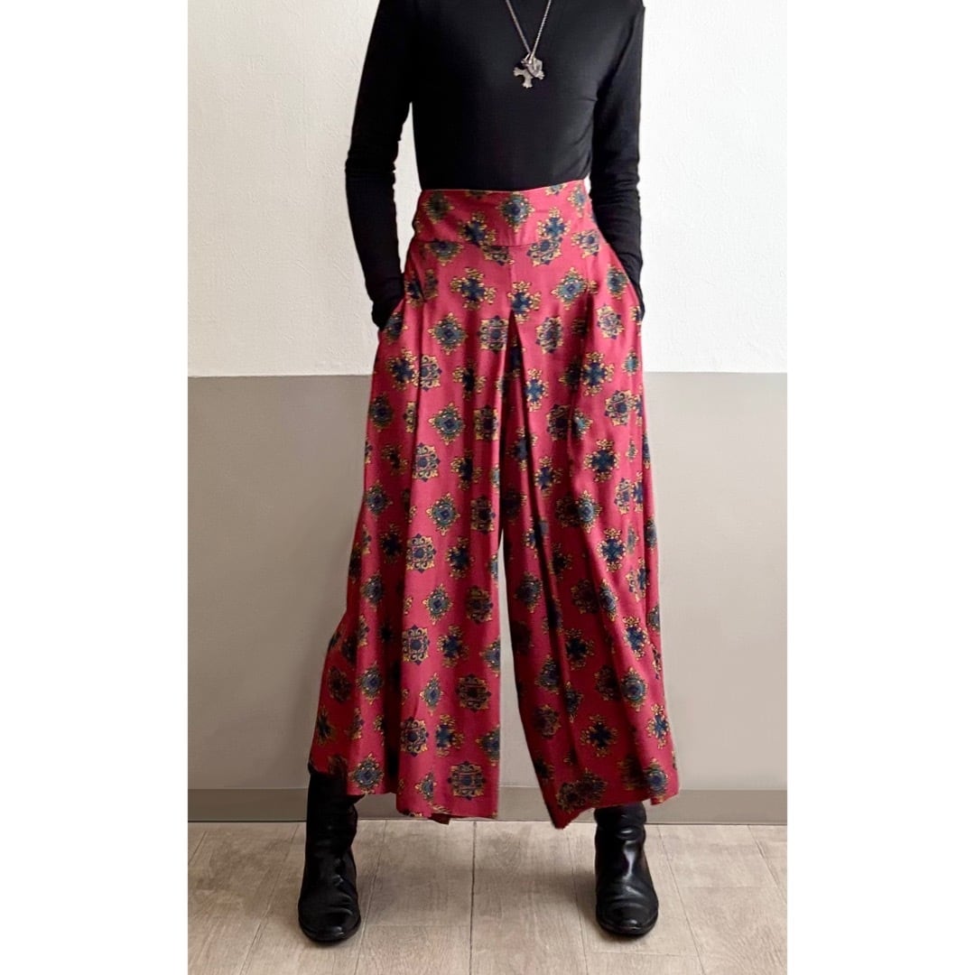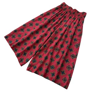 柔らかなレッドカラーに紋章モチーフがクラシカルな雰囲気のワイドパンツ。