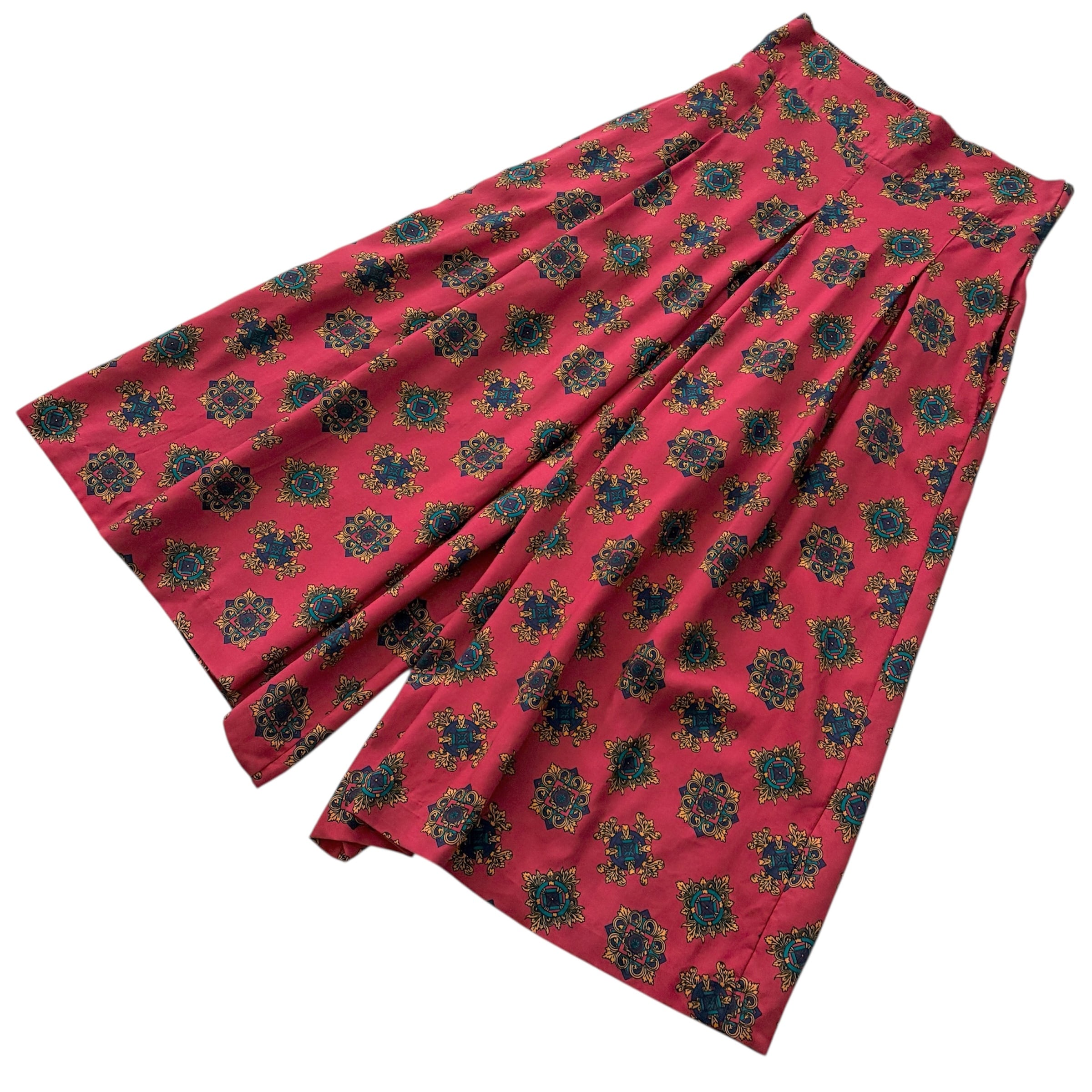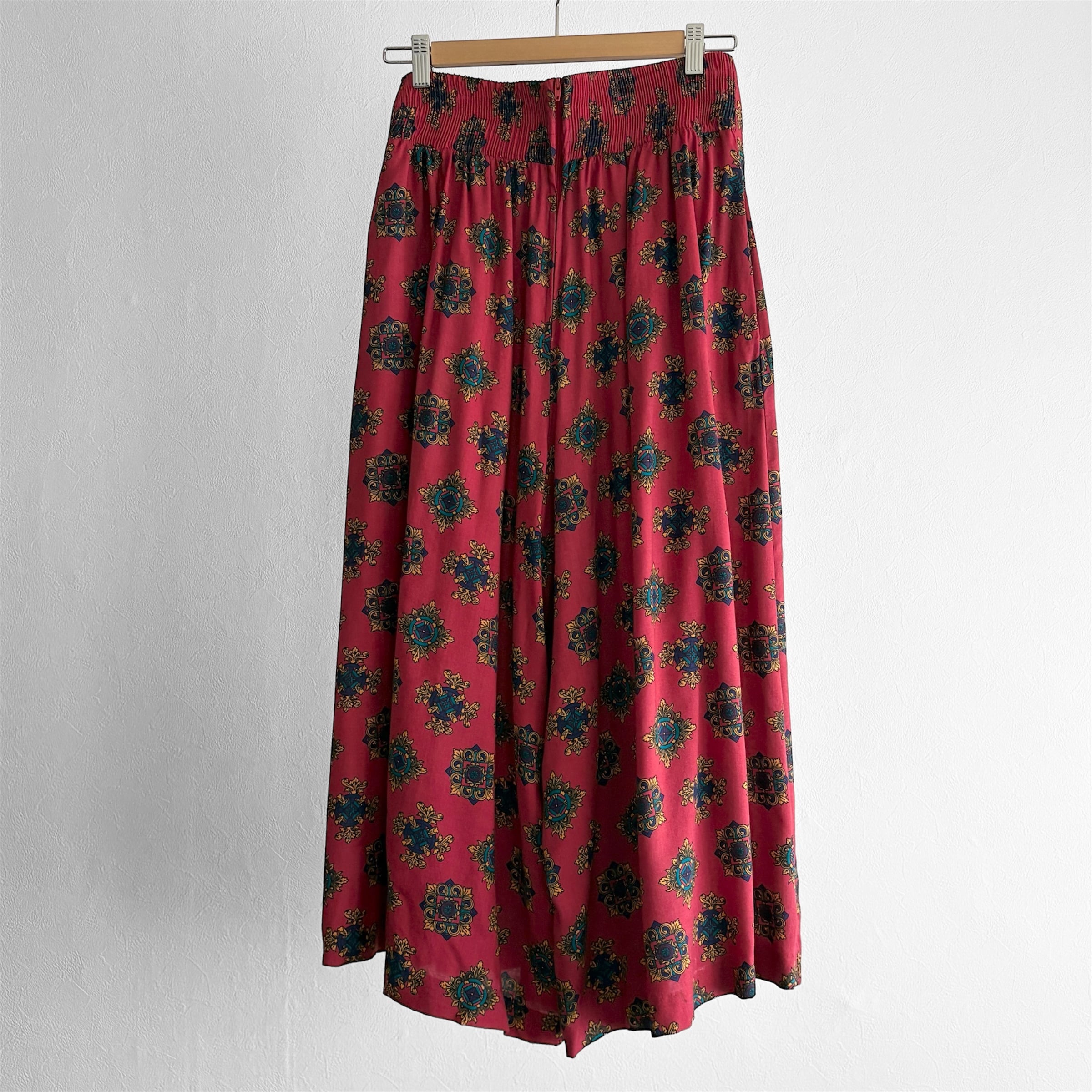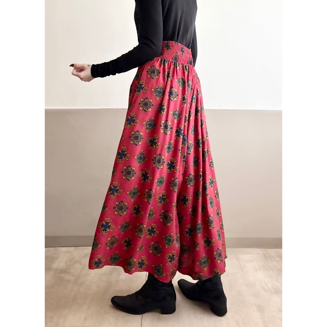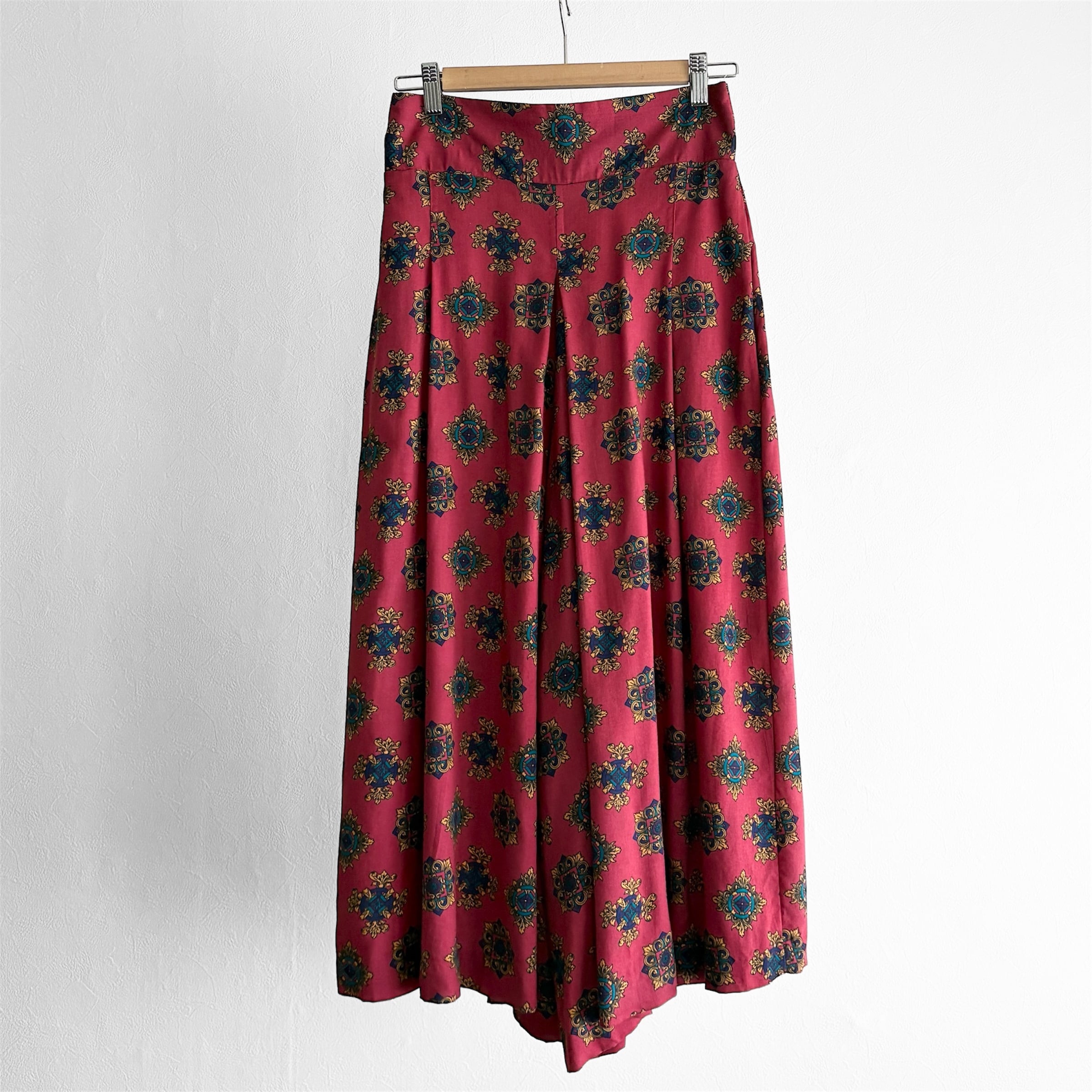 柔らかなレッドカラーに紋章モチーフがクラシカルな雰囲気のワイドパンツ。