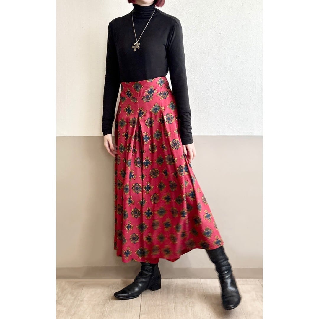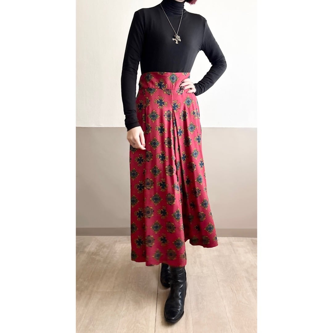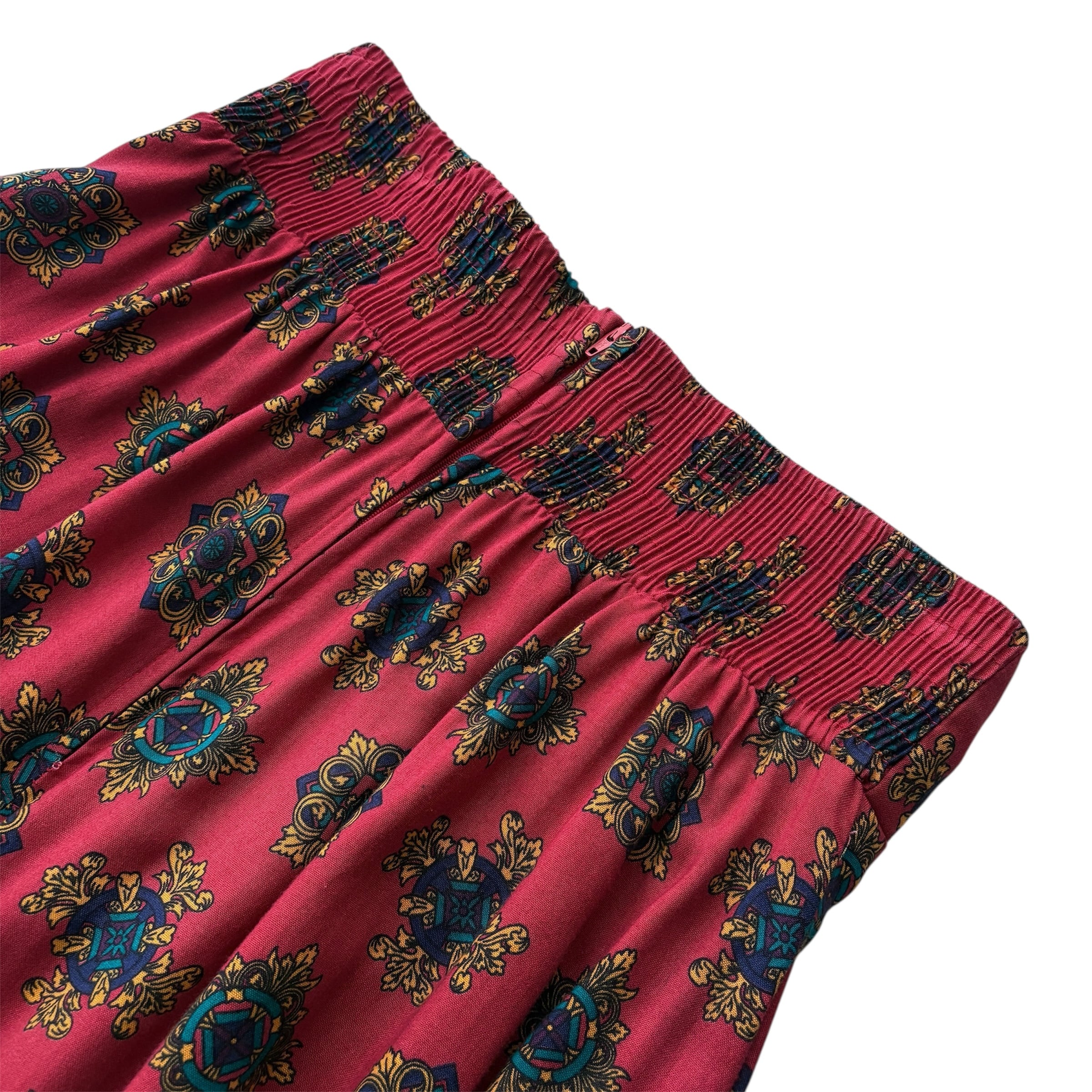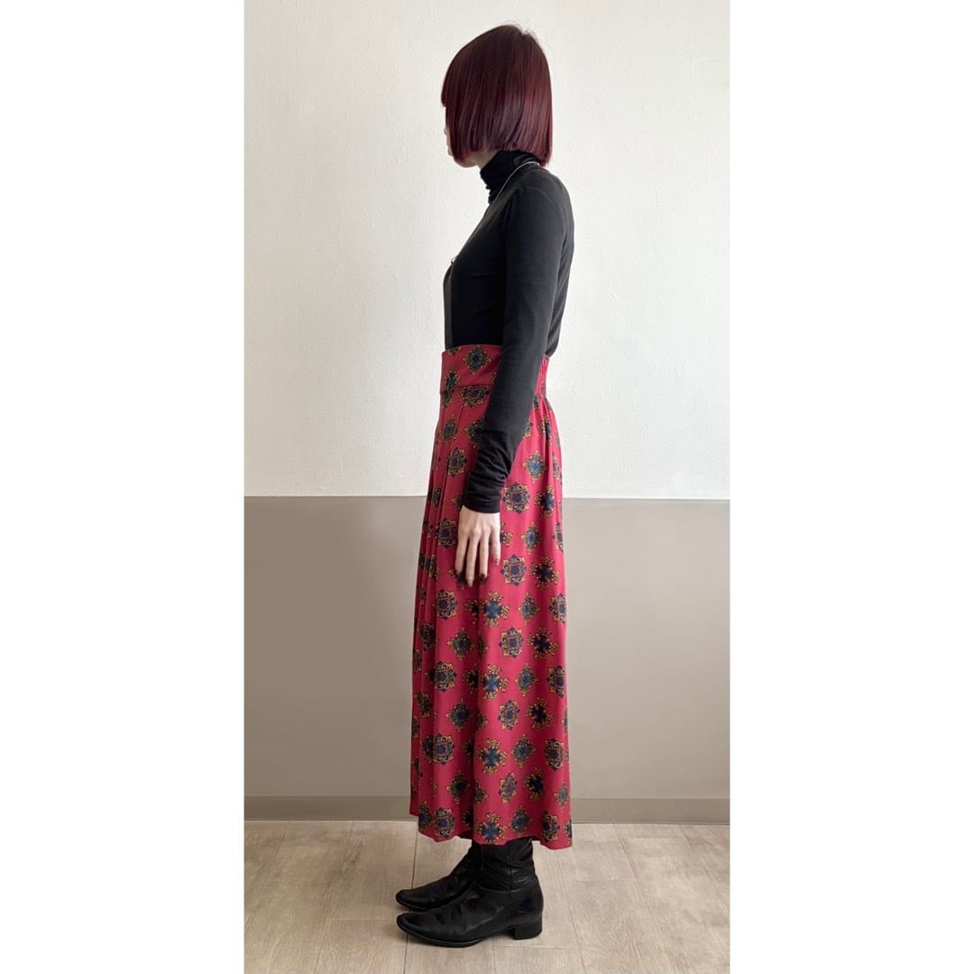 柔らかなレッドカラーに紋章モチーフがクラシカルな雰囲気のワイドパンツ。