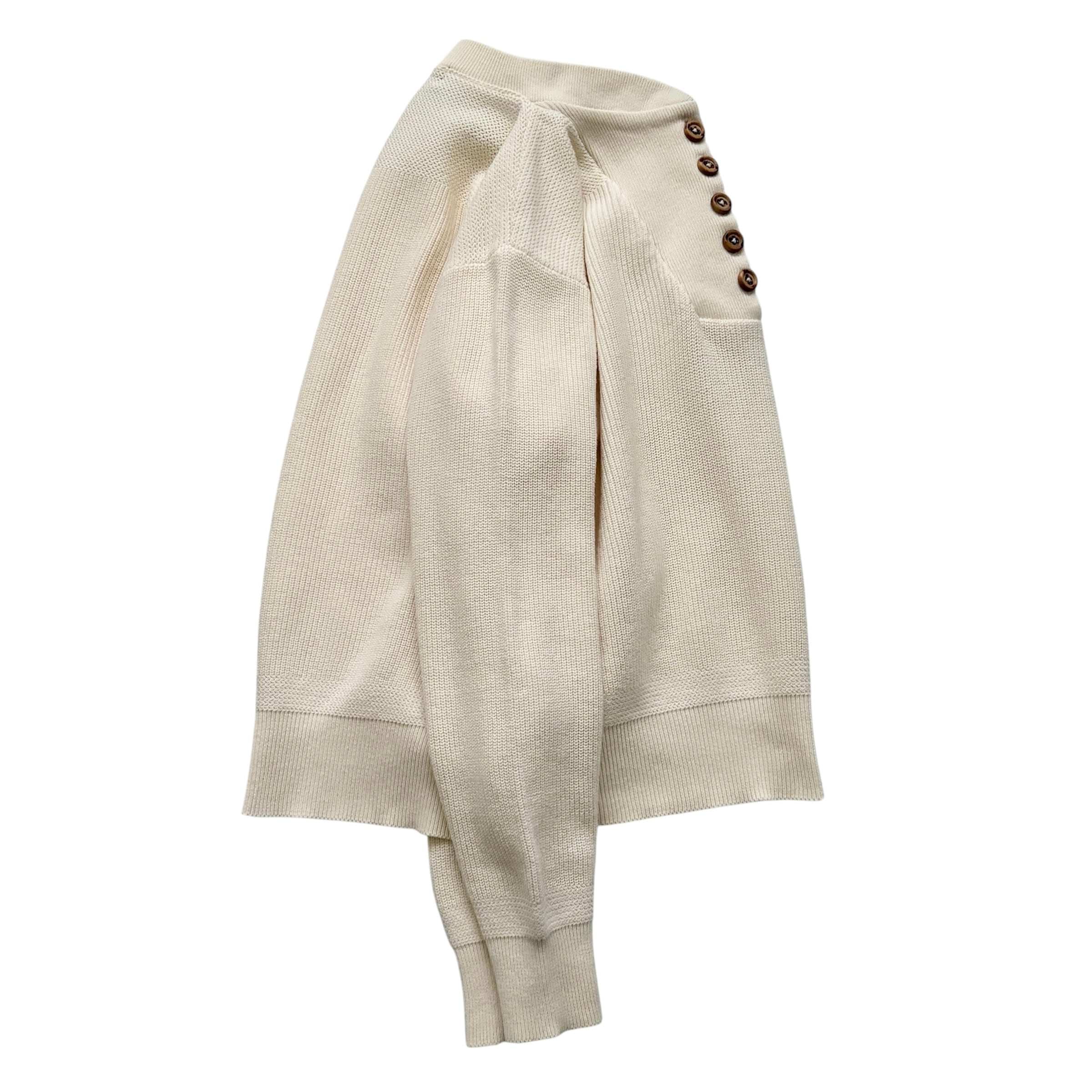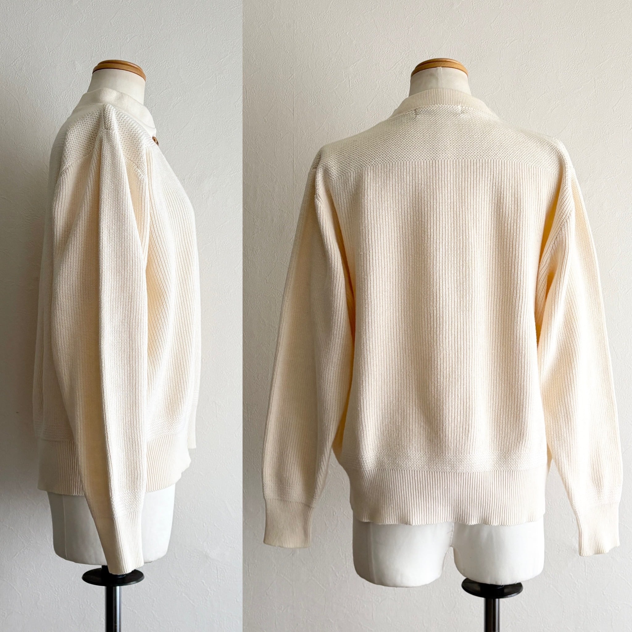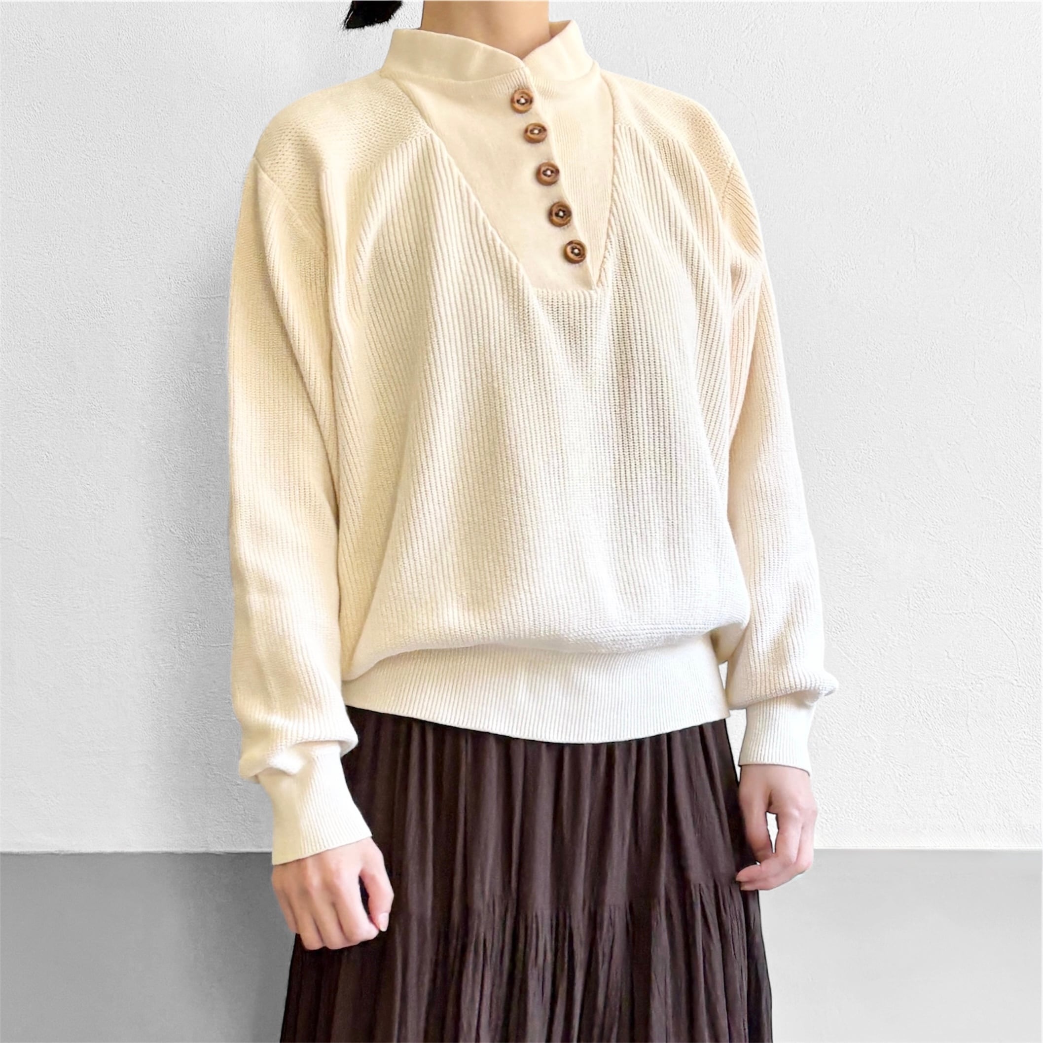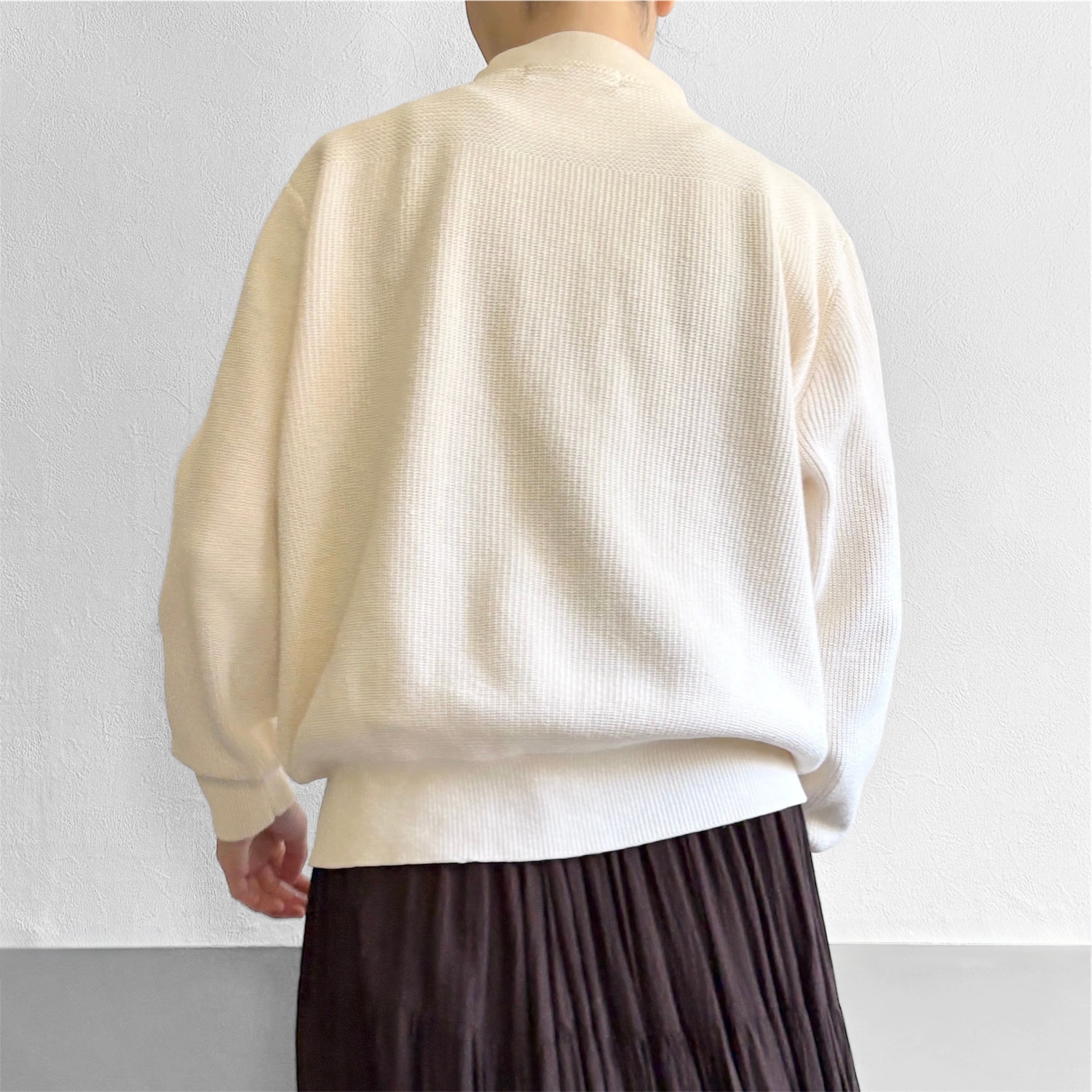 フロントのウッドボタンとアイボリーカラーのコットン素材がナチュラルな印象のニット。