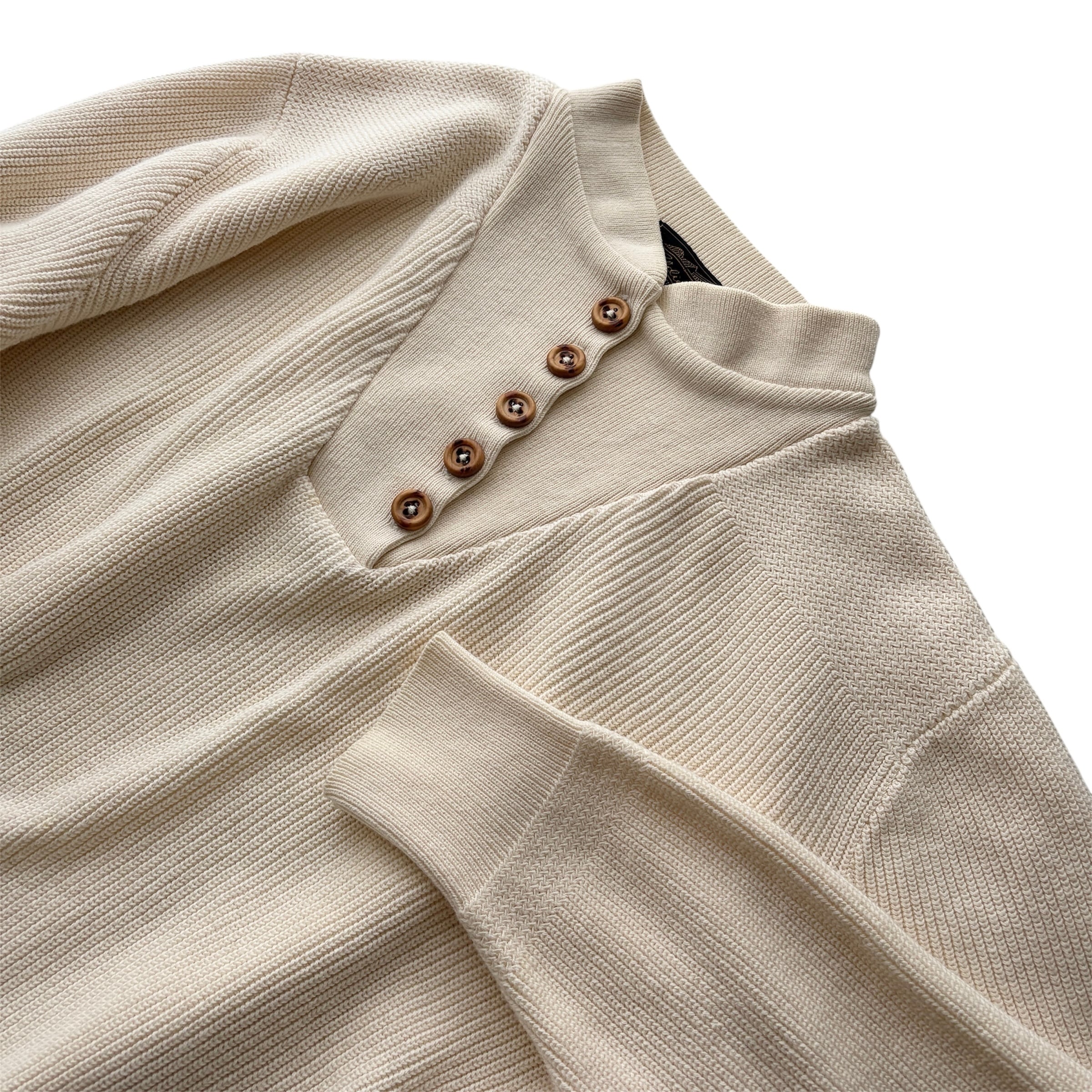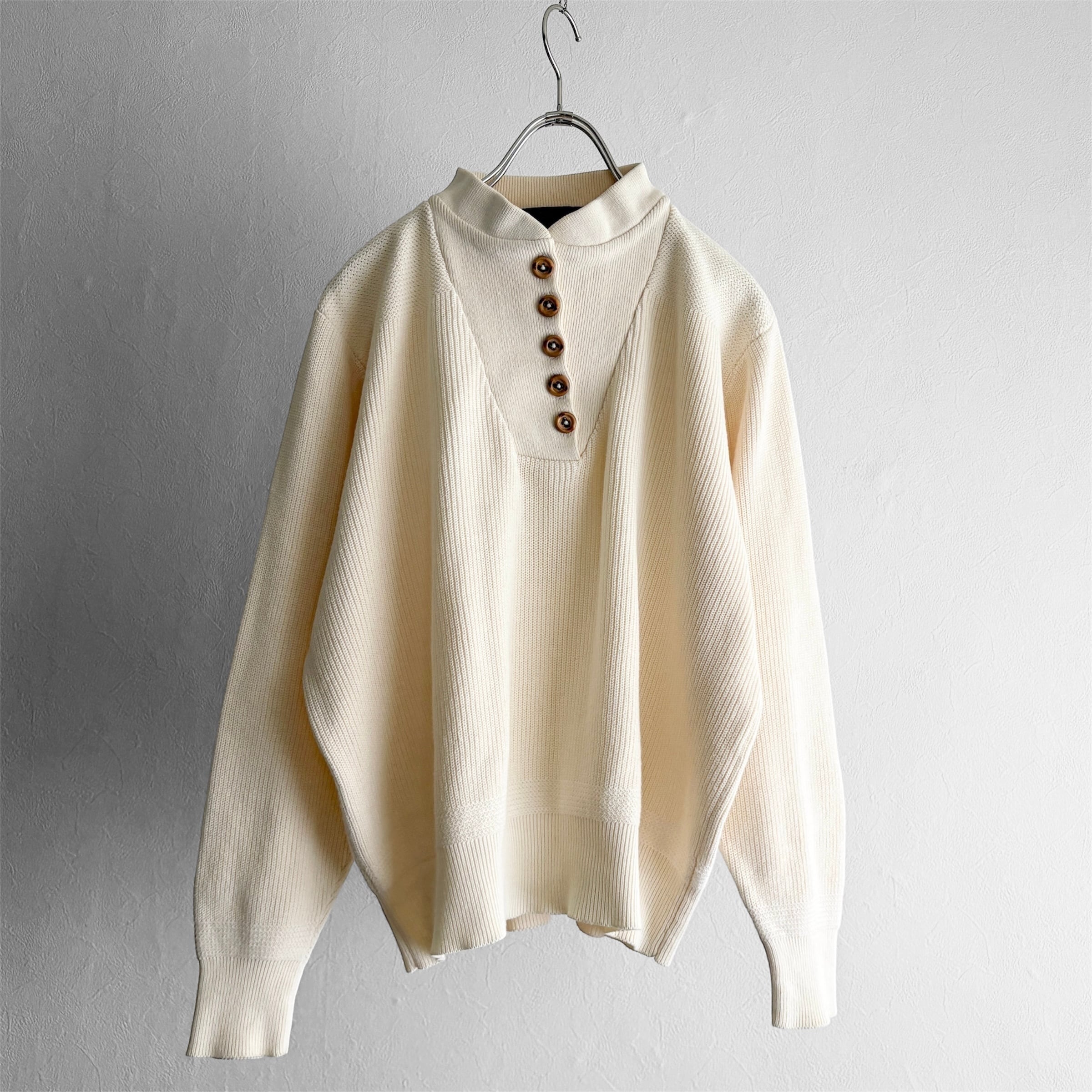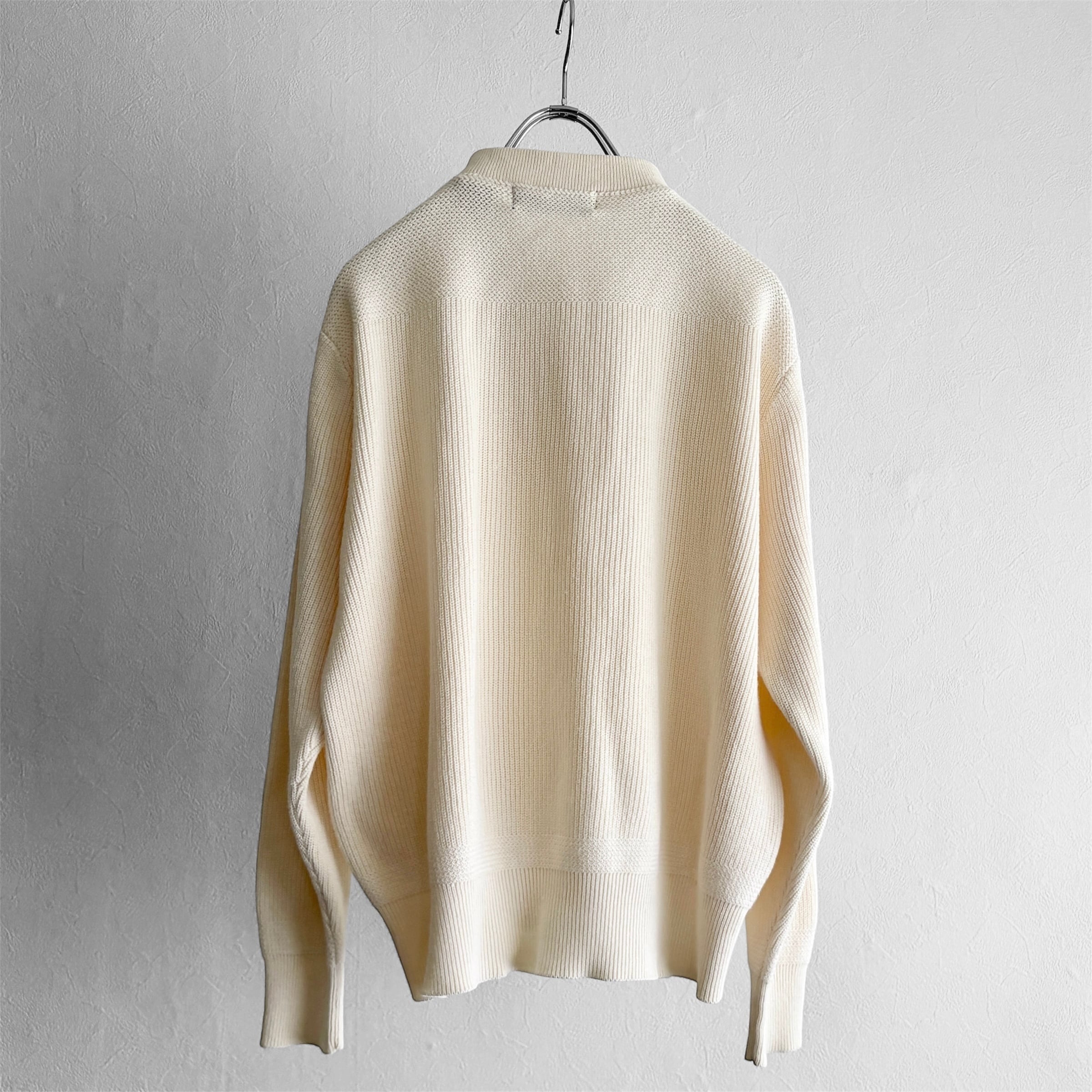 フロントのウッドボタンとアイボリーカラーのコットン素材がナチュラルな印象のニット。