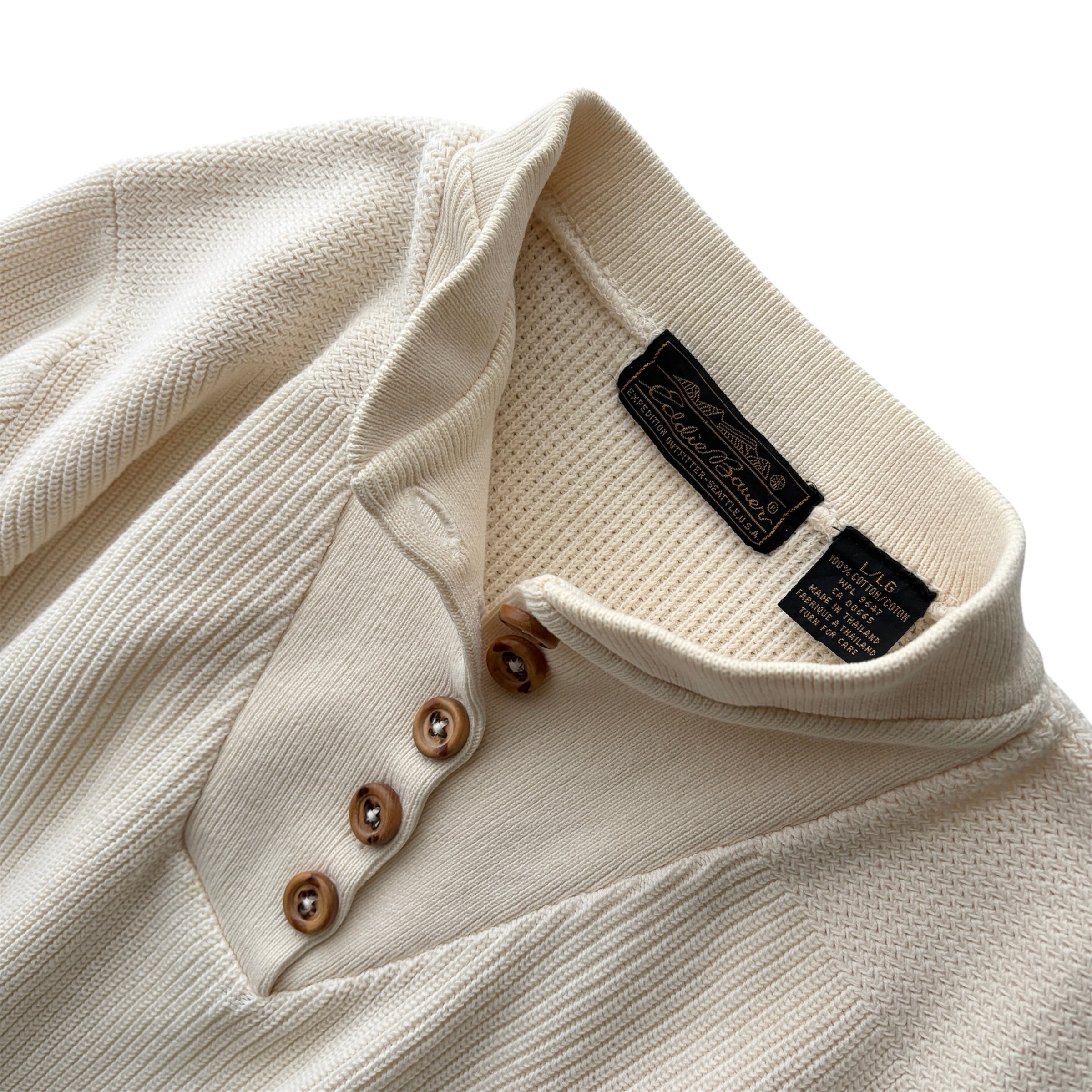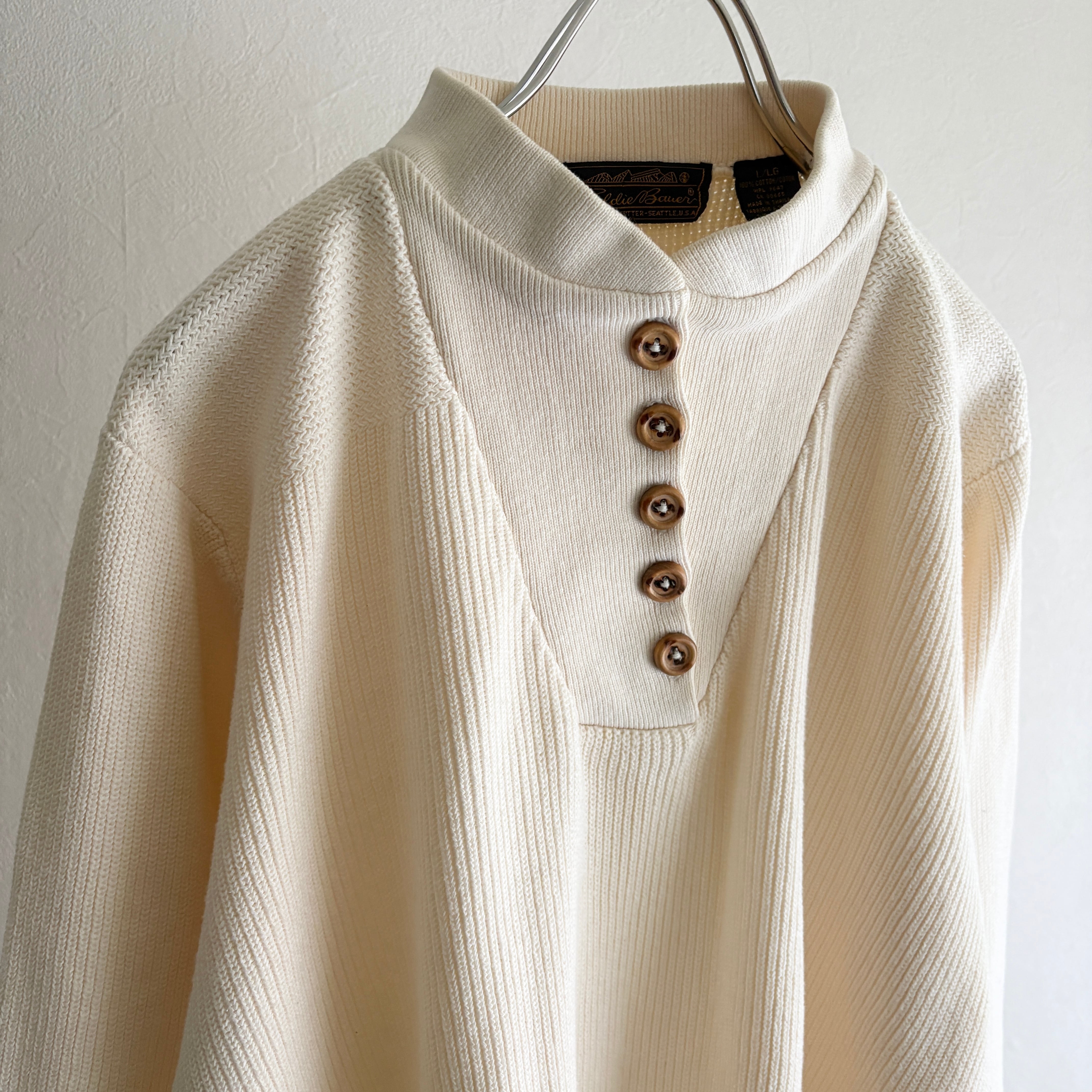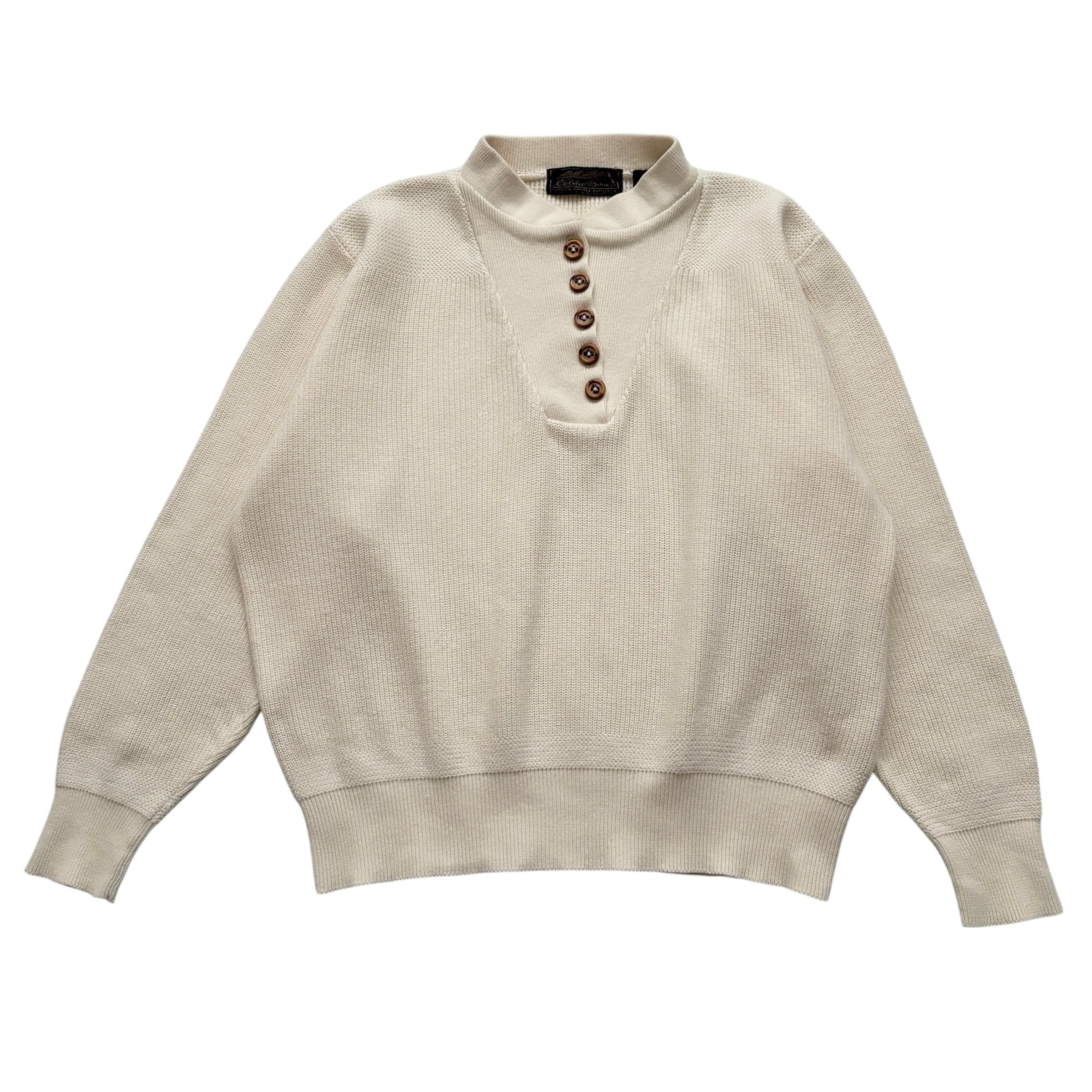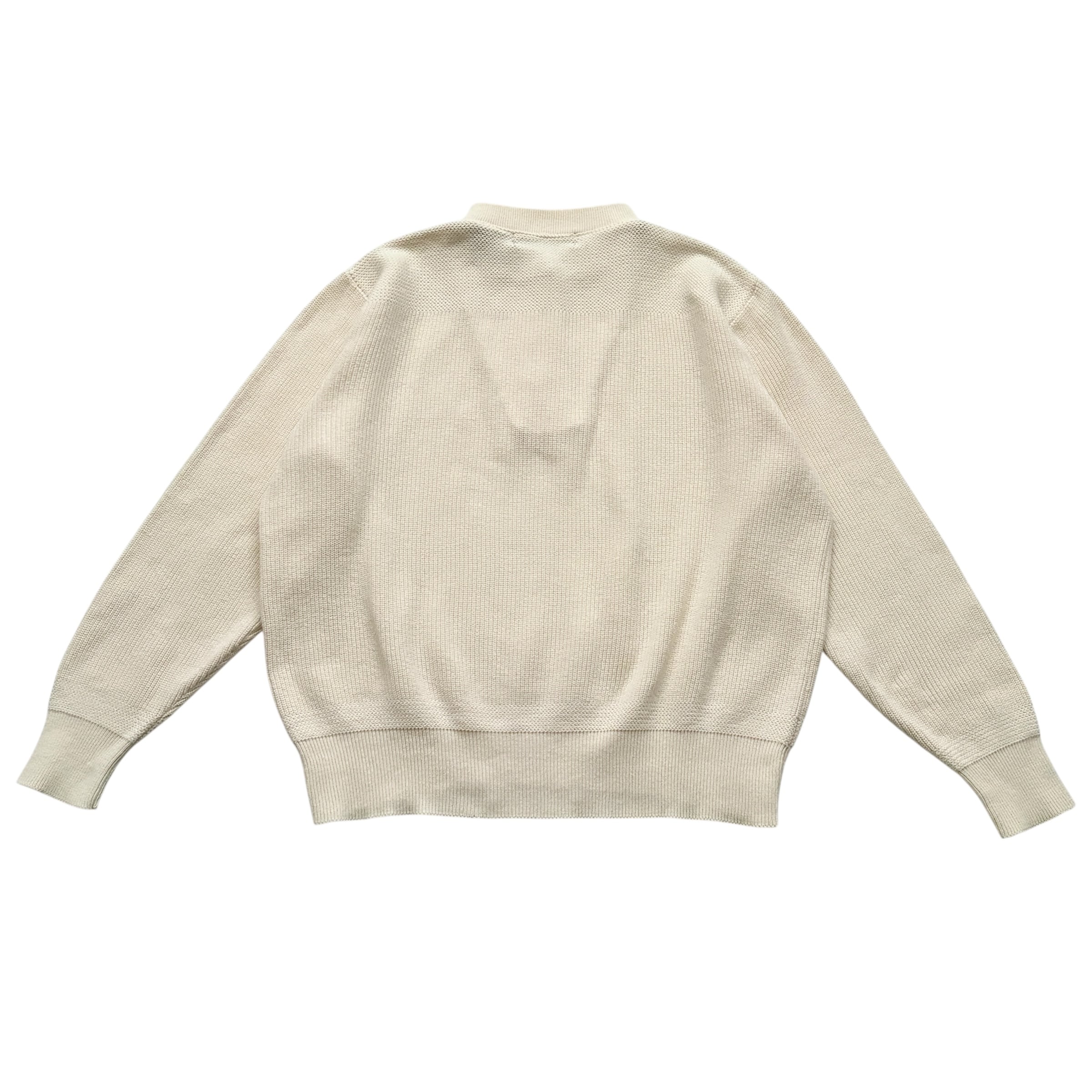 フロントのウッドボタンとアイボリーカラーのコットン素材がナチュラルな印象のニット。