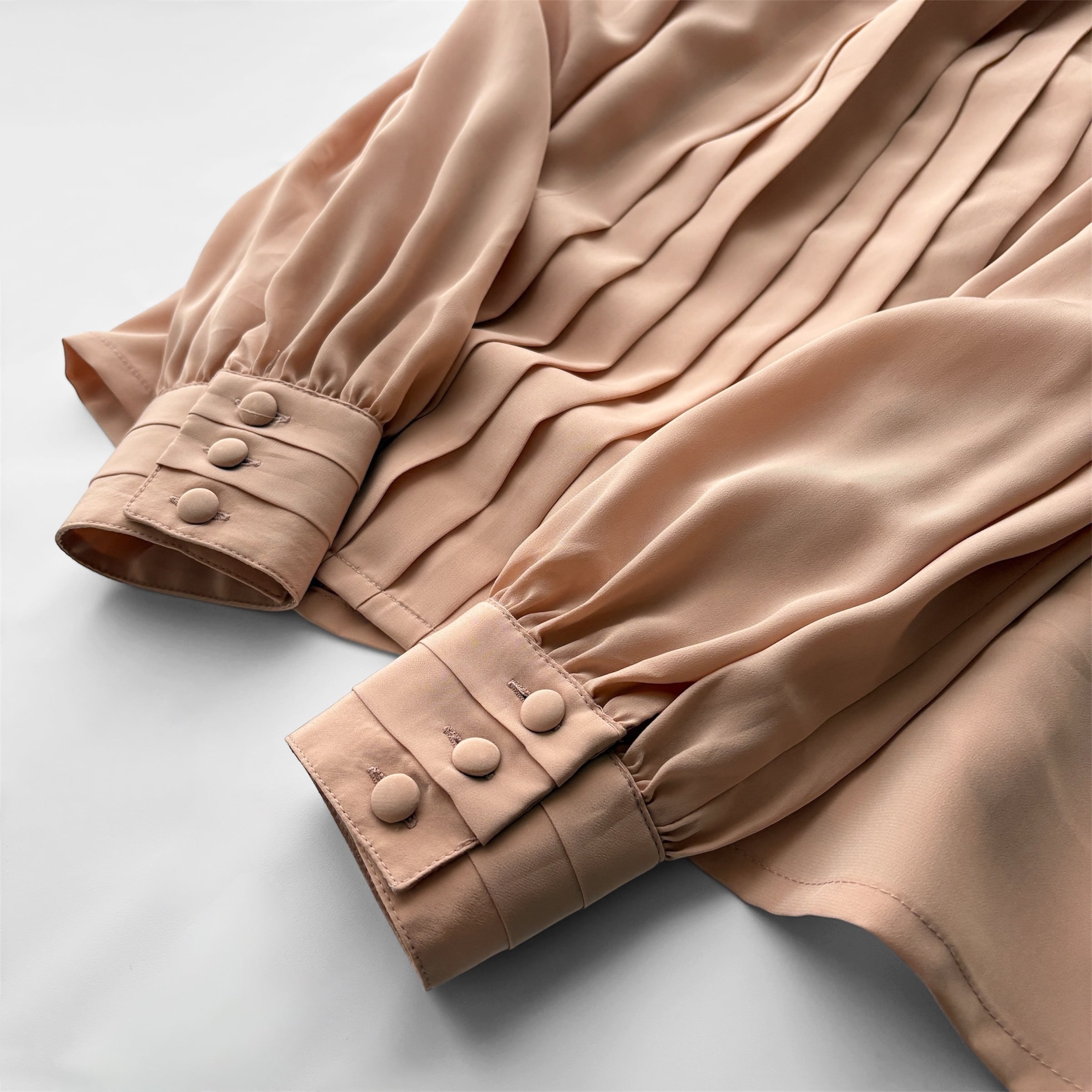 ふんわりとしたシルエットながらフロントとカフスのプリーツですっきりとまとめられています。