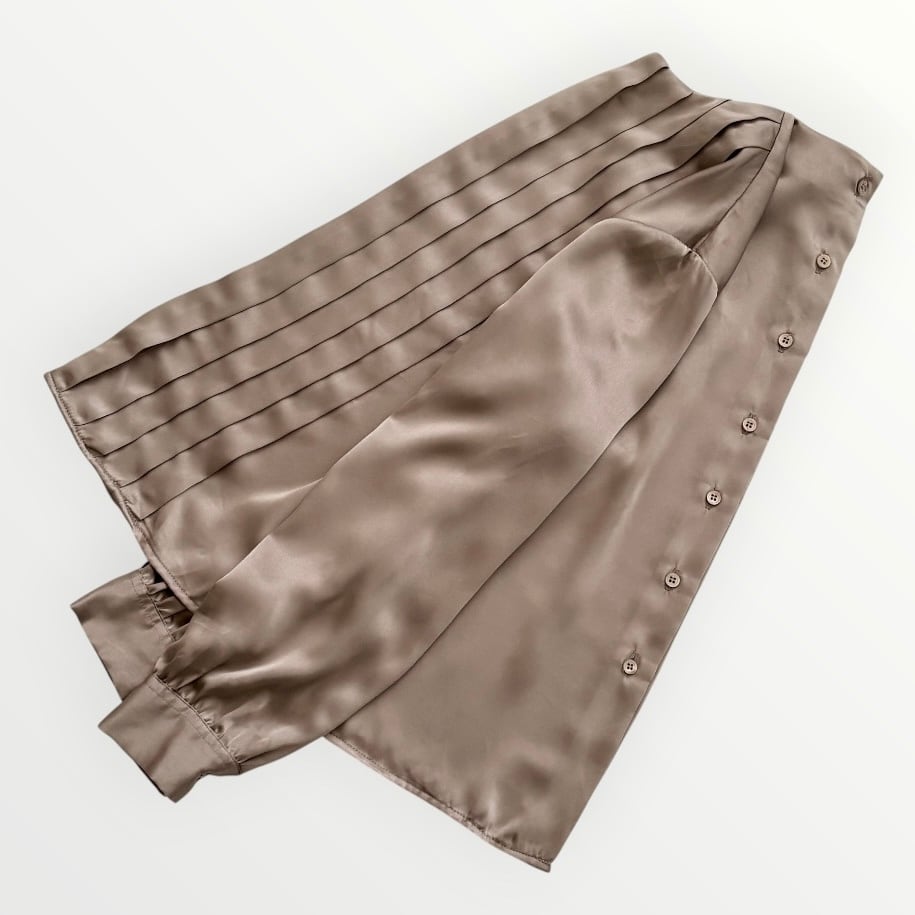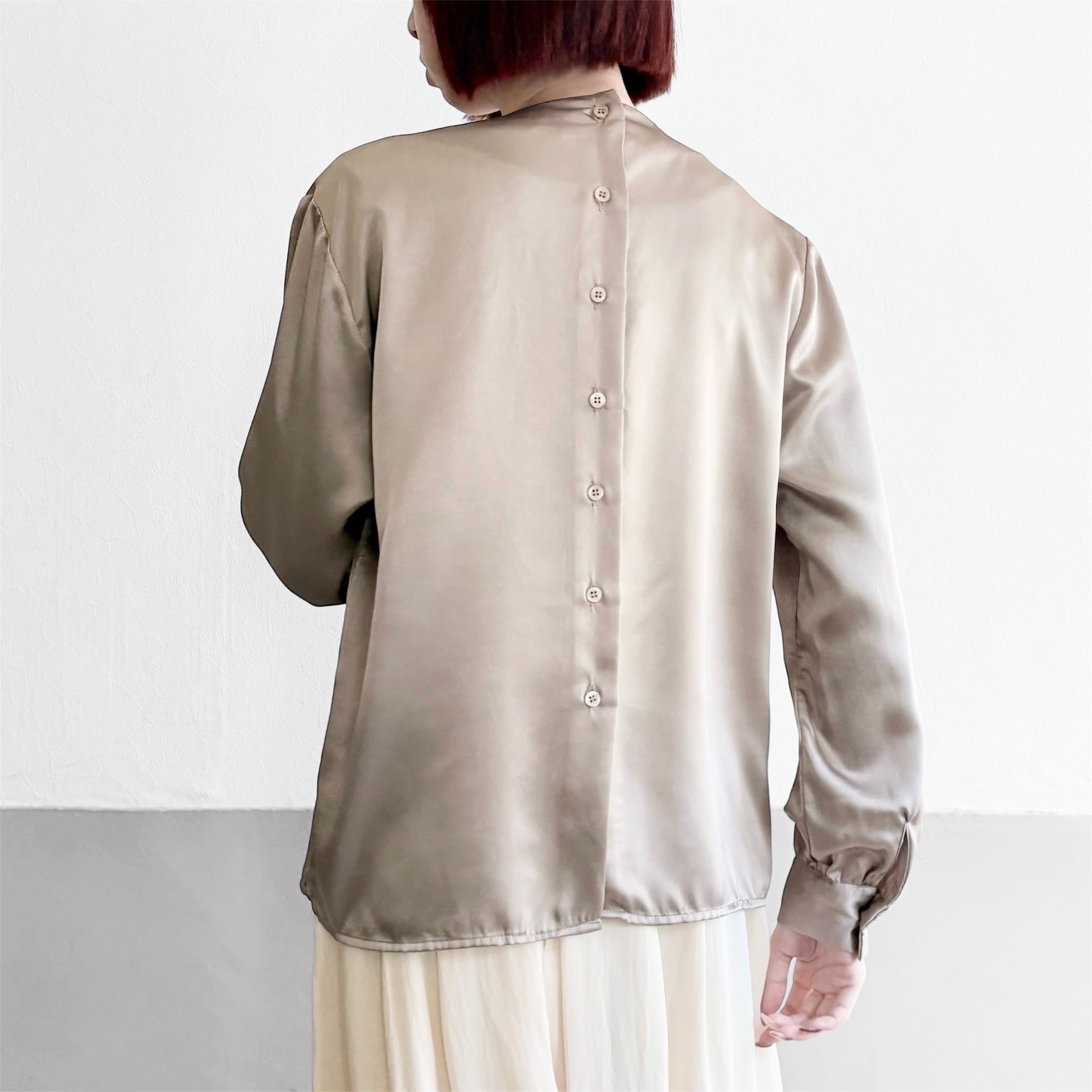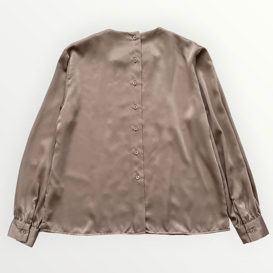 落ち着いた光沢と柔らかなくすみカラーが品のあるブラウス。