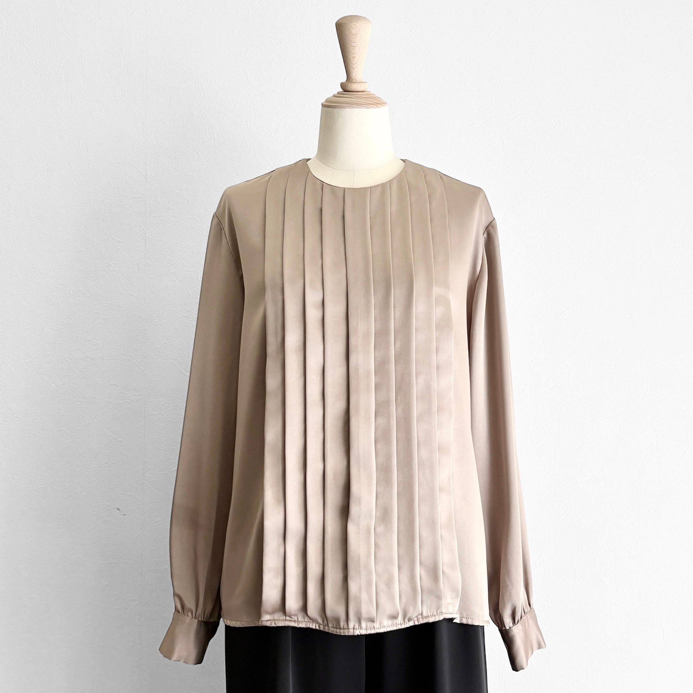 ラウンドネック、フロントプリーツ、バックボタンですっきりとまとまるデザイン。