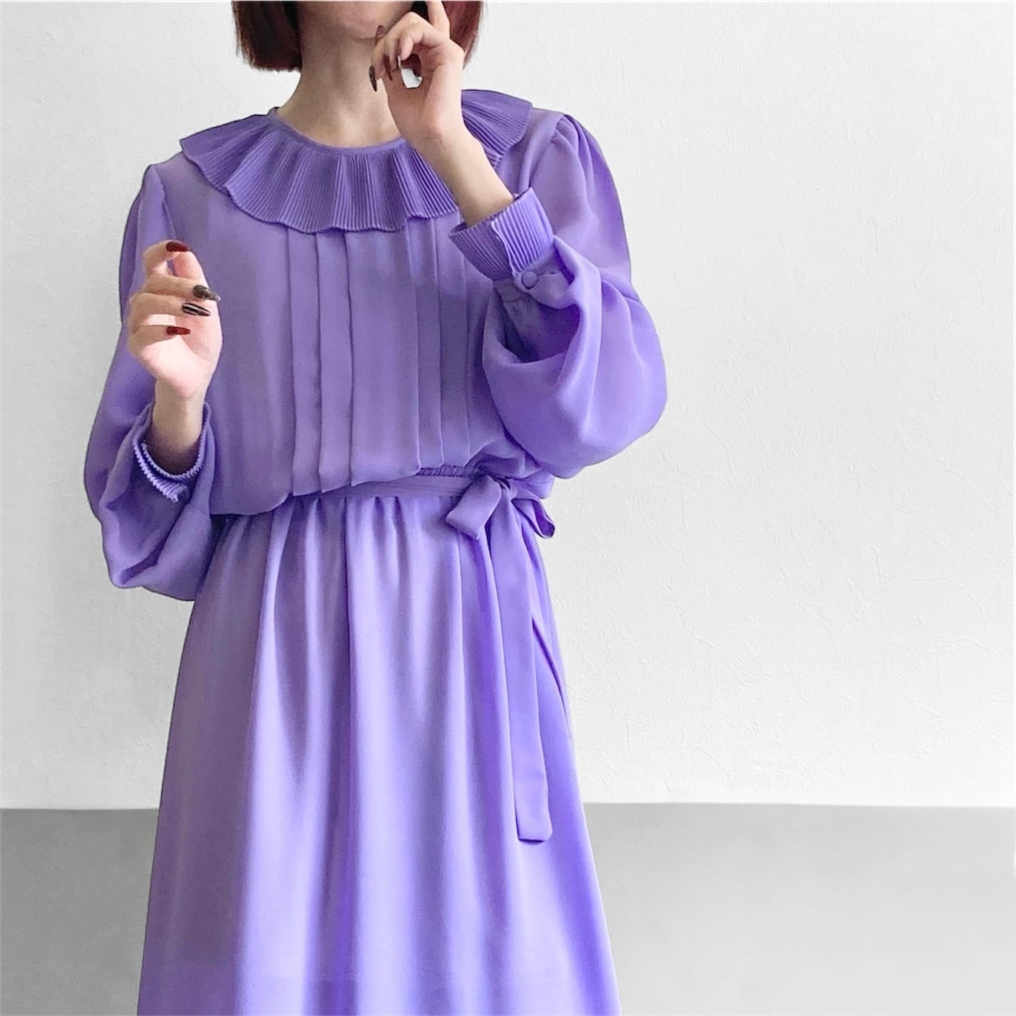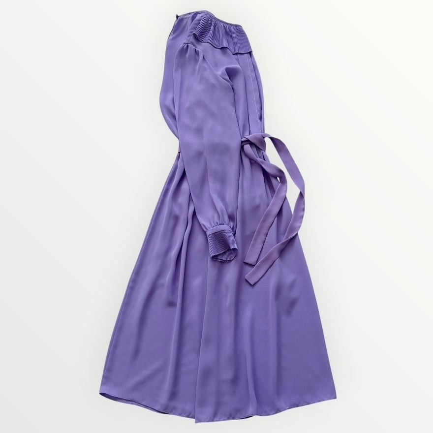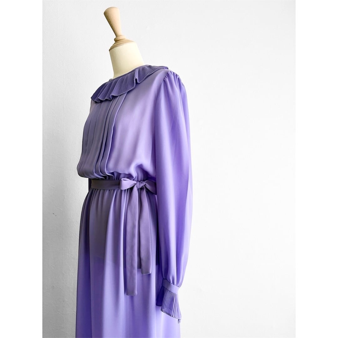 繊細なアコーディオンプリーツが施された襟と袖口、パープルカラーが美しいヴィンテージワンピース。