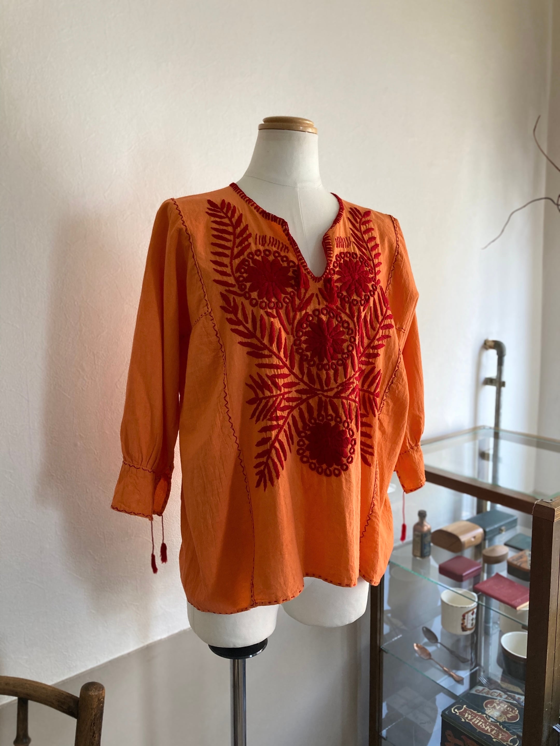 ヴィヴィッドなオレンジカラー刺繍ブラウス。