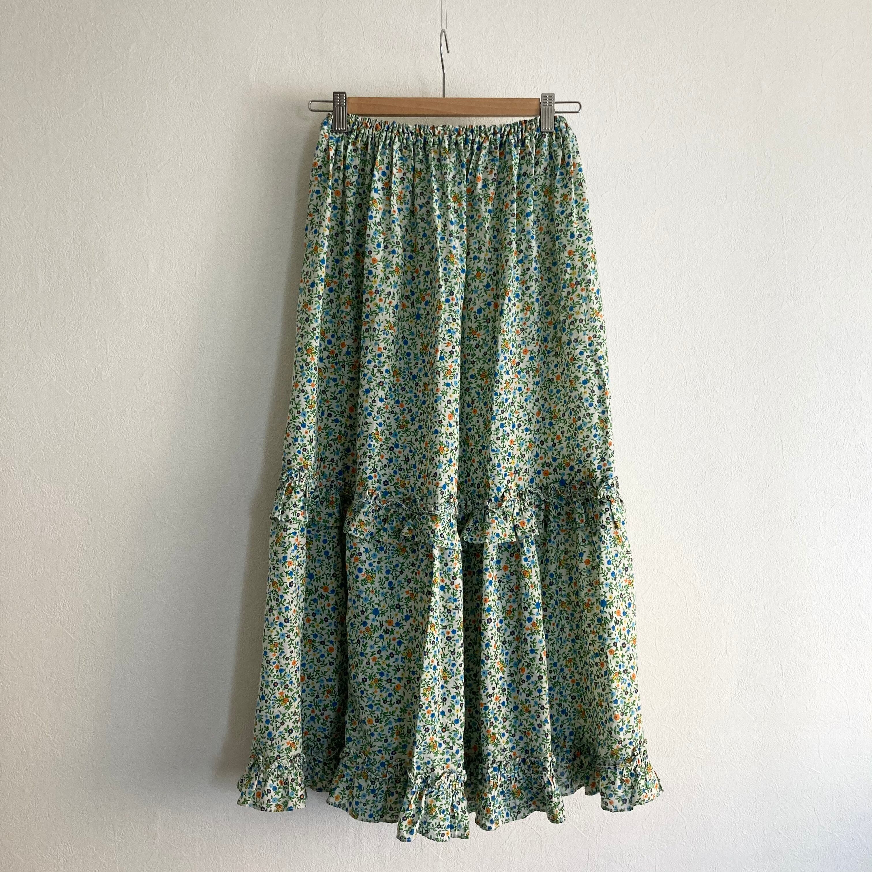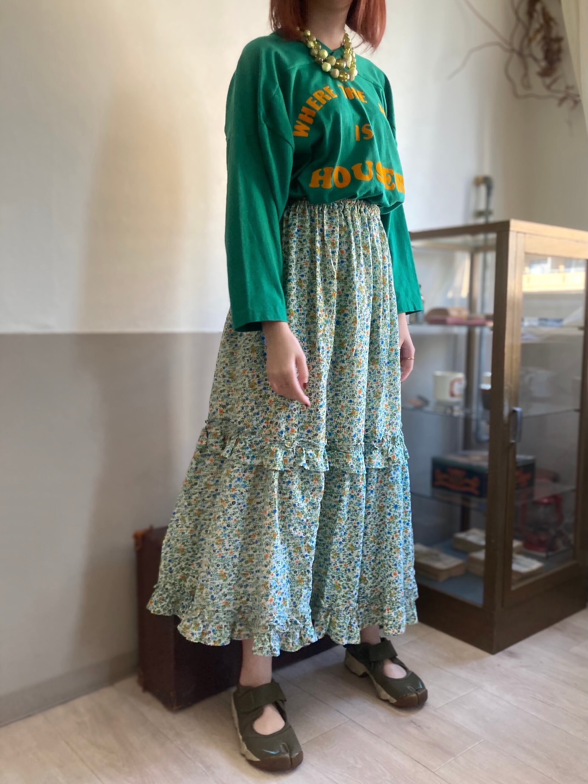 グリーンベースのティアードロングスカート。