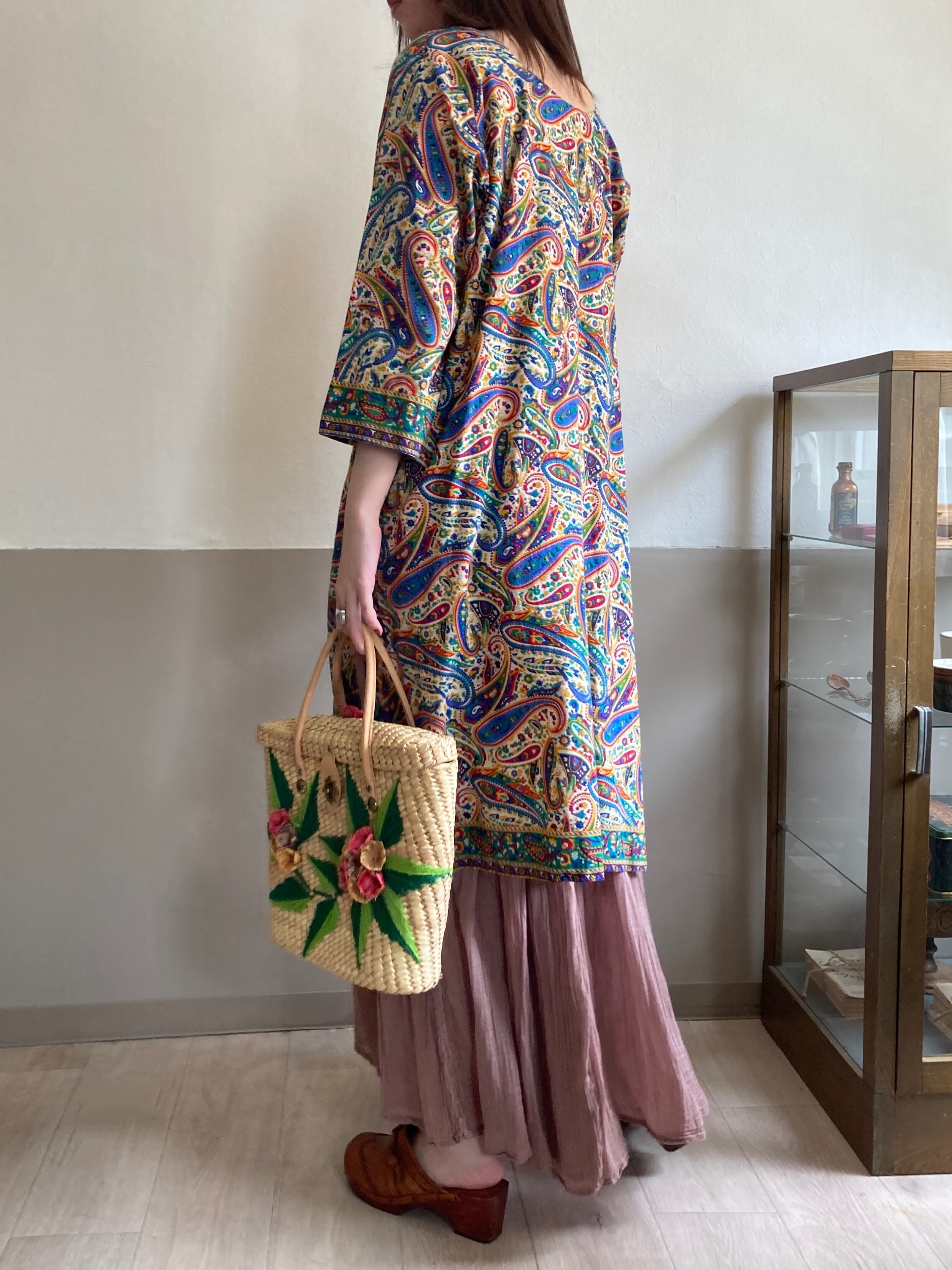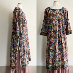 ベージュベースにビビッドカラーのペイズリー柄が配されたカフタンワンピース。