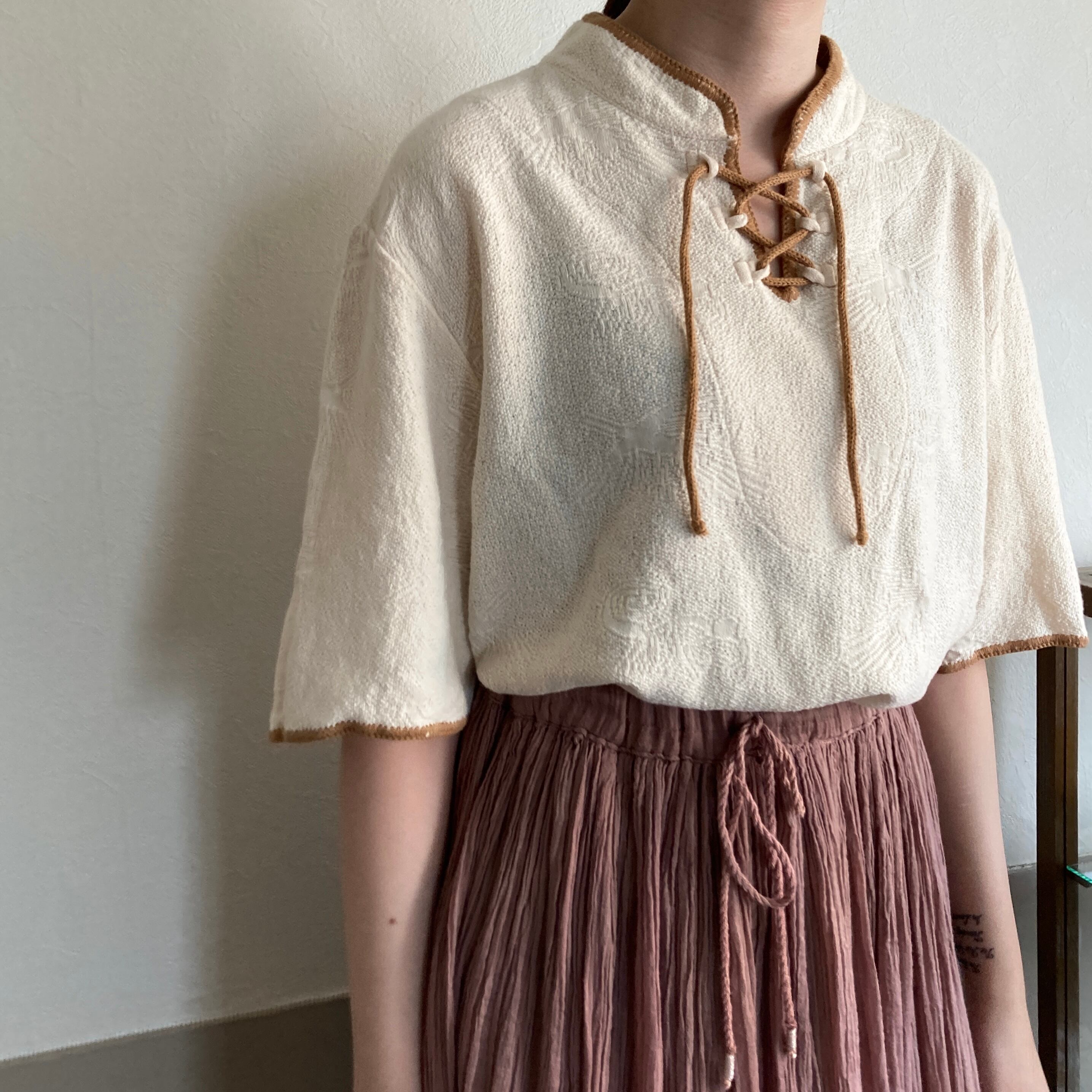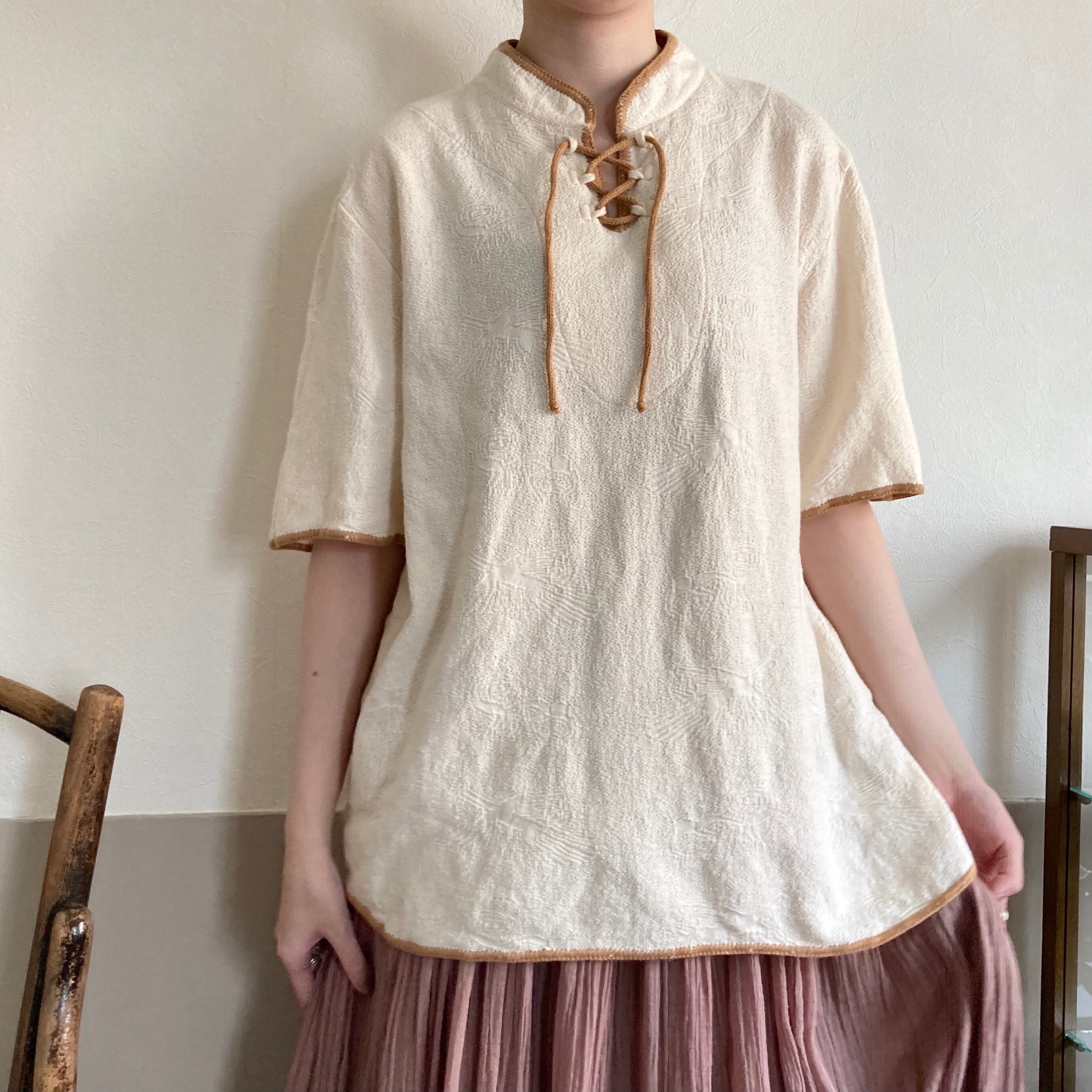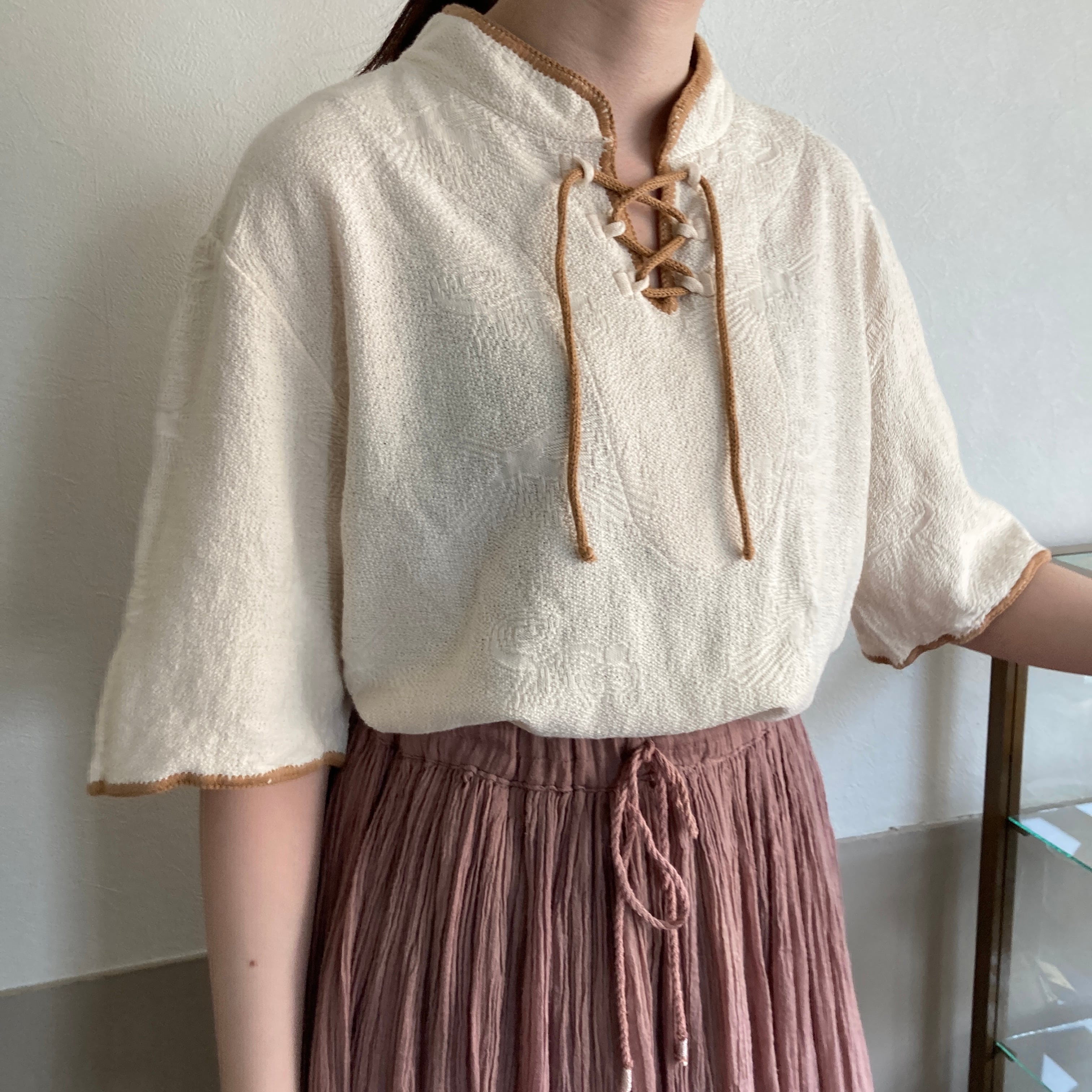 ブラウンのレースアップとスタンドカラーがアクセントのプルオーバートップス。