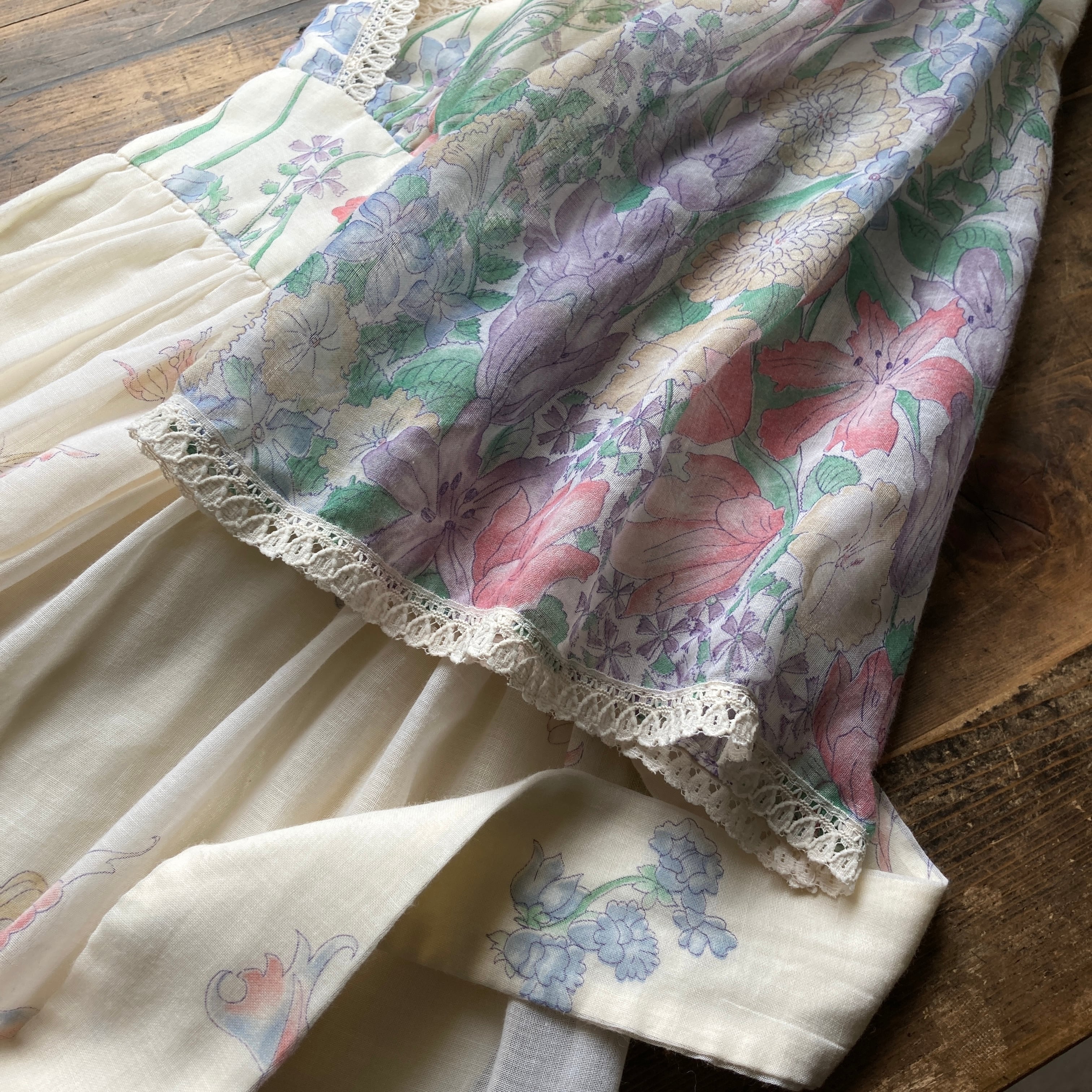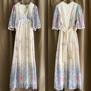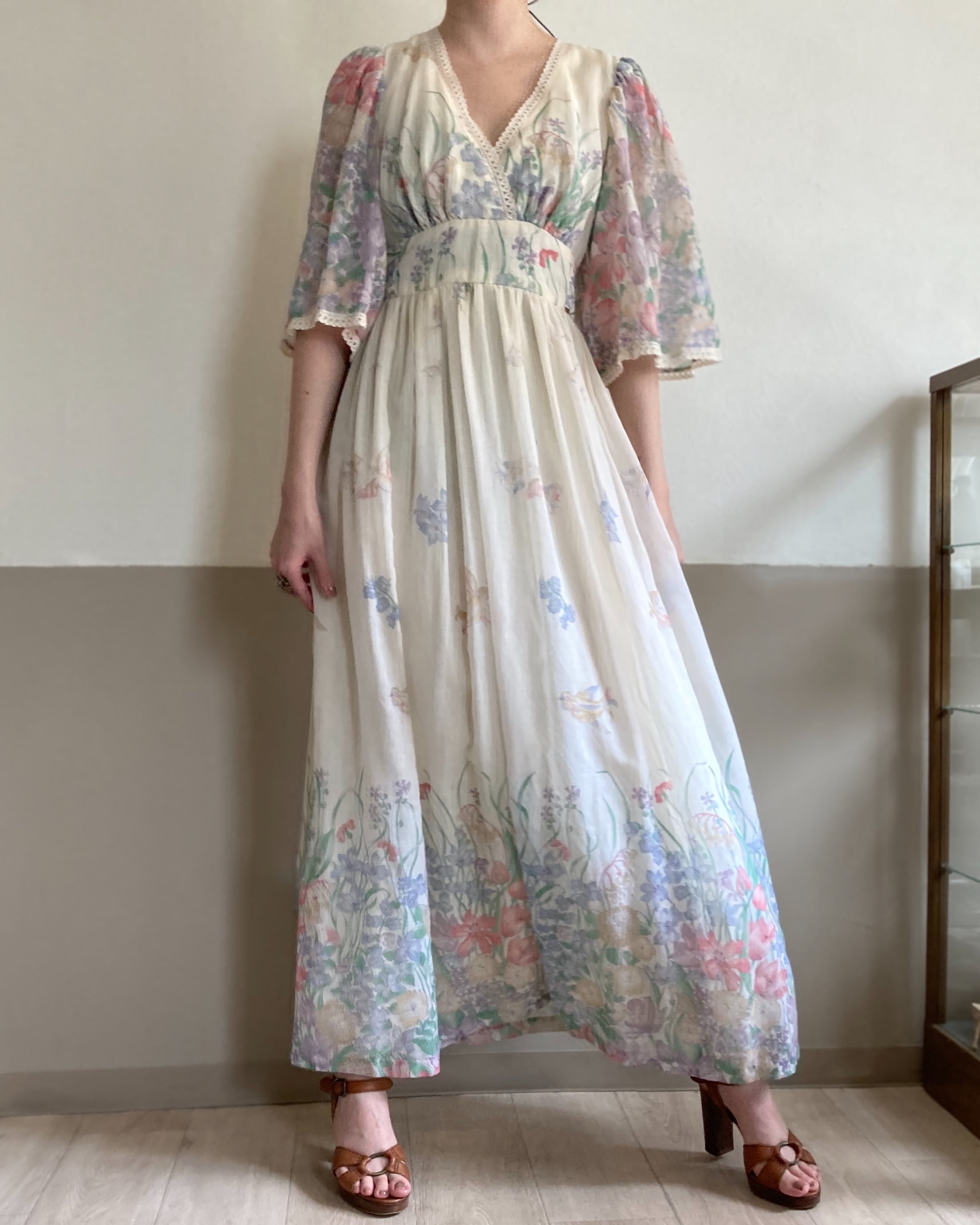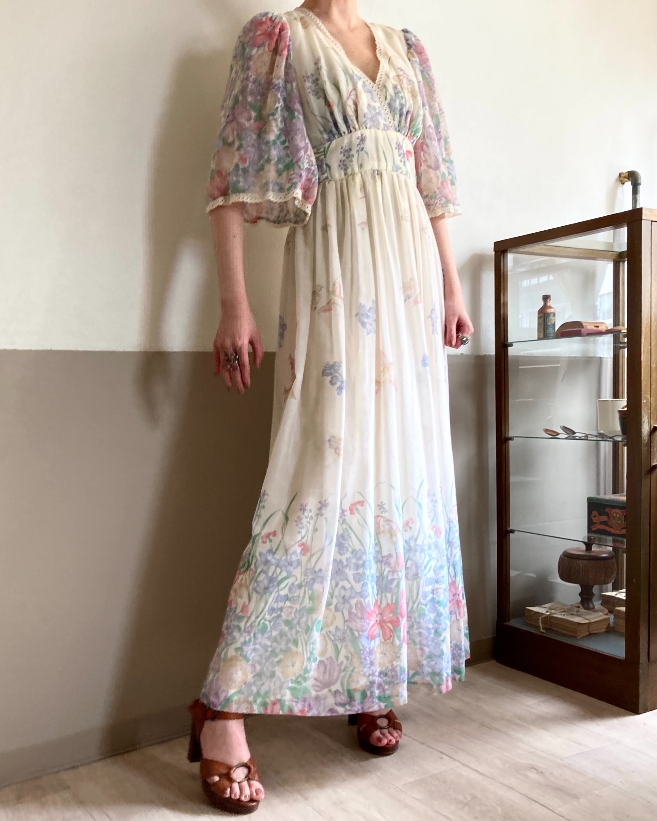 ベルスリーブの動く様や、レースのトリミングなども表情豊かなワンピース。