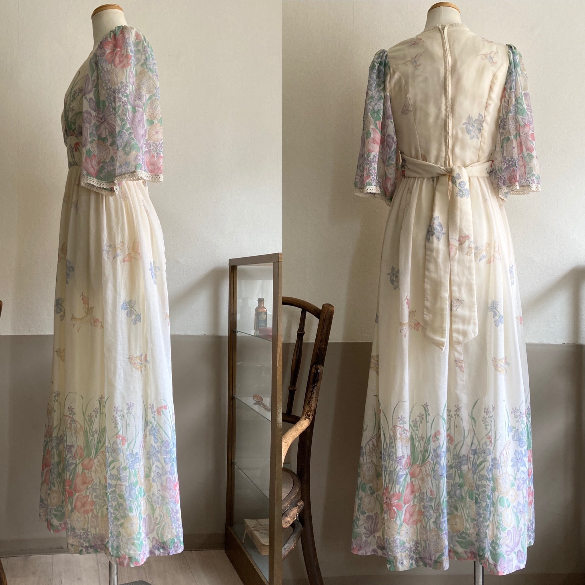 アイボリーカラーの透け感ある軽やかな素材に、繊細な植物とふわふわ舞う鳥のプリント。