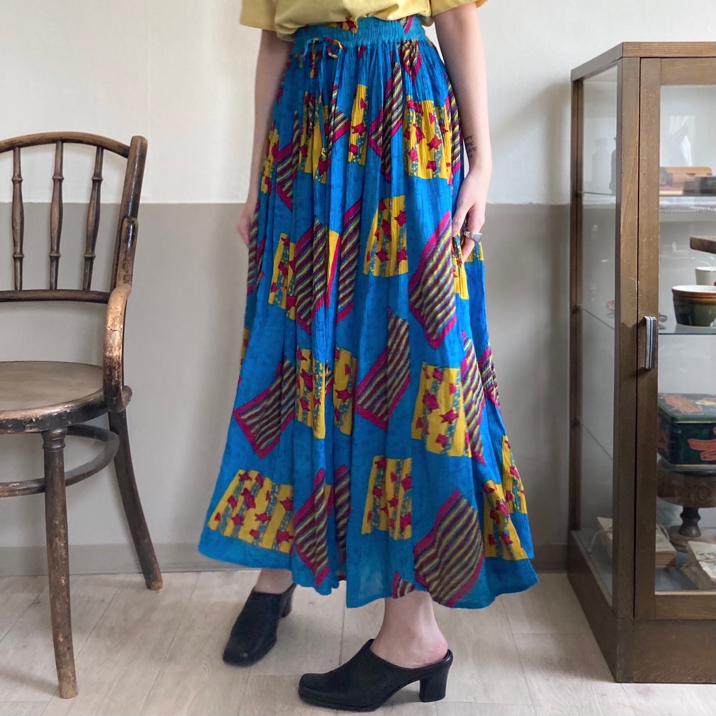 スクエア型の抽象的な模様が楽しいスカート。