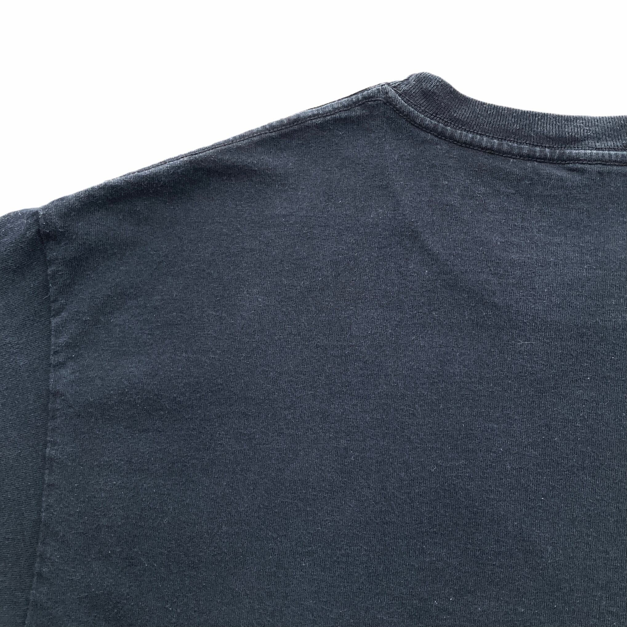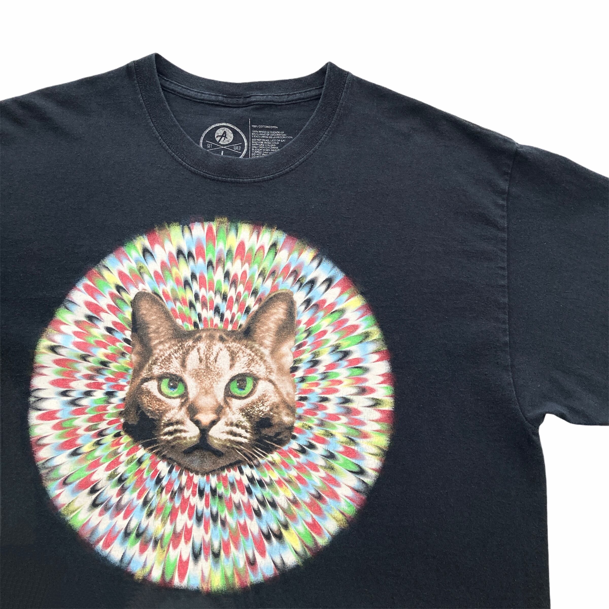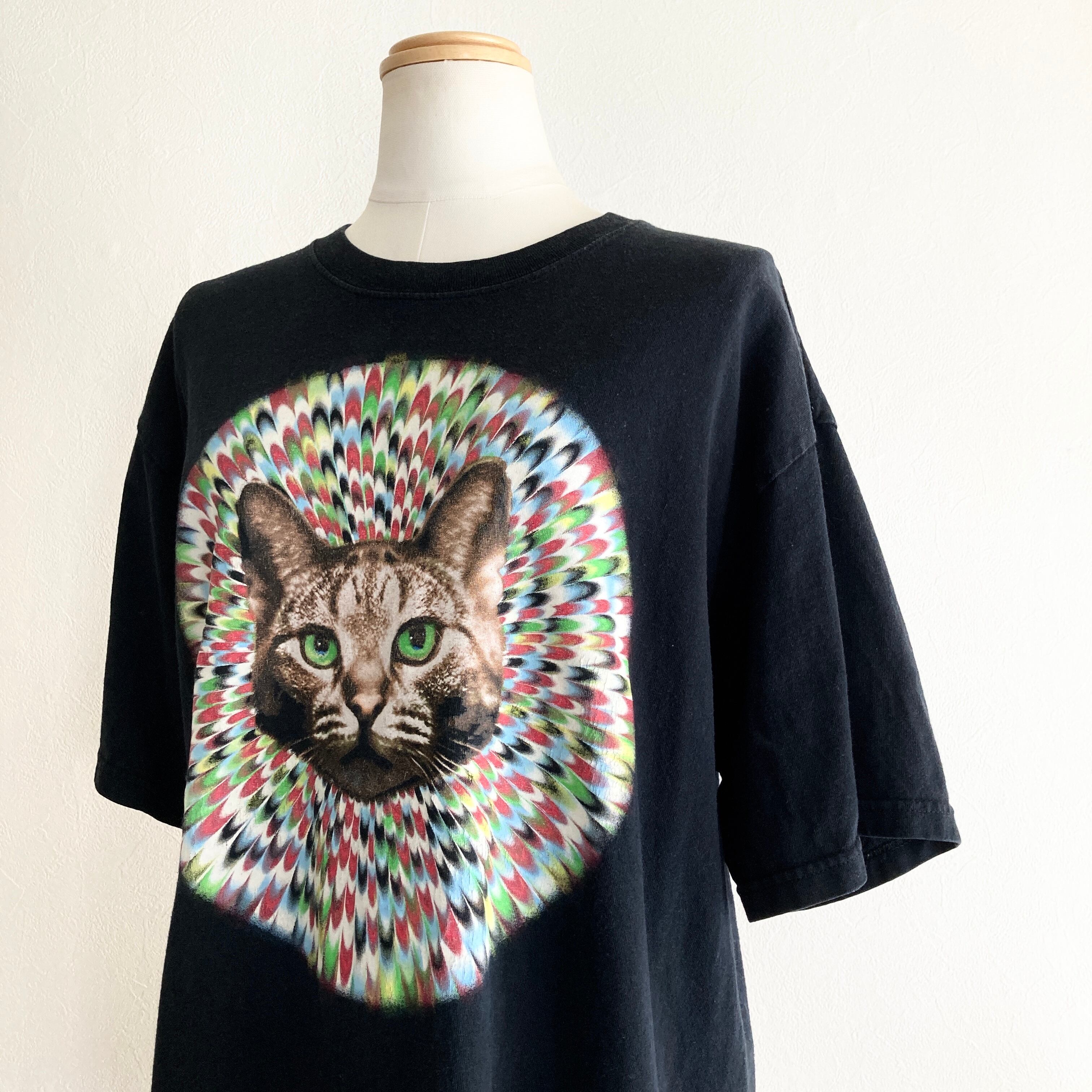 サイケデリックな模様をバックにねこが配されたTシャツ。