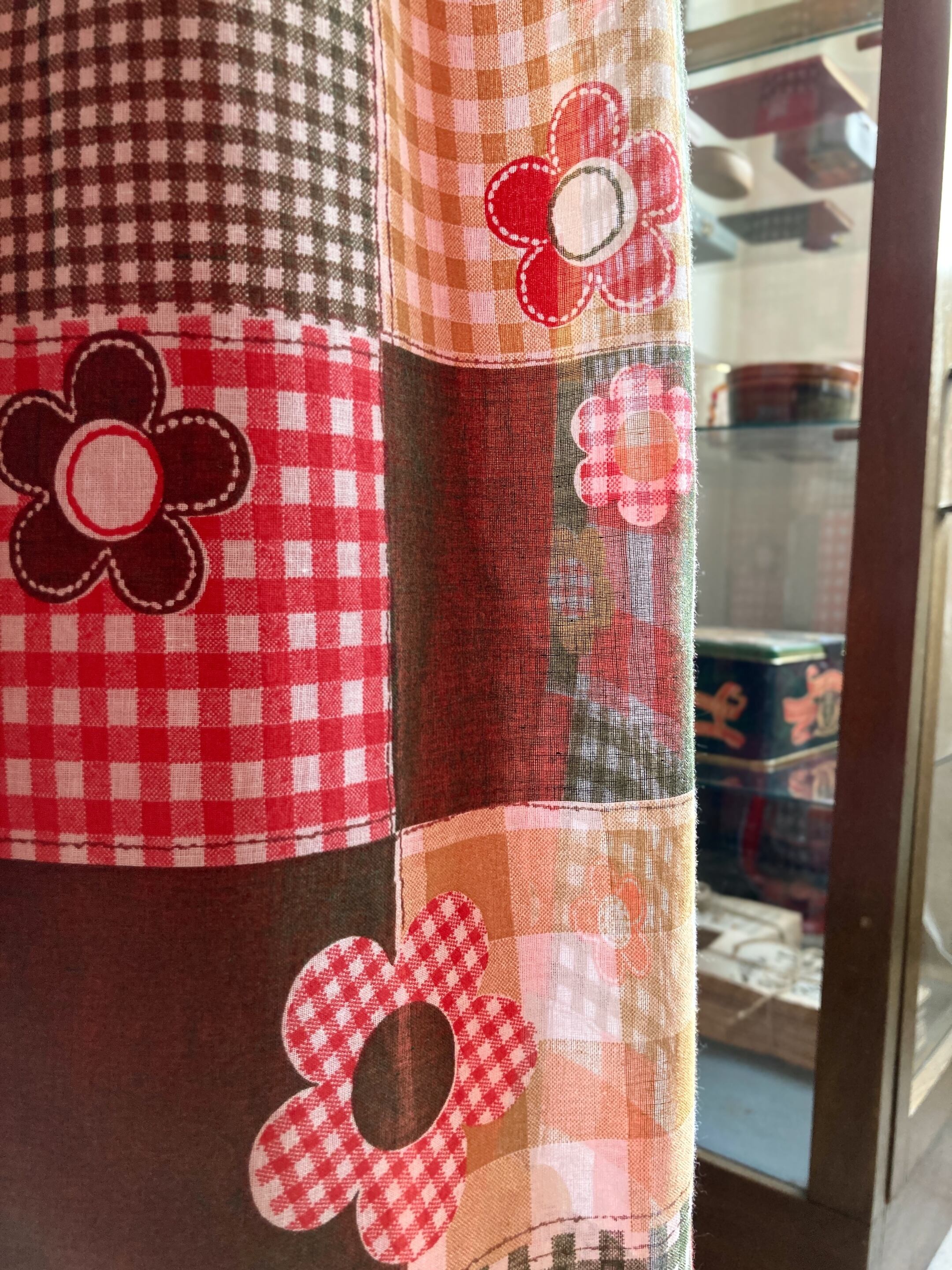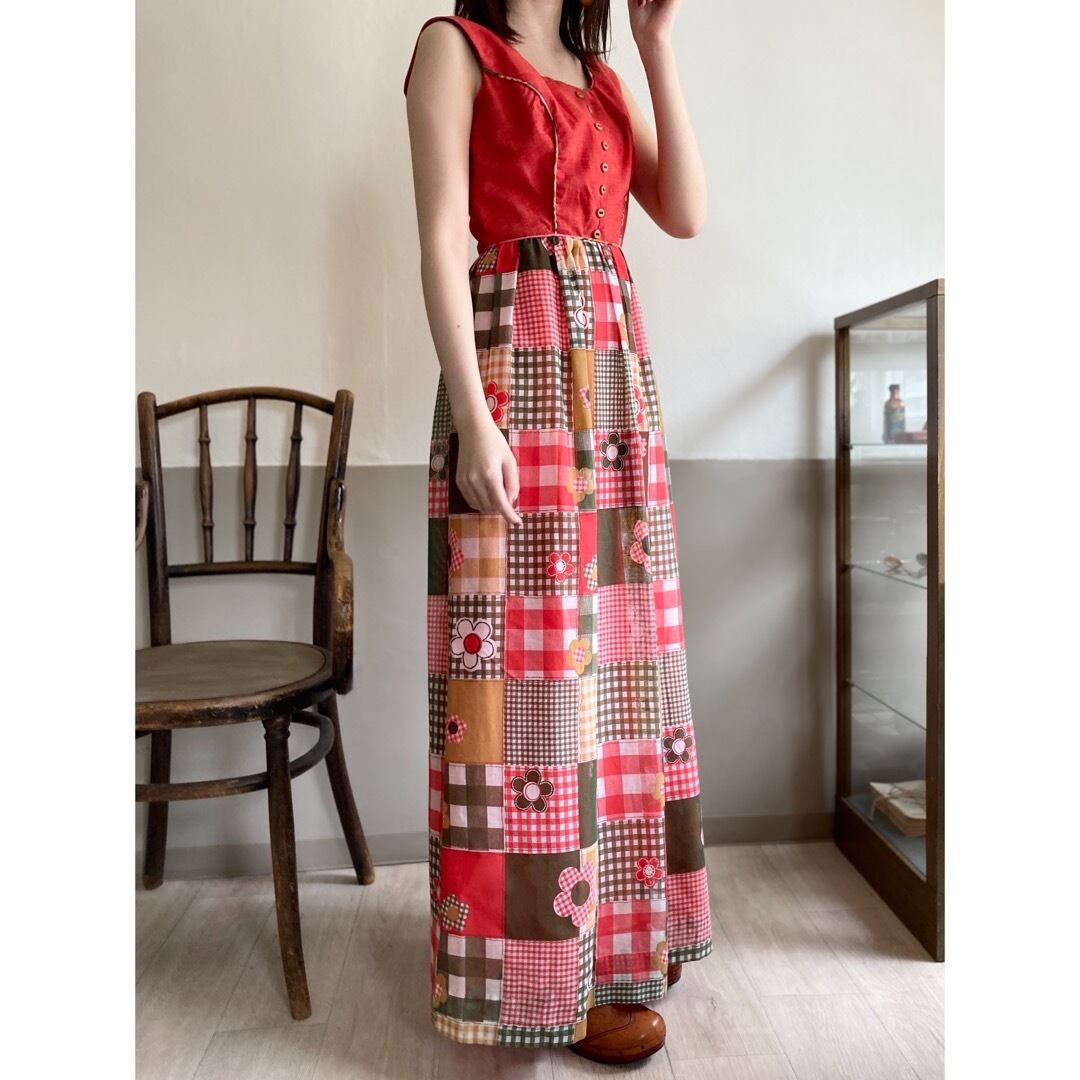 パッチワークのようなハッピーなプリントやカラーリングがヴィンテージらしいマキシワンピース。