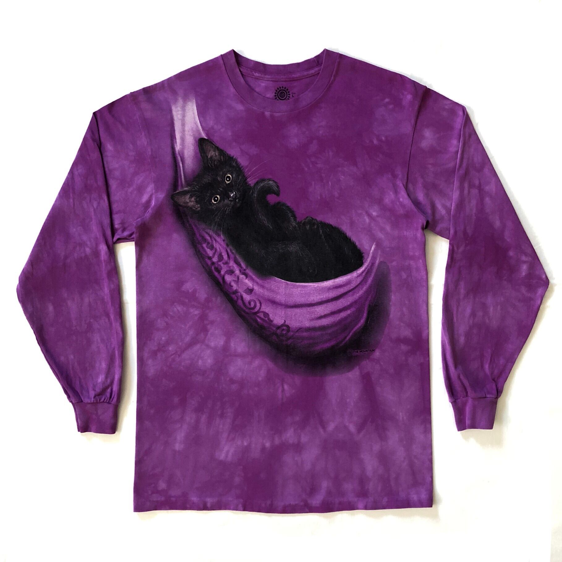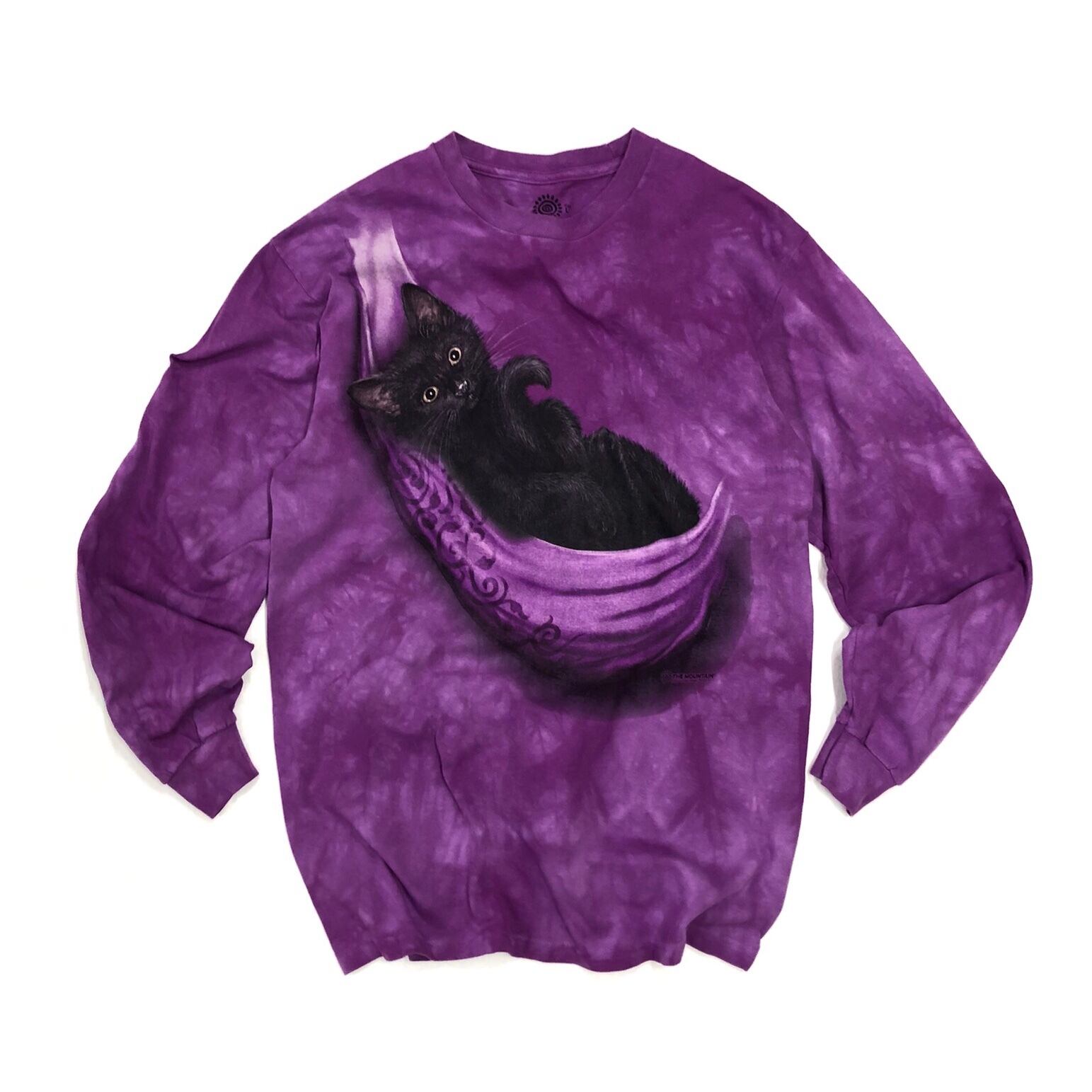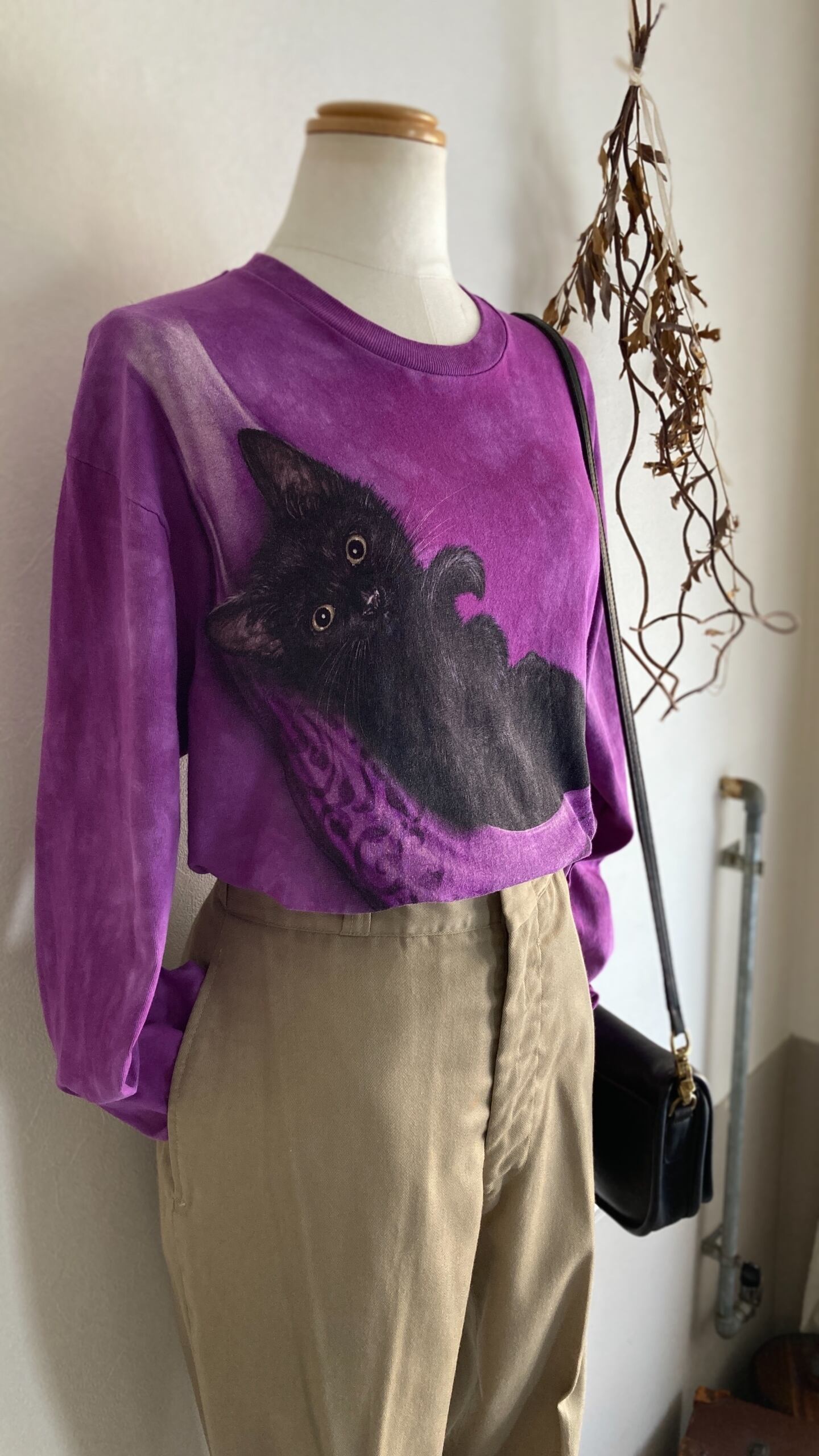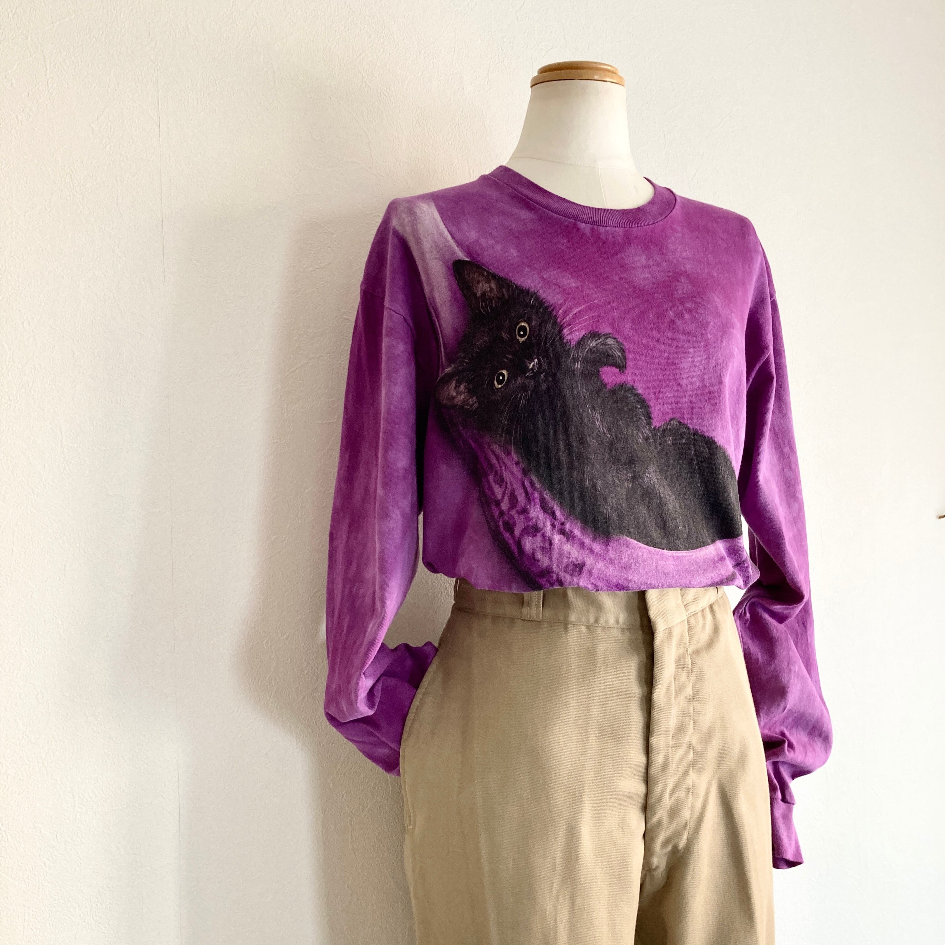 パープルカラーのタイダイ素材に黒ネコちゃんがプリントされたTシャツ。