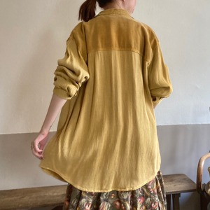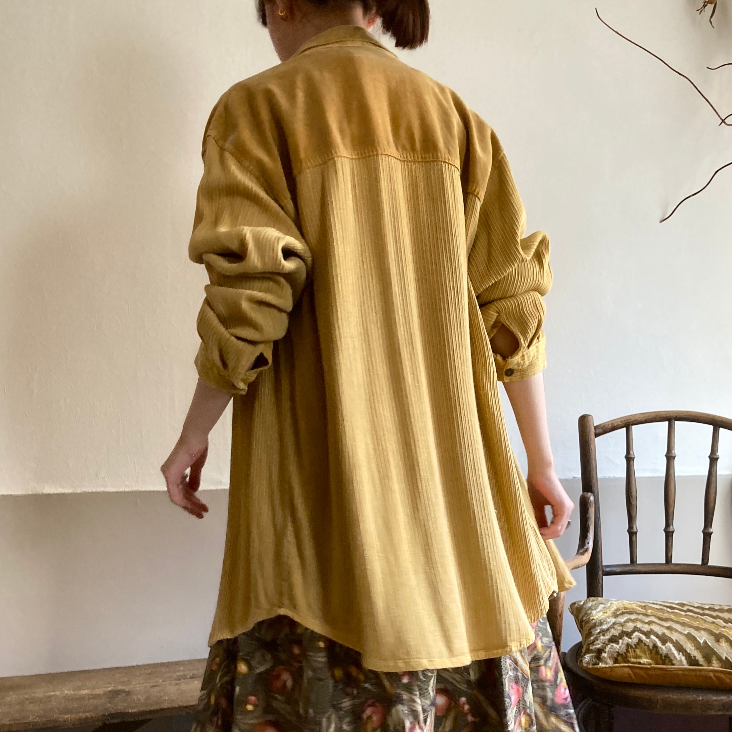 発色良いカラーが褪色し、程よいくすみ具合が味わい深い、マスタードのオーバーサイズシャツ。
