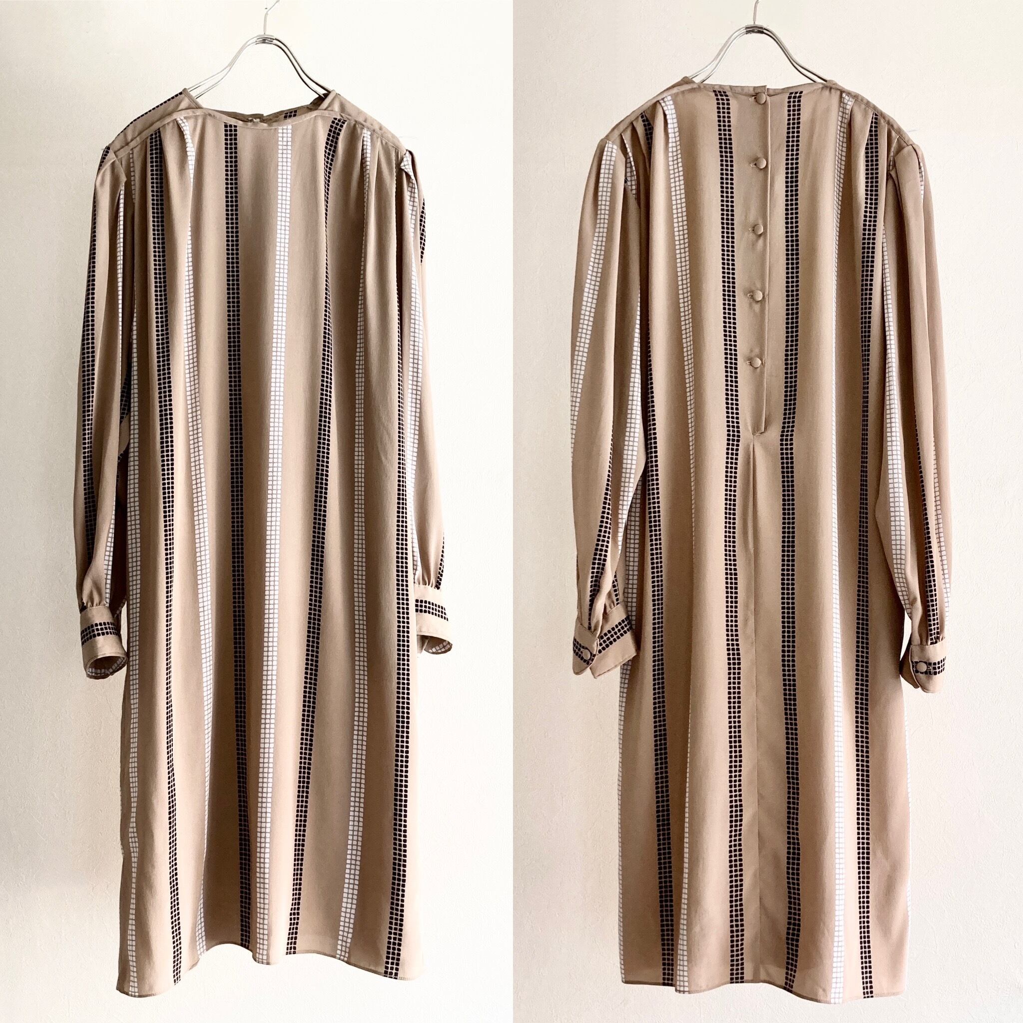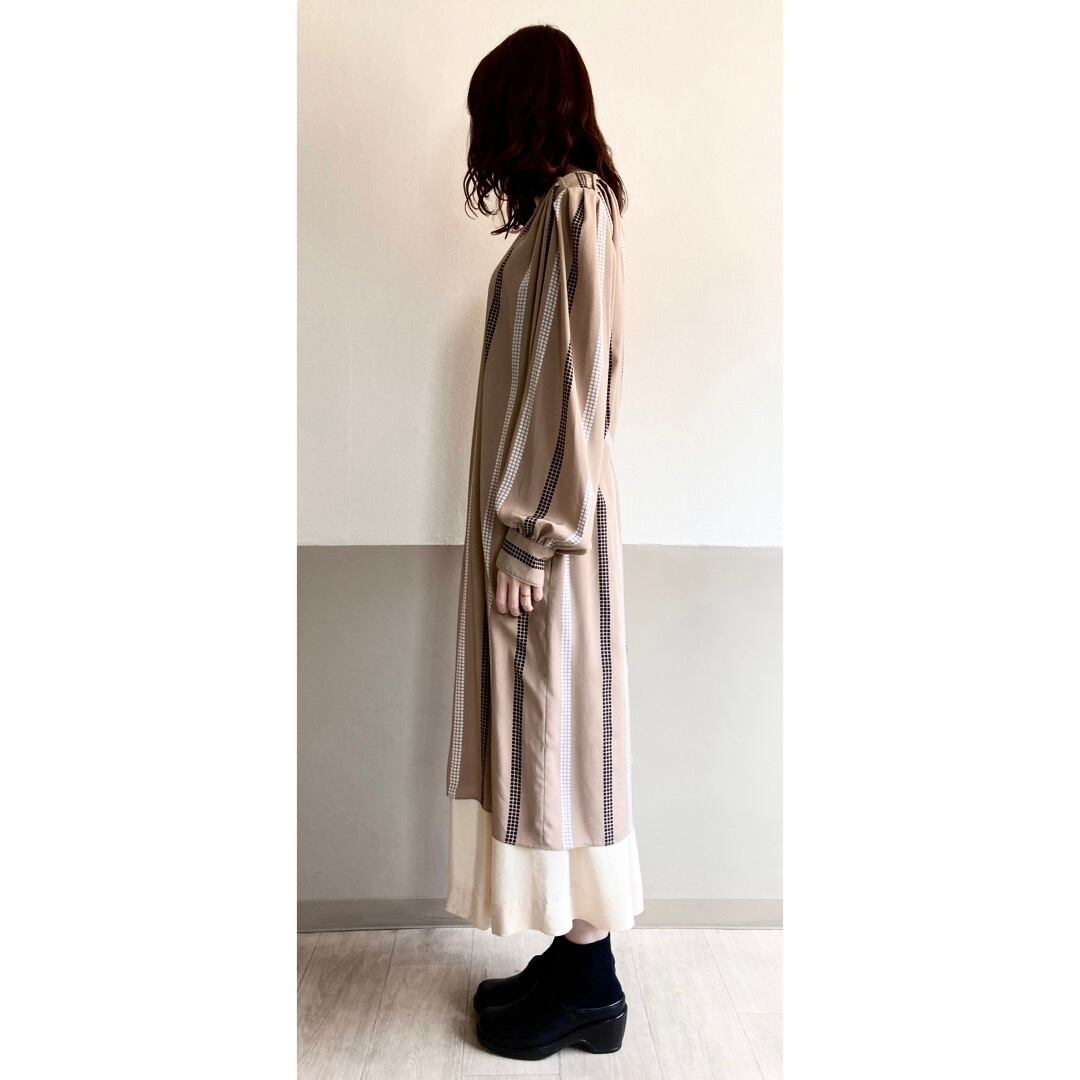 手書き風のスクエア柄が集まったストライプ、バックのくるみボタンがリズミカル。