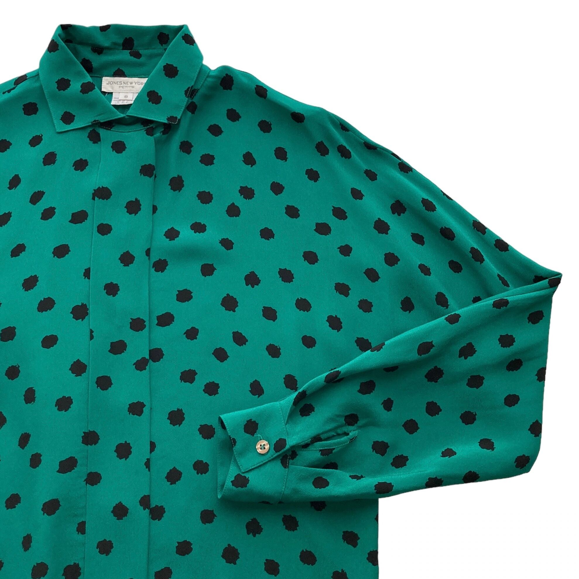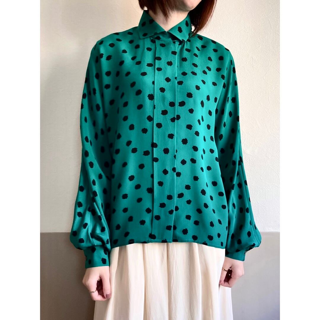 美しい発色のグリーンにドットのような抽象柄がアクセントのブラウス。