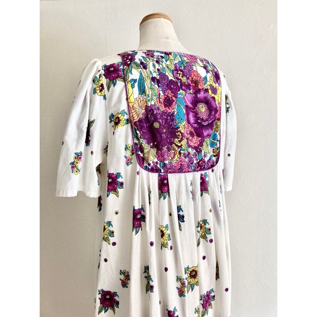 美しいパープルのボタニカル柄が印象的なワンピース。