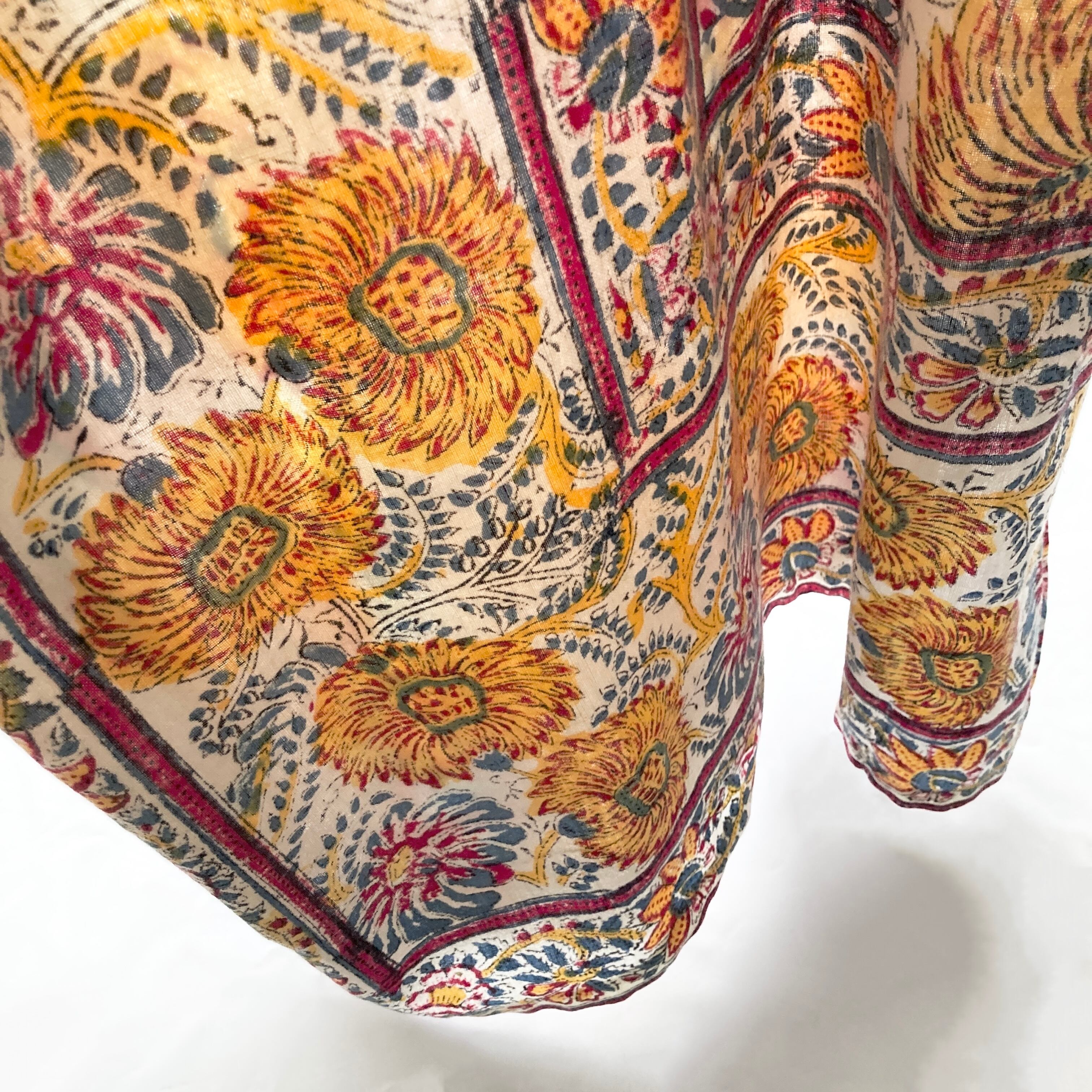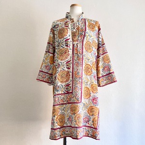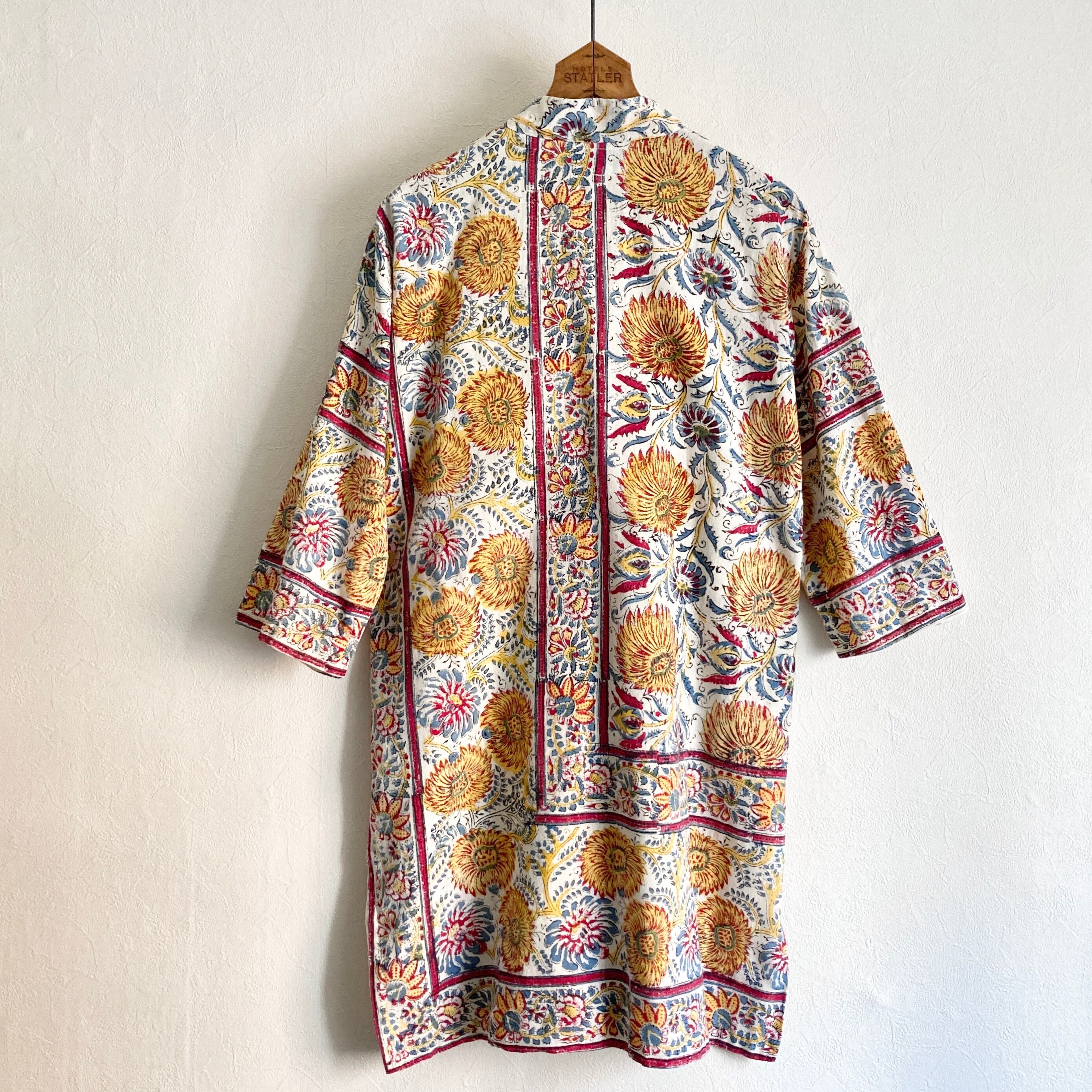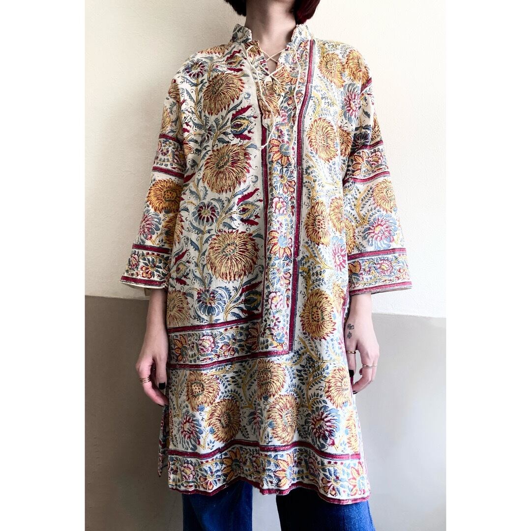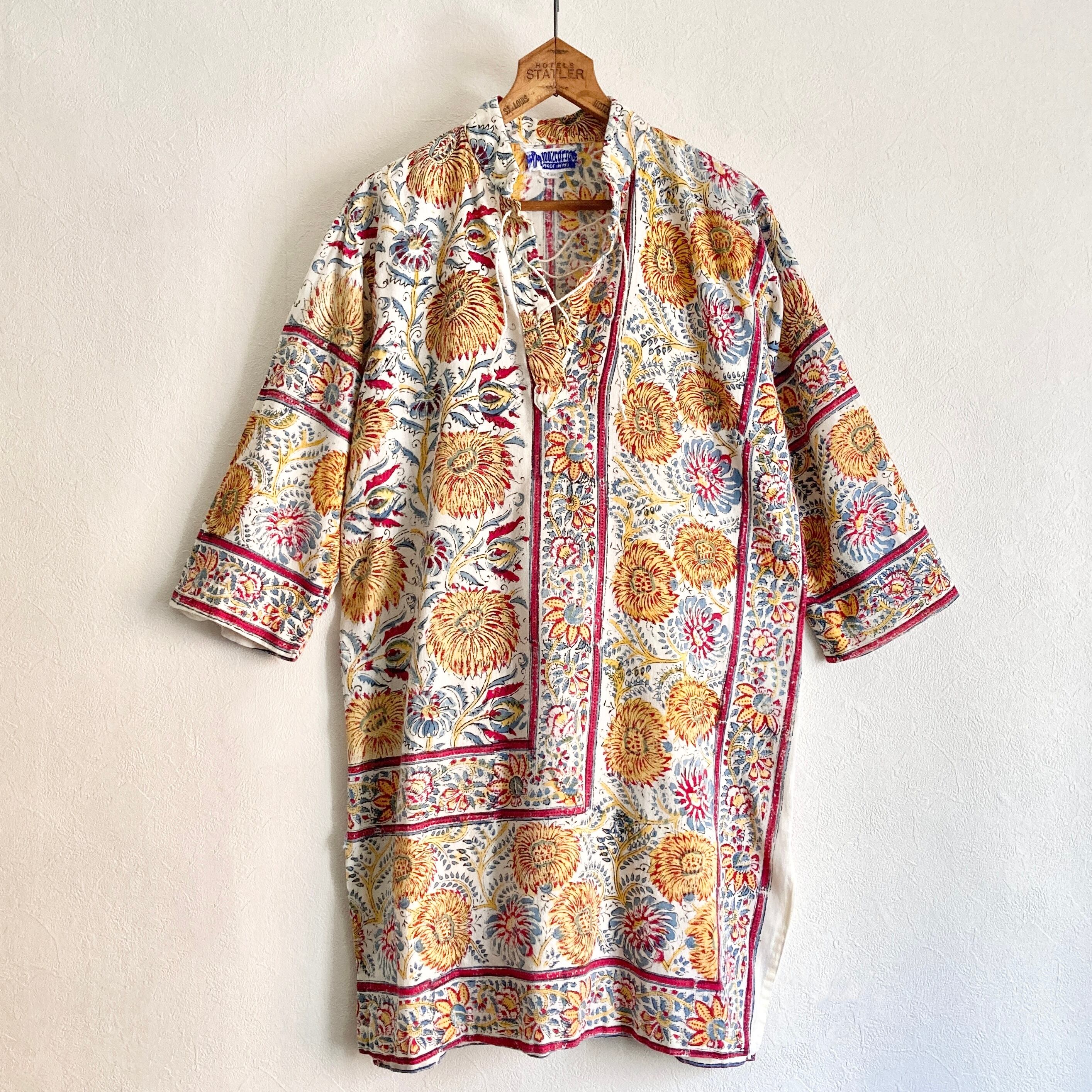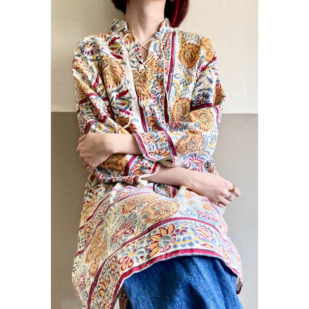 カラーリングや柄の配置が独特なヴィンテージらしさが楽しめる、インド綿ロングシャツ。