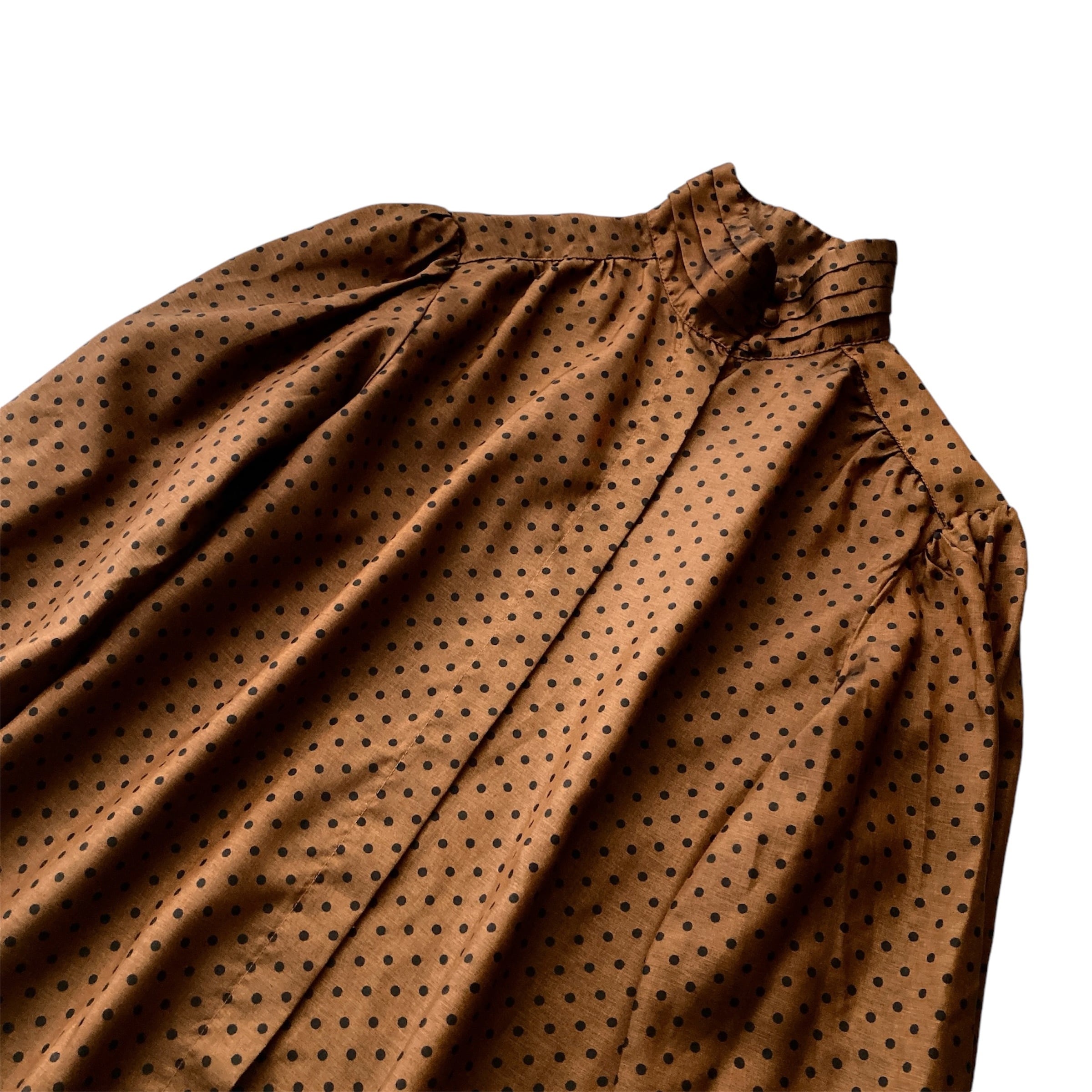 深みのあるブラウンカラー、光沢と張りのあるドット柄素材が存在感のあるブラウス。