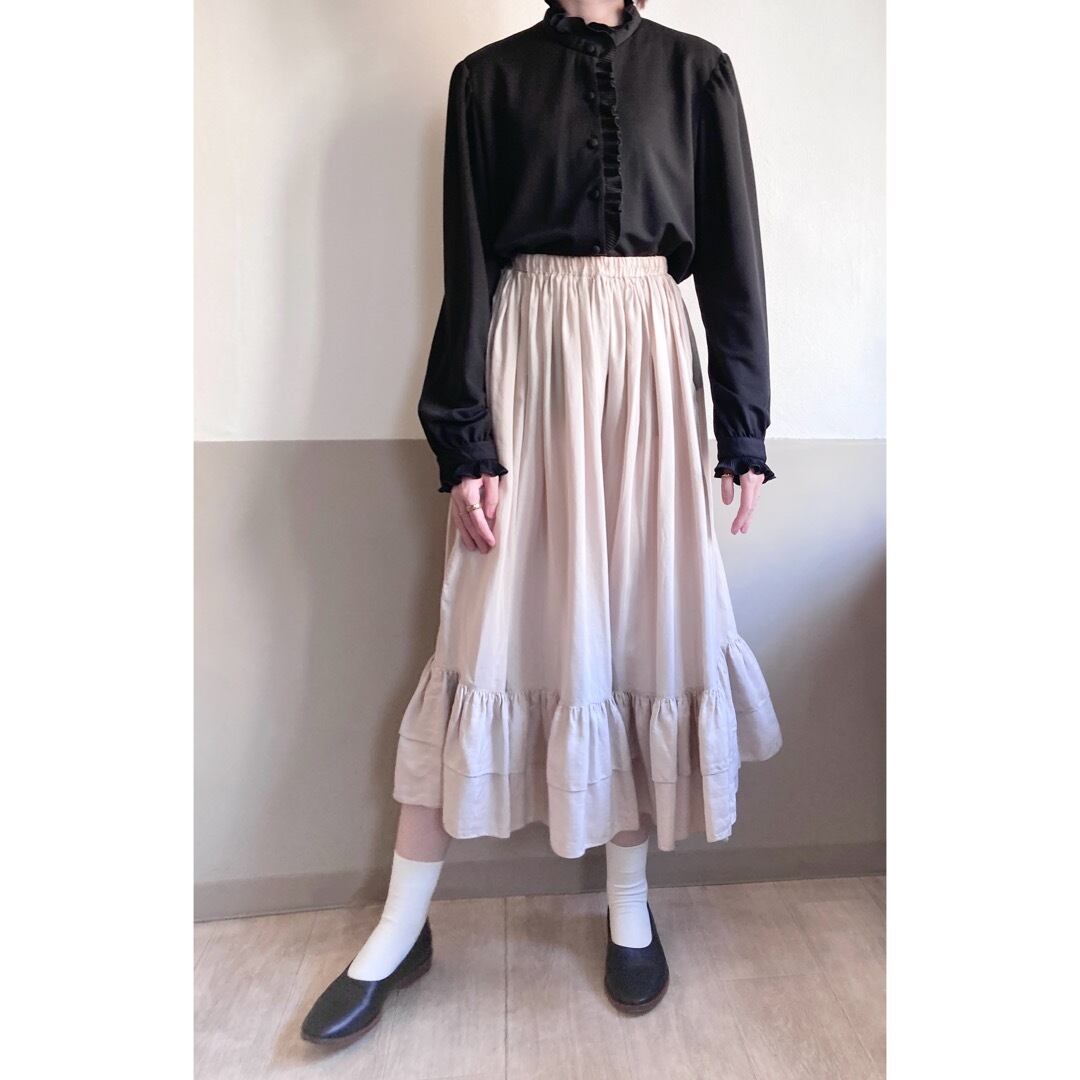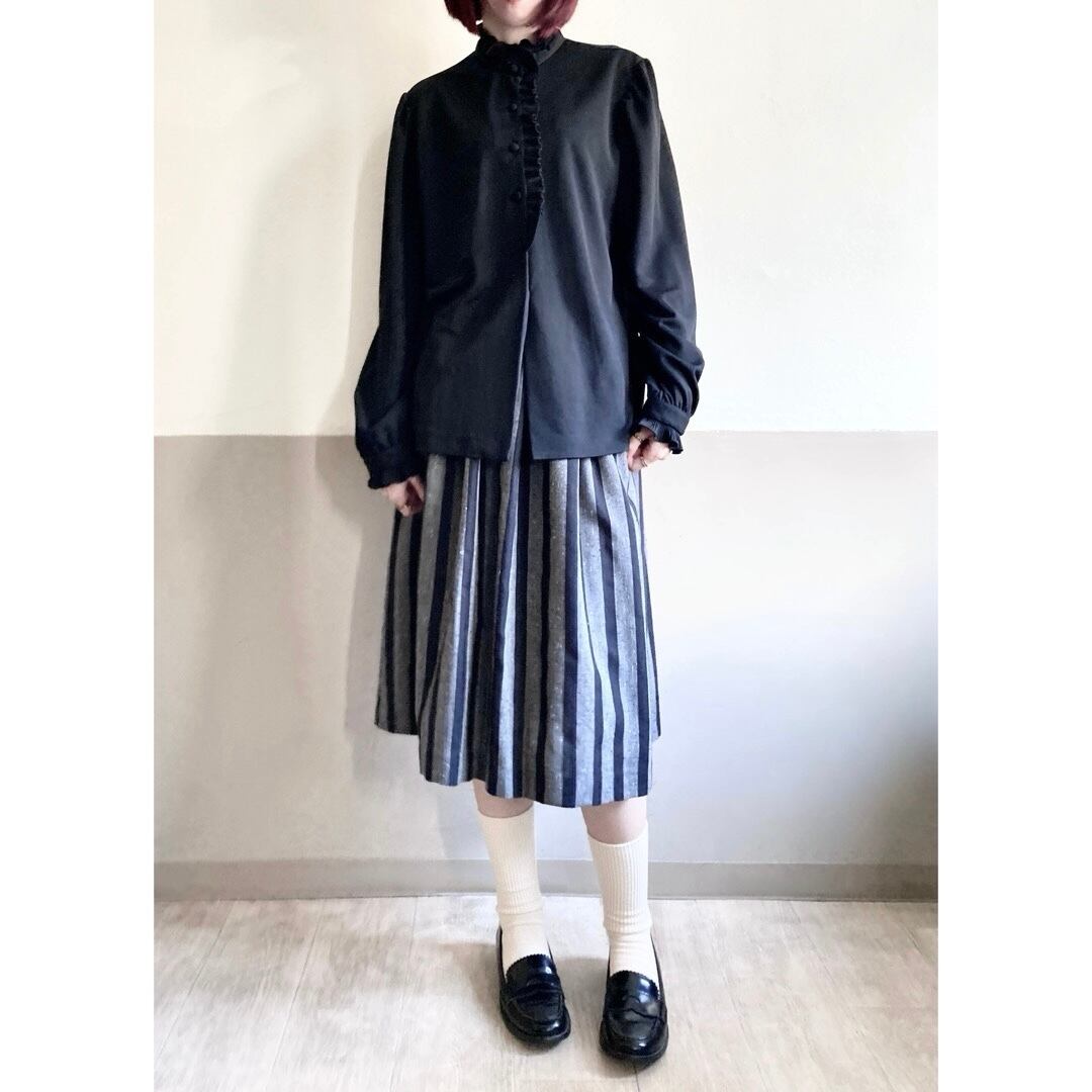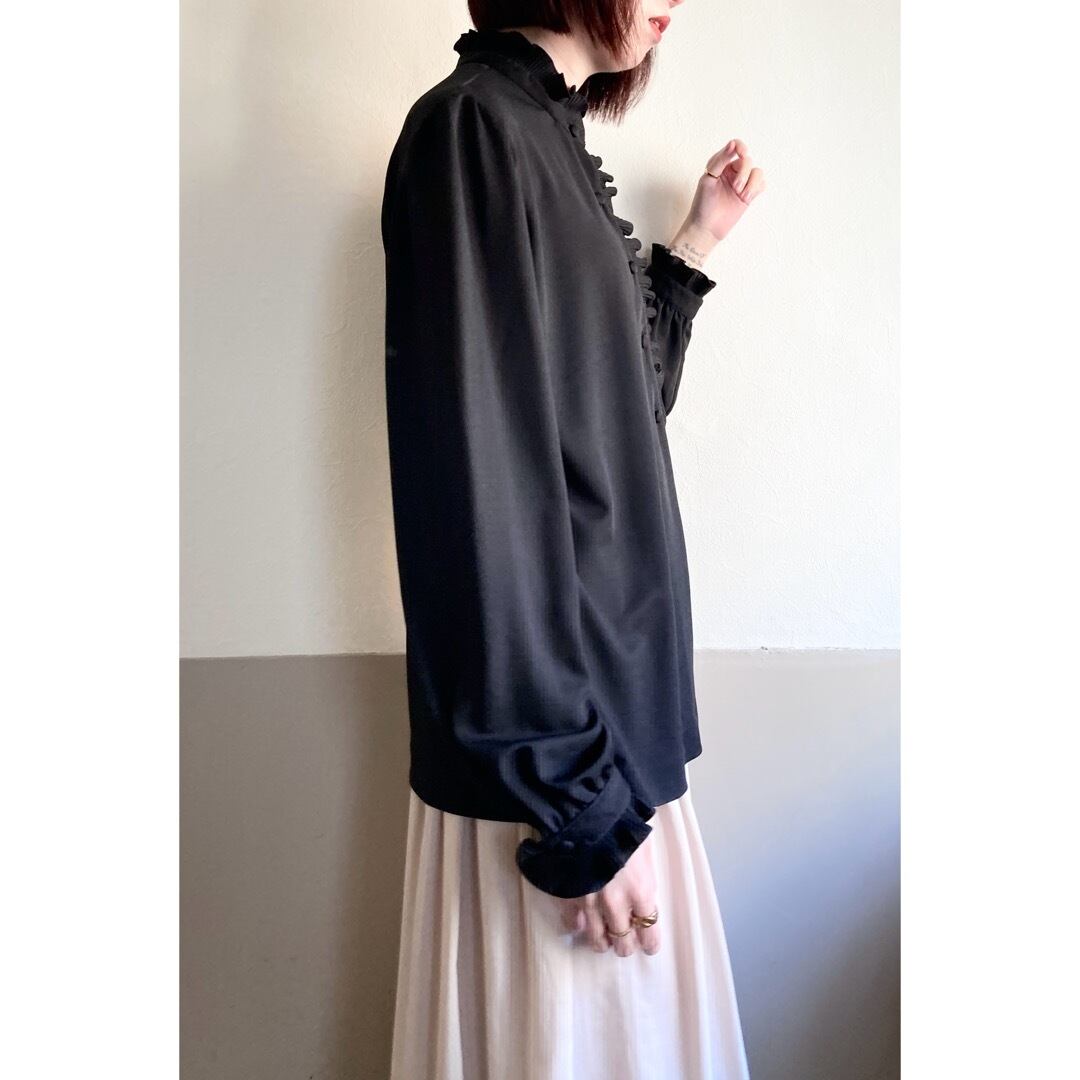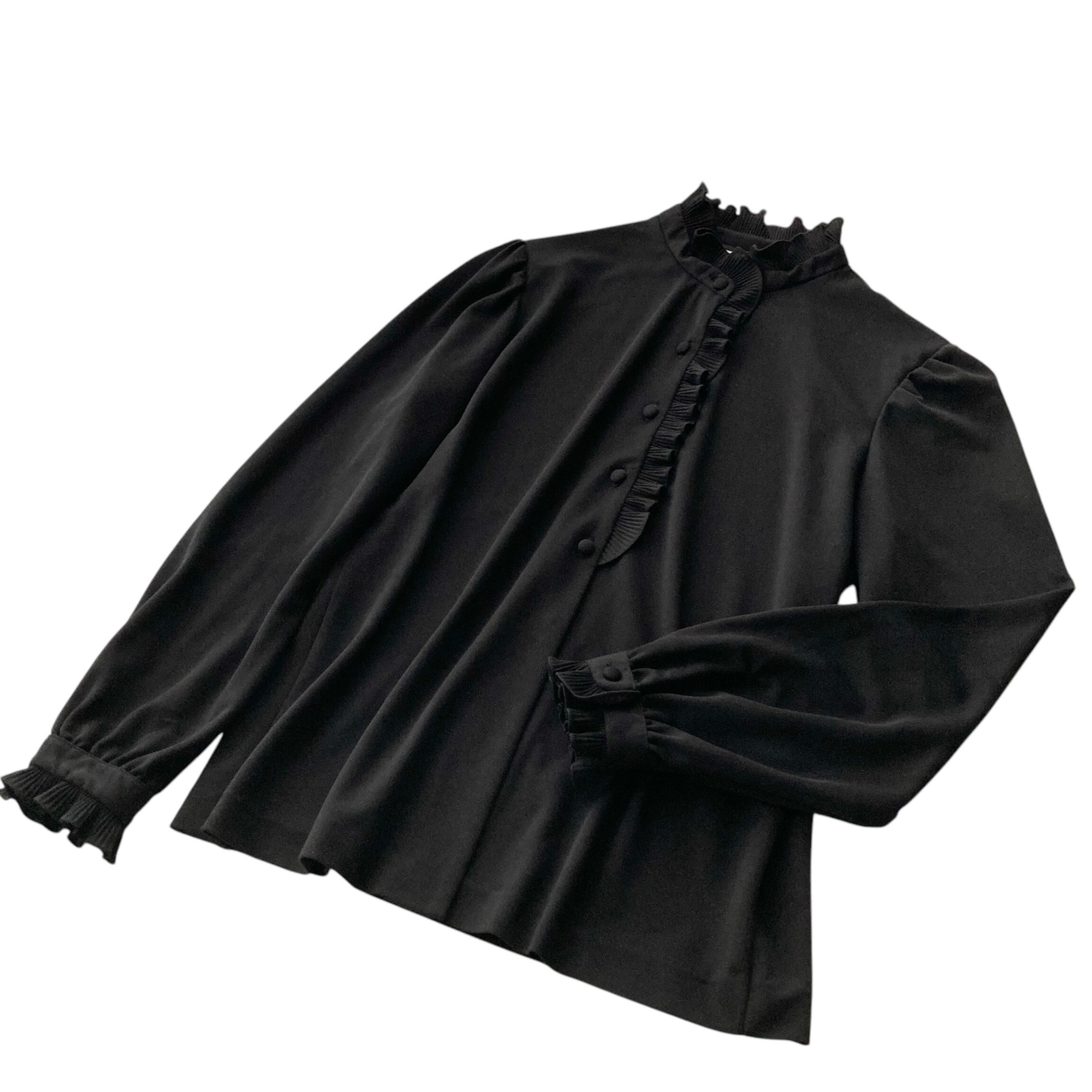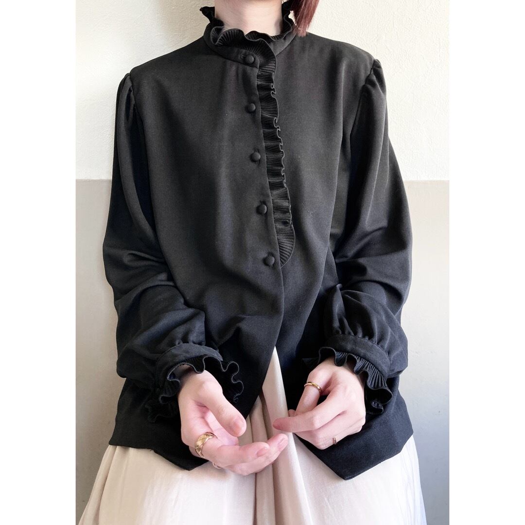 小ぶりなフリルや共布のくるみボタンが上品な印象のブラックブラウス。