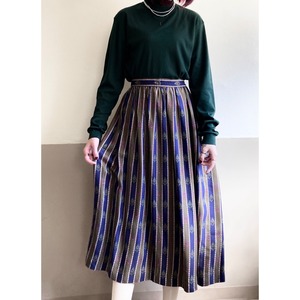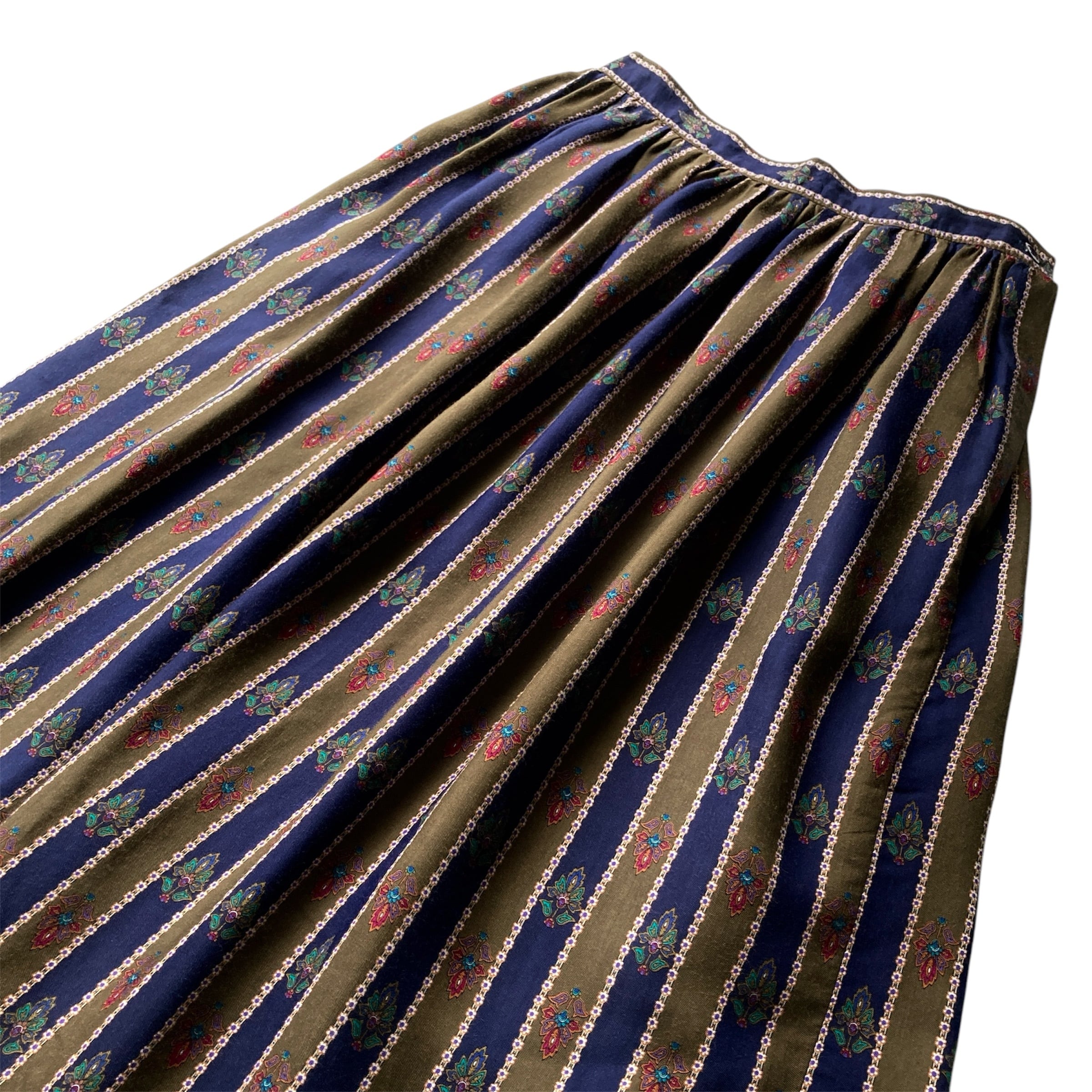 渋いカラーリングのストライプに植物を模したモチーフが散りばめられた、トラッド感あるスカート。