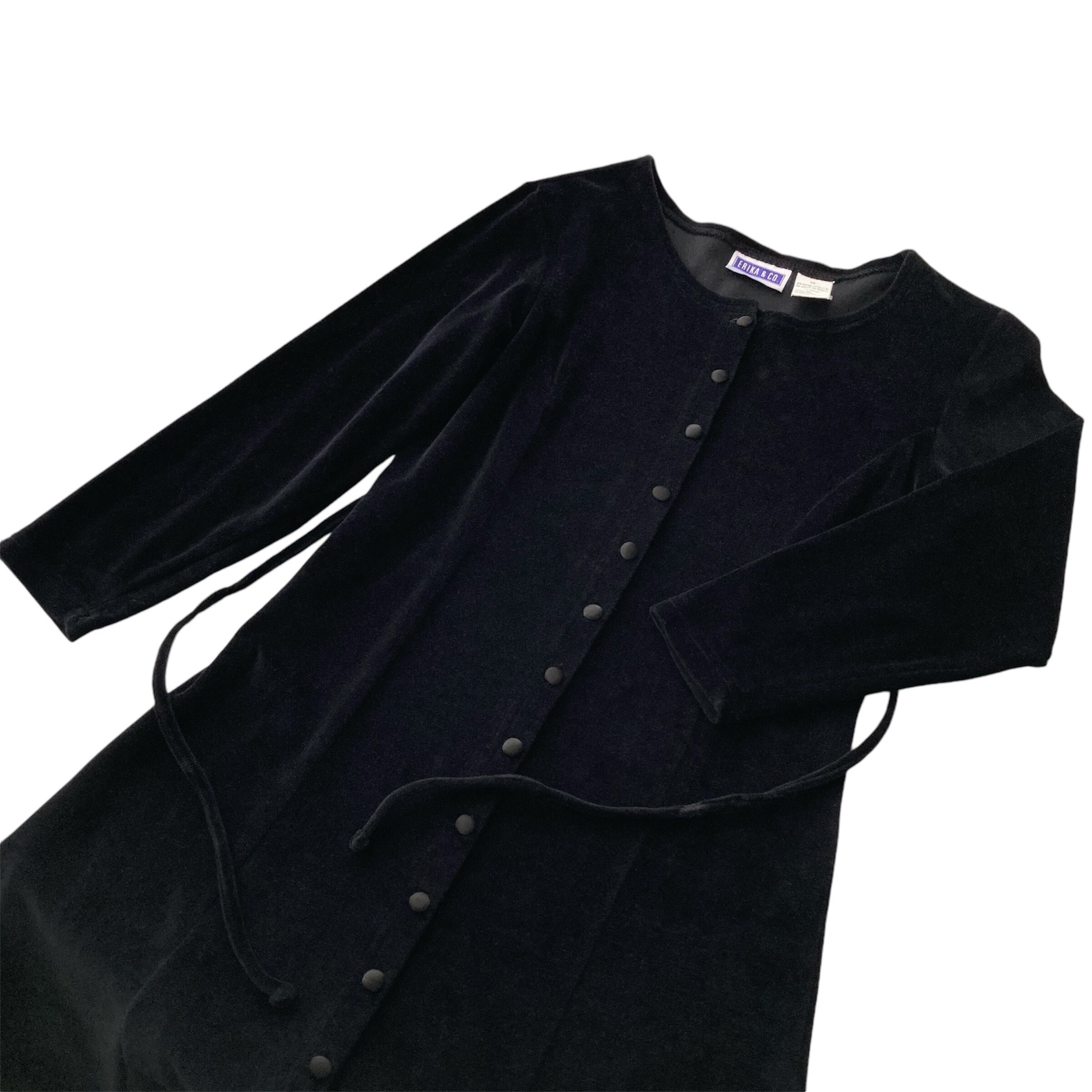 深いブラックのベロアと美しいフレアが印象的なワンピース。