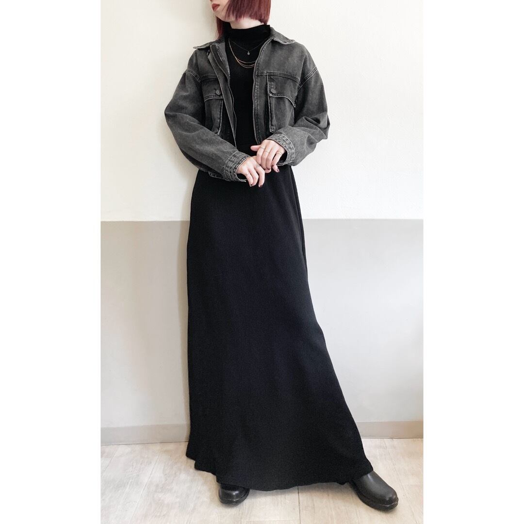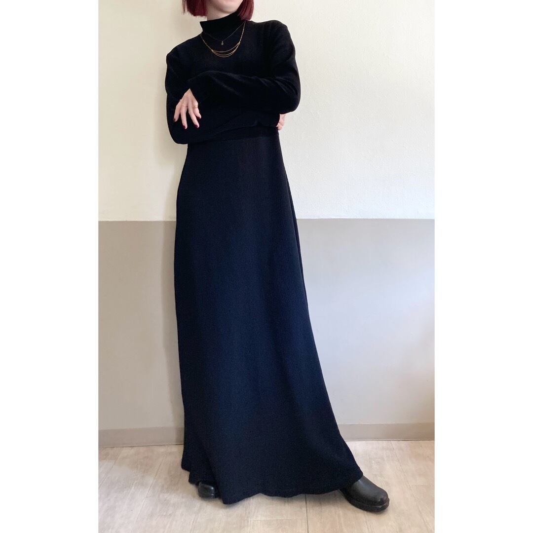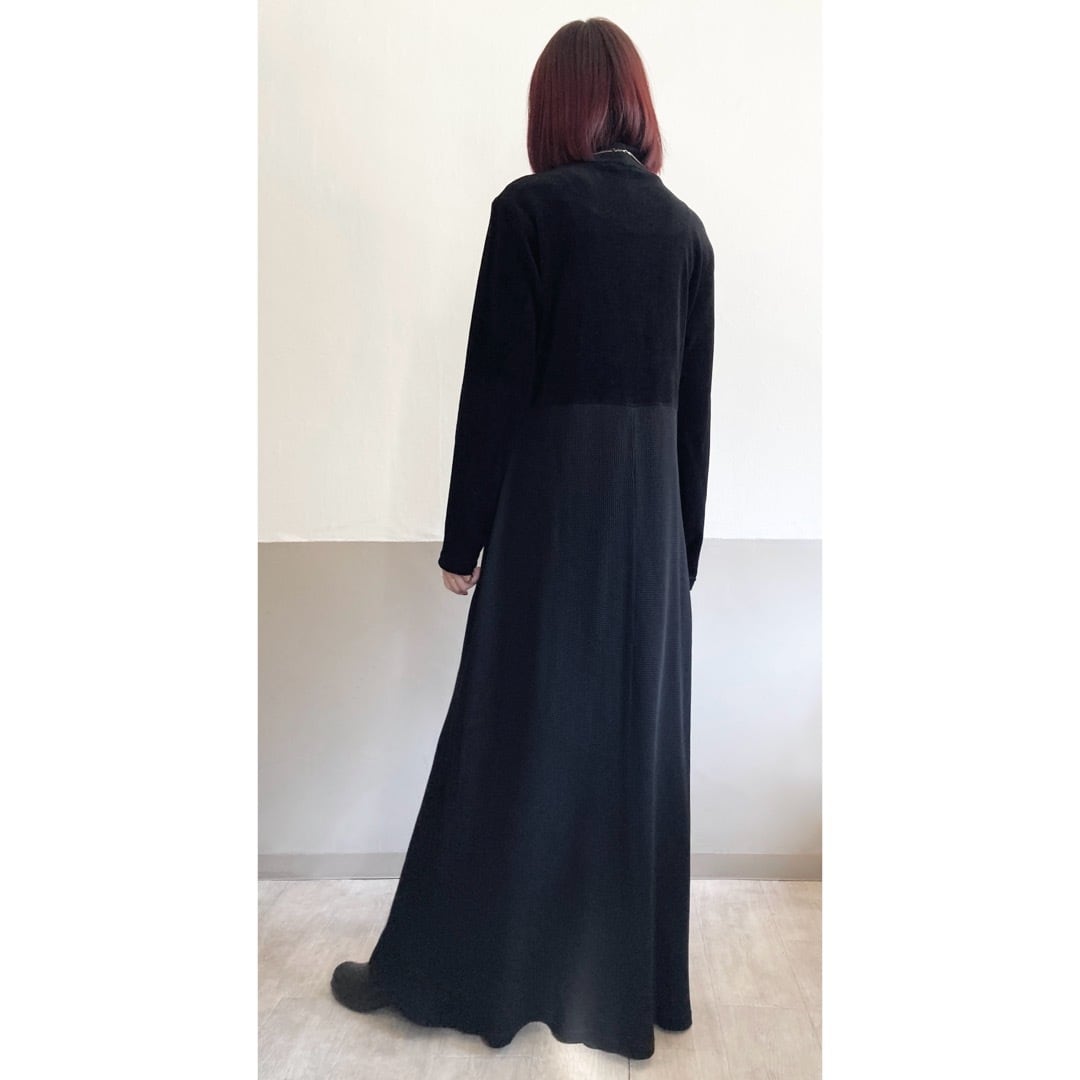 ベロアとサーマルの異素材ニットの組み合わせが珍しいマキシ丈ワンピース。