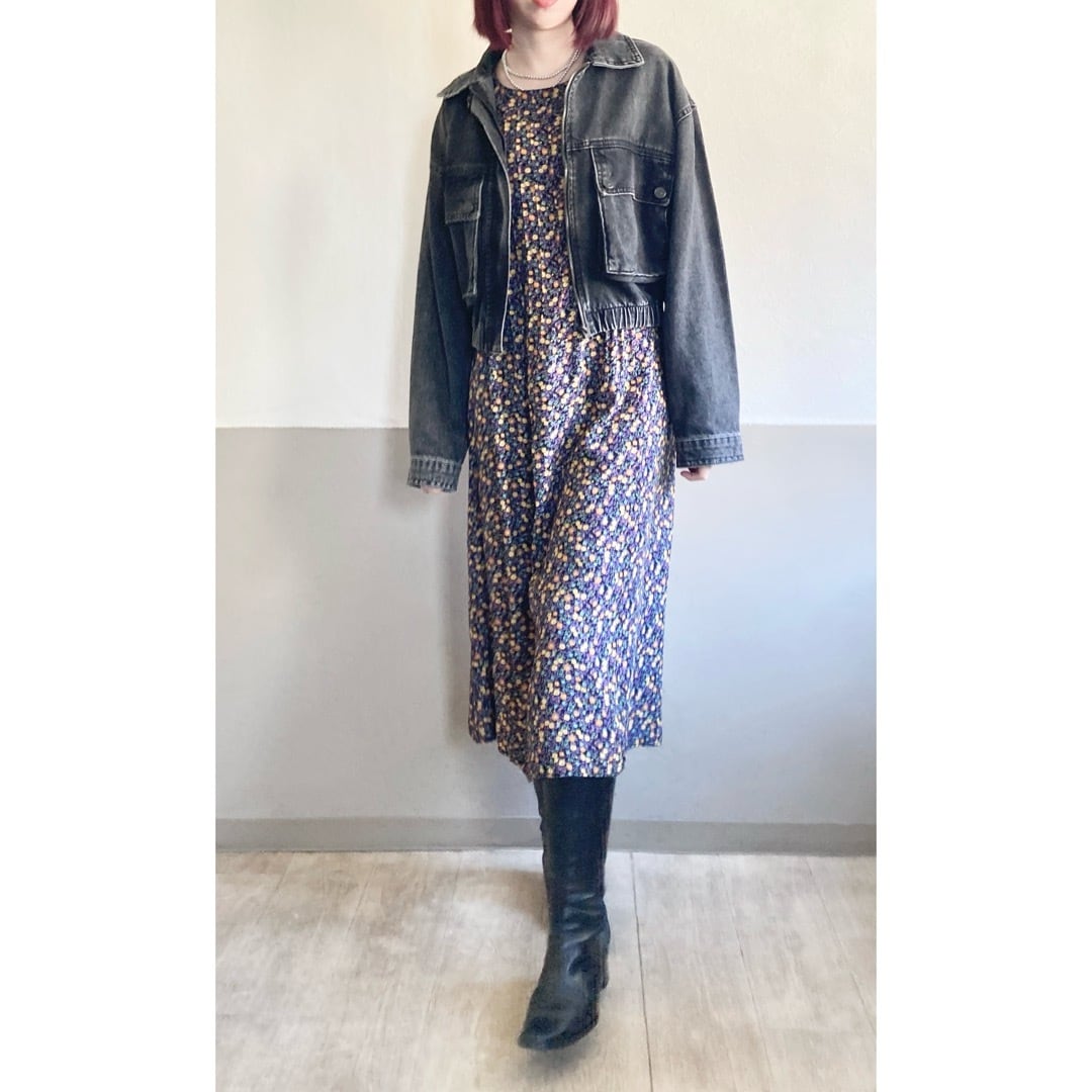 ブラックベースにオレンジ、パープルなどの色使いが特徴的なフラワープリント。